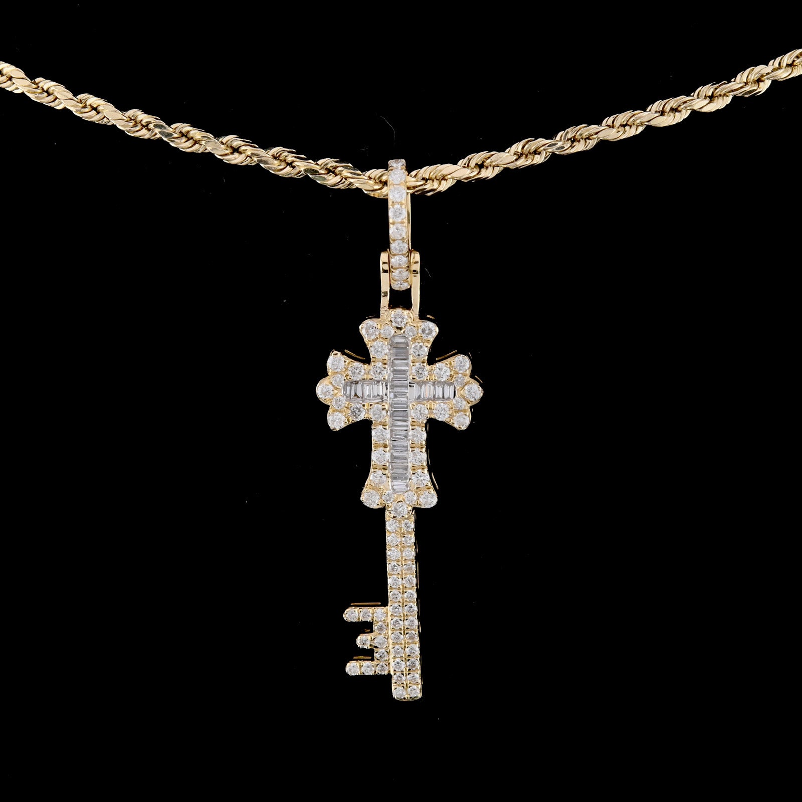 10k Yellow Gold 0.65CT Round/Baguette Diamond Cross & Key Pendant 2.8g Men Charm.