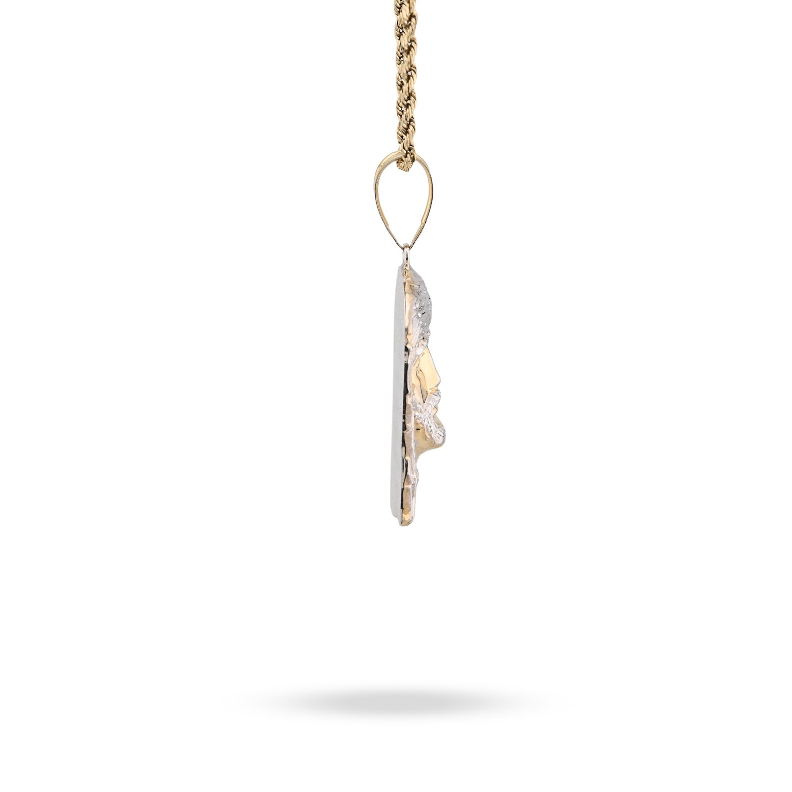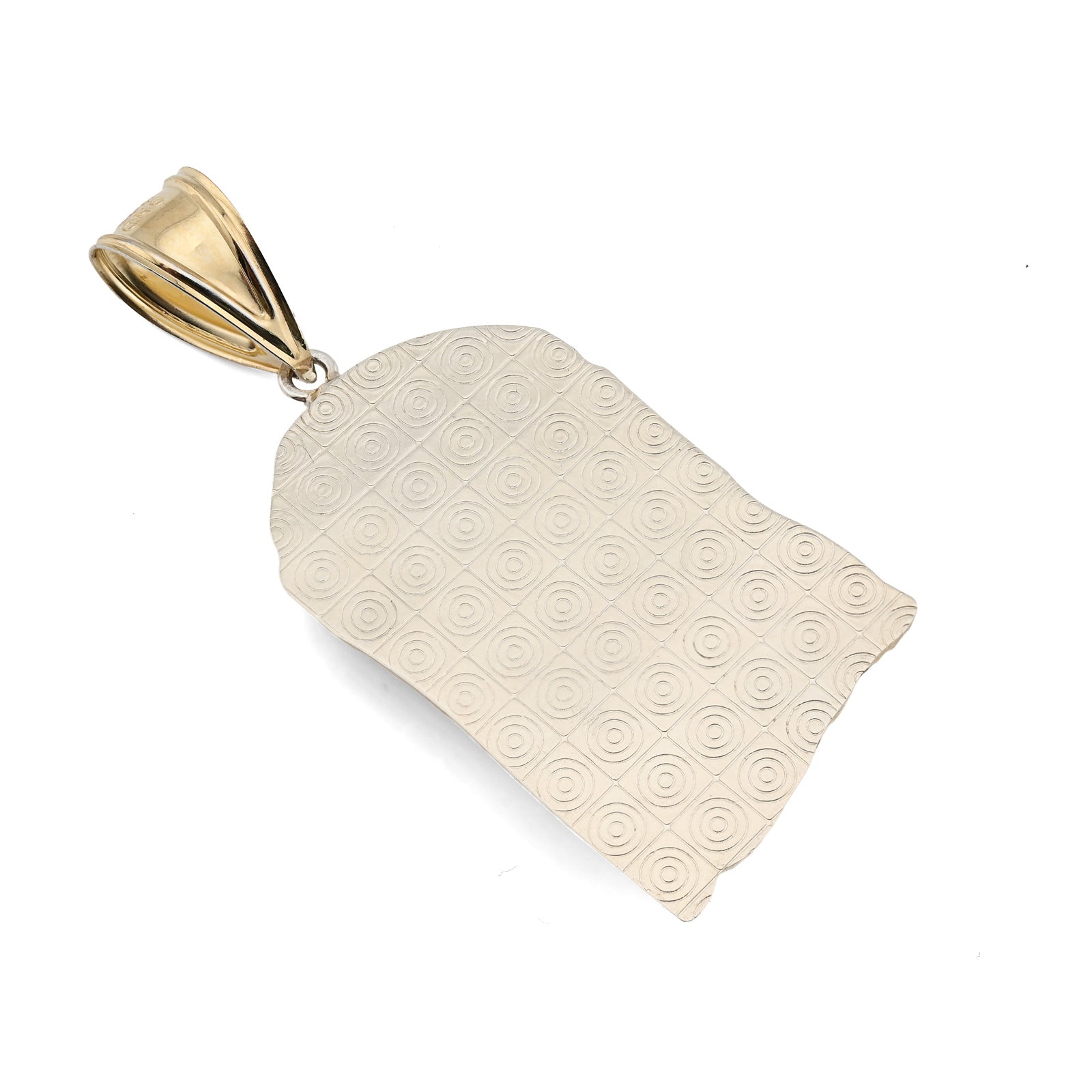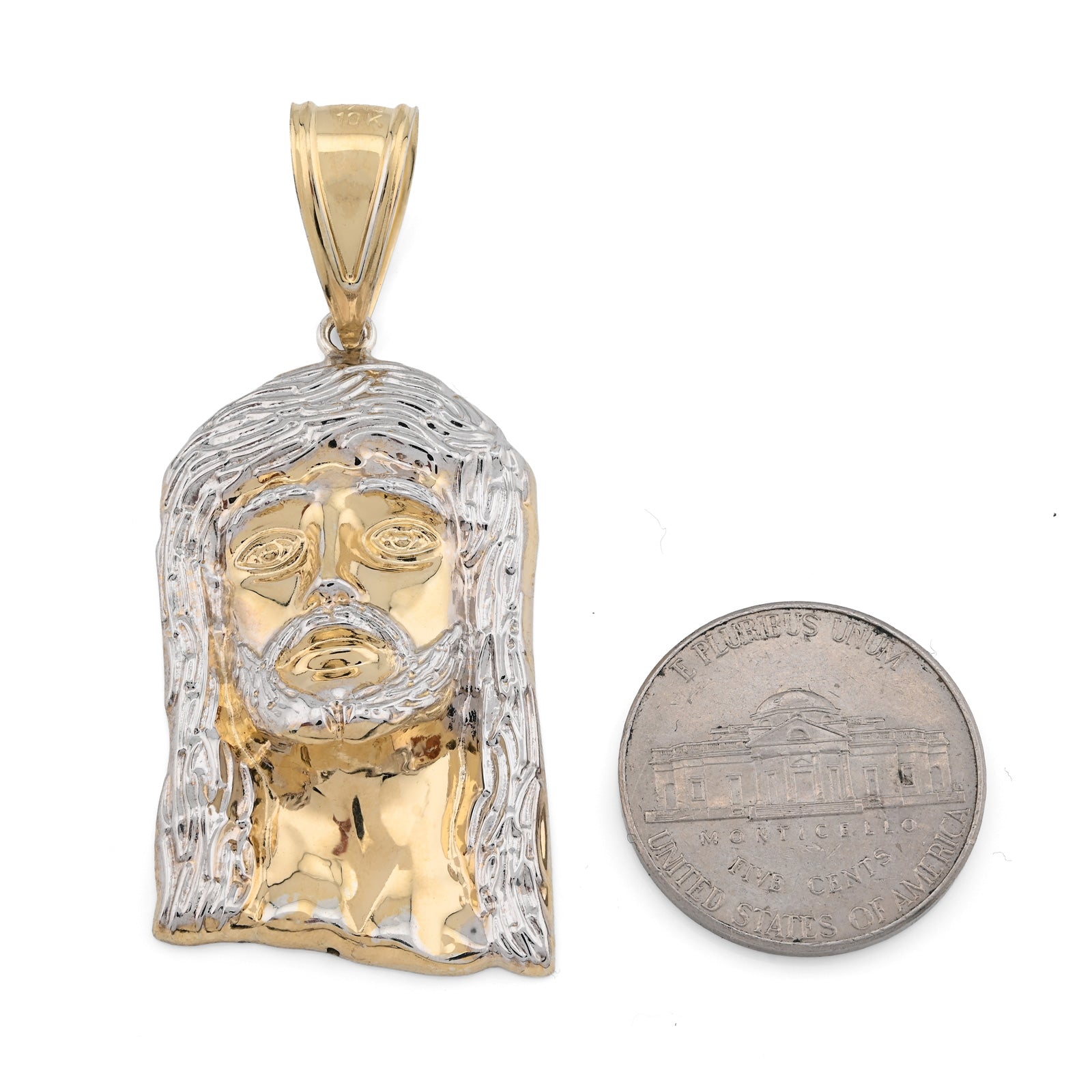 This distinguished pendant features a reverent portrayal of Jesus, rendered in striking two-tone design. Constructed from 925 sterling silver with 1/10th 10k gold bonding, it showcases exceptional craftsmanship and lasting quality. At 4.3 grams, the piece maintains an ideal balance of presence and wearability for everyday devotion. The detailed facial features demonstrate artistic precision, while the two-tone finish adds contemporary elegance to this classic religious motif. Perfect for men seeking a meaningful accessory that reflects their faith with understated sophistication and enduring style.