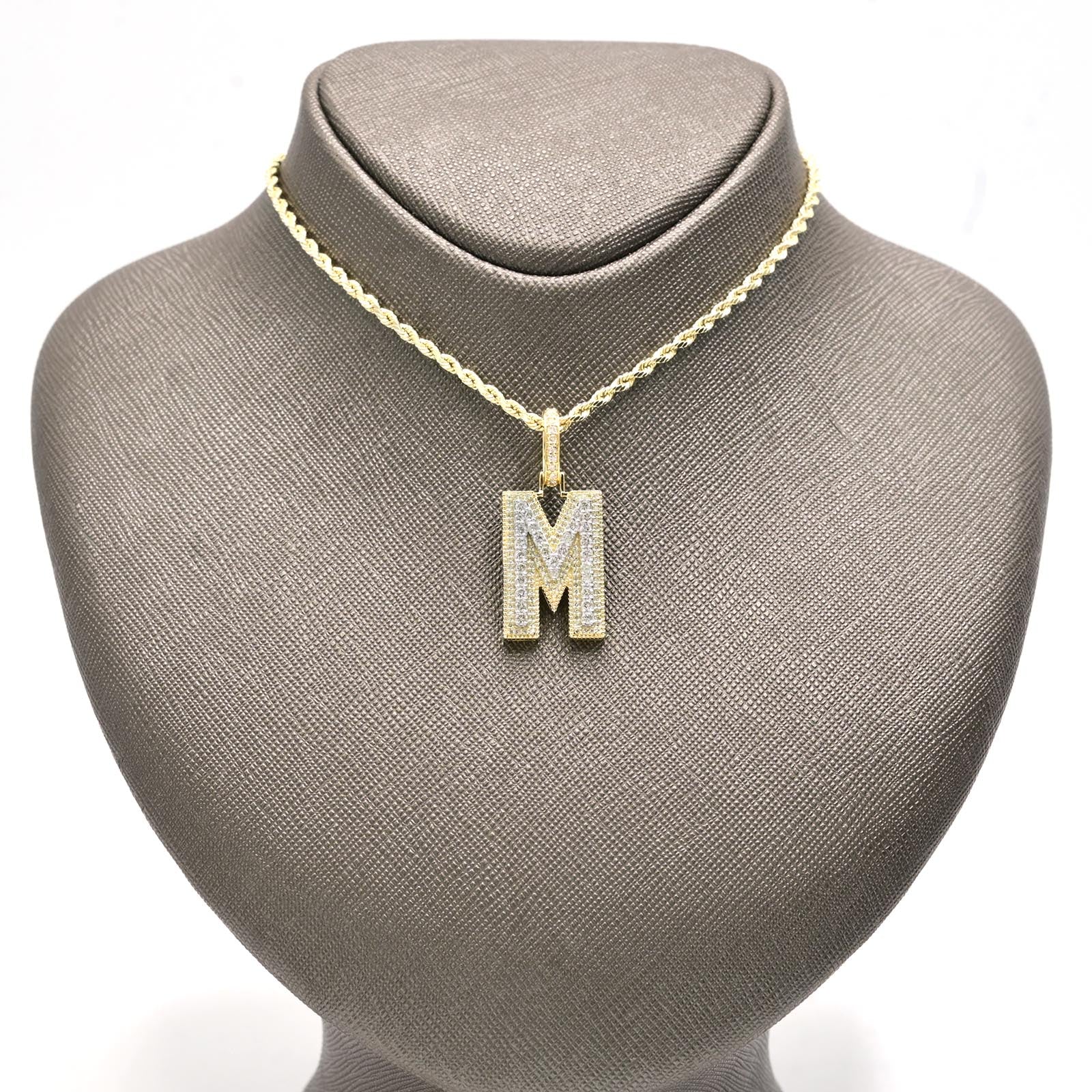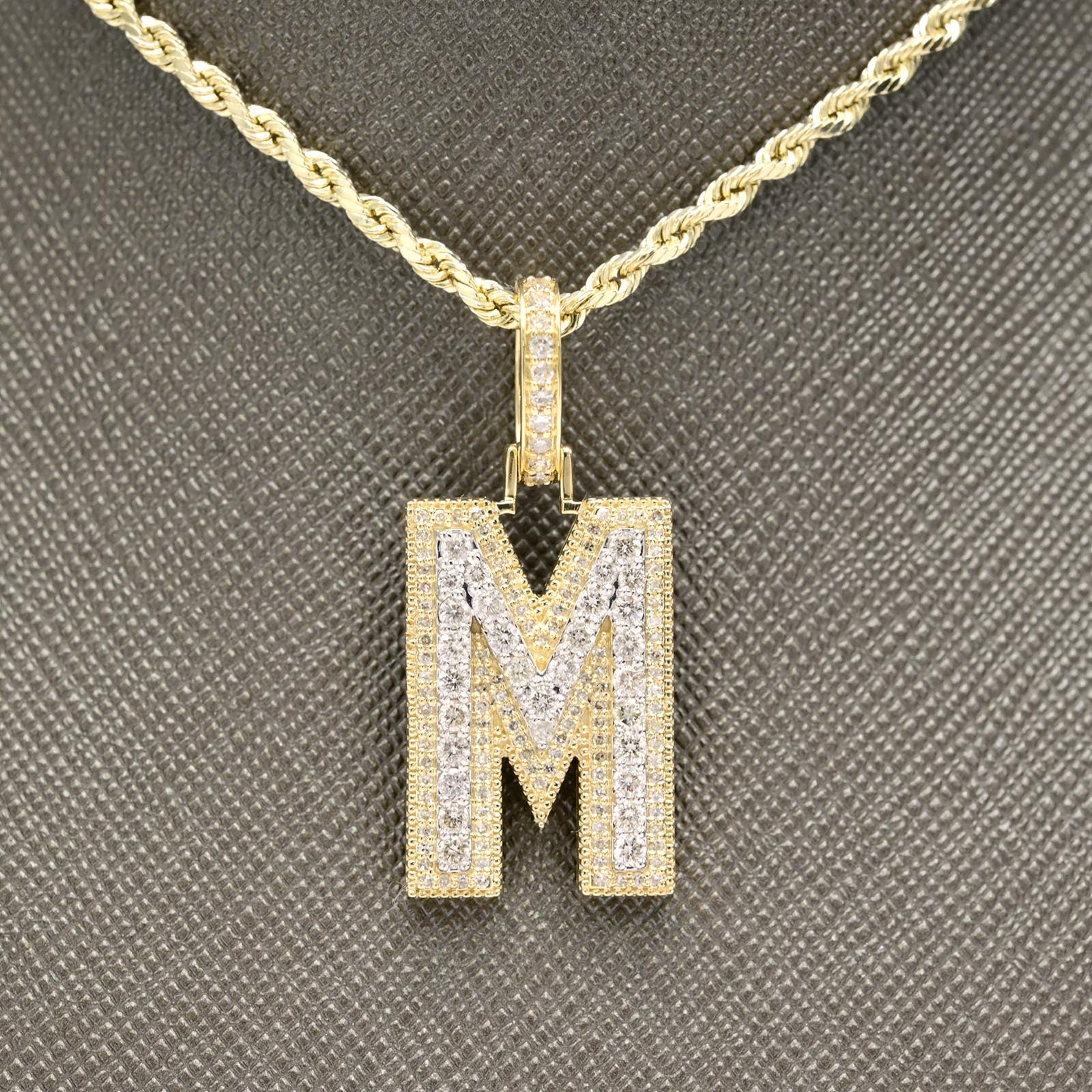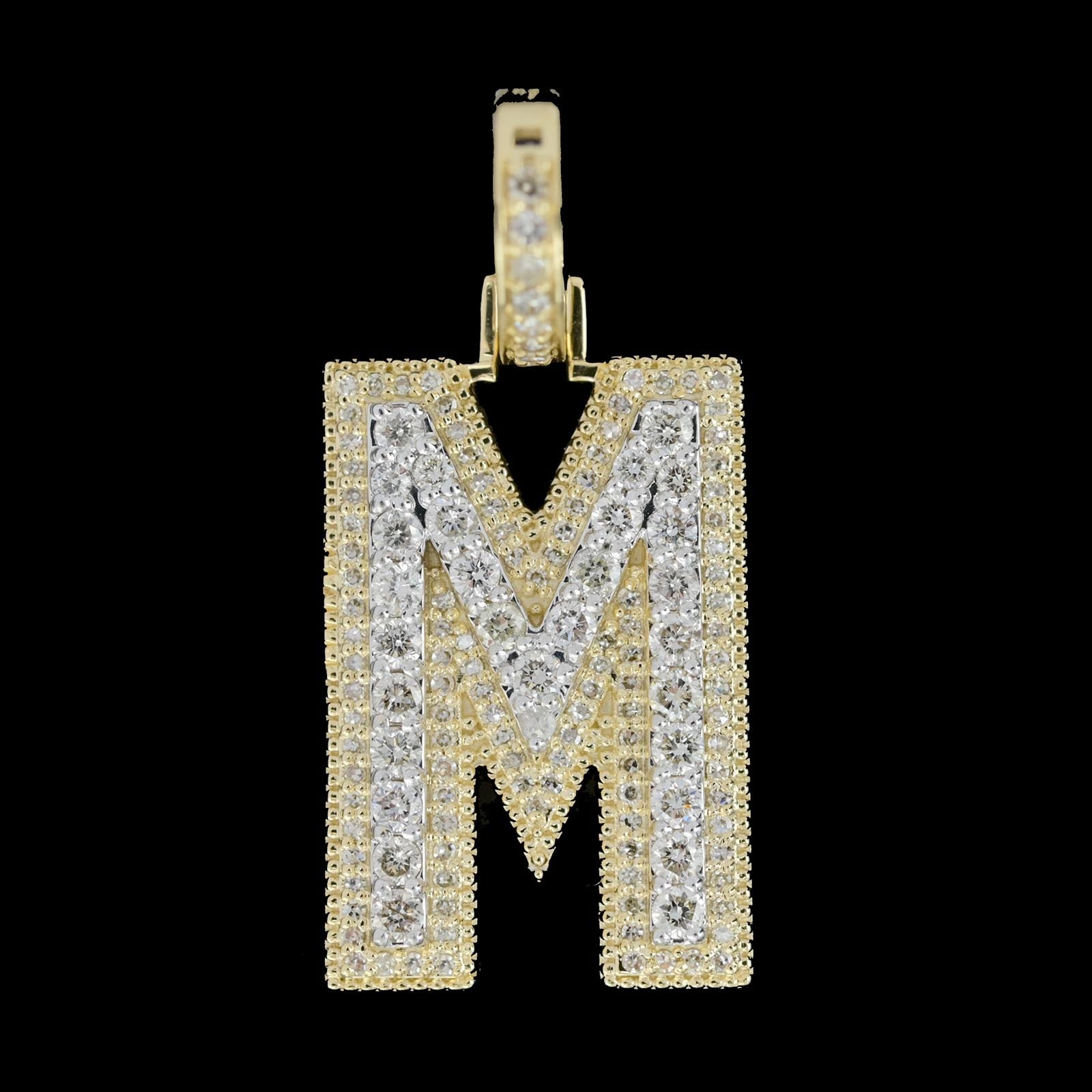 Crafted in 10k yellow gold, this 3D pendant features the letter "M" adorned with a total of 1.1 carats of natural diamonds. The design combines intricate craftsmanship with a bold, dimensional style, making it a sophisticated and personalized accessory. Perfect for adding a touch of elegance and individuality to any jewelry collection.