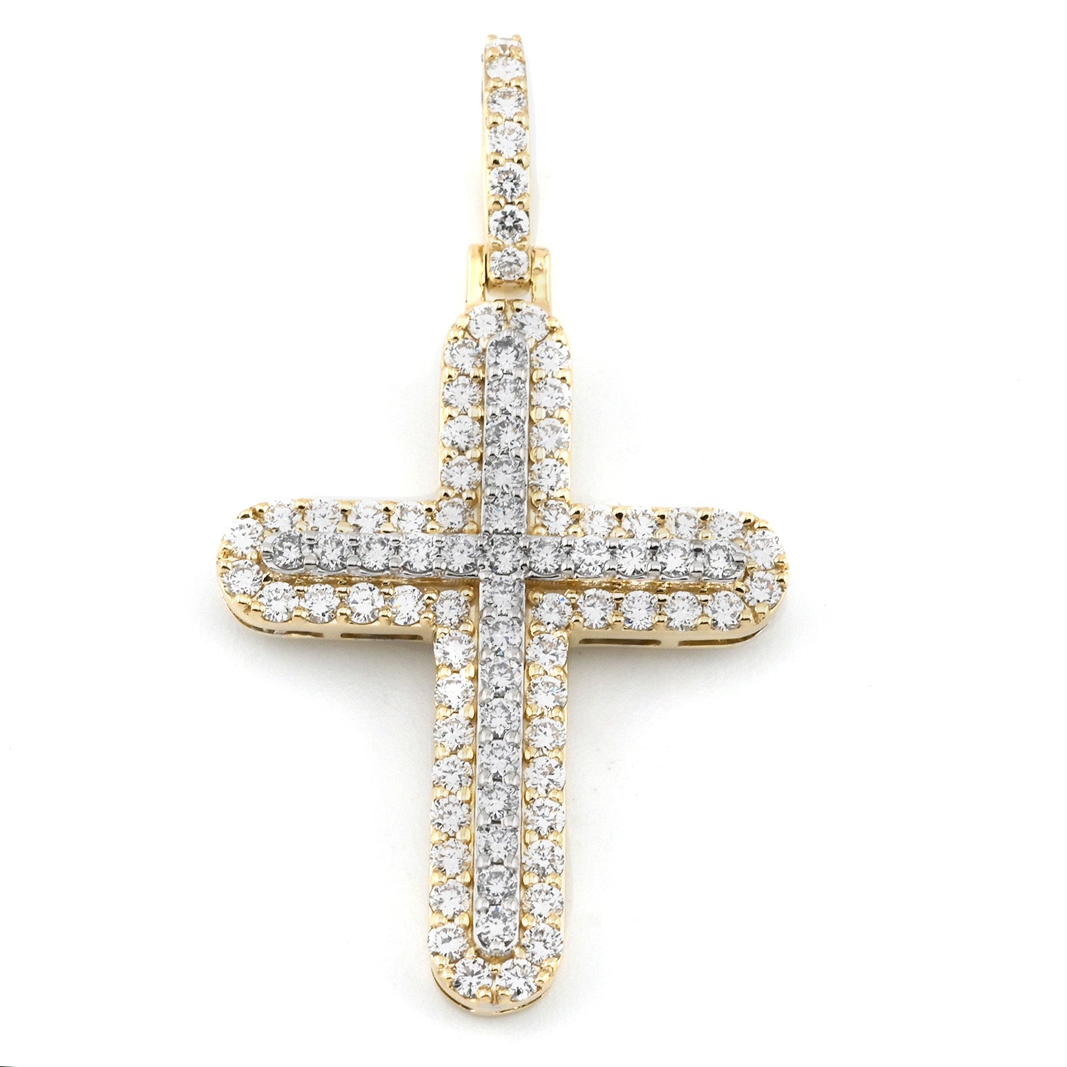 This 10k yellow gold cross pendant features 1.8 carats of lab-grown diamonds, expertly set to highlight their brilliance and clarity. Weighing 5 grams, this men's religious charm offers a substantial yet elegant presence, combining durability with refined craftsmanship. A meaningful accessory that complements both casual and formal attire with timeless style.