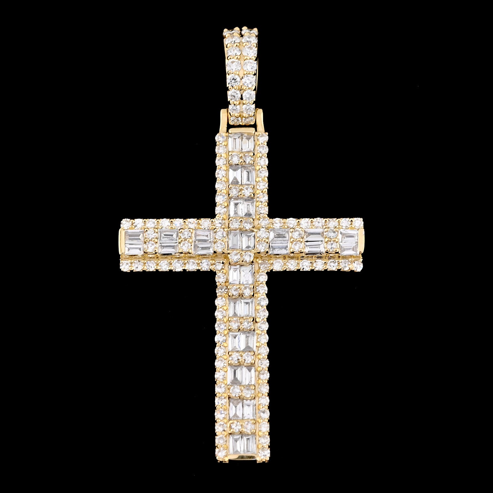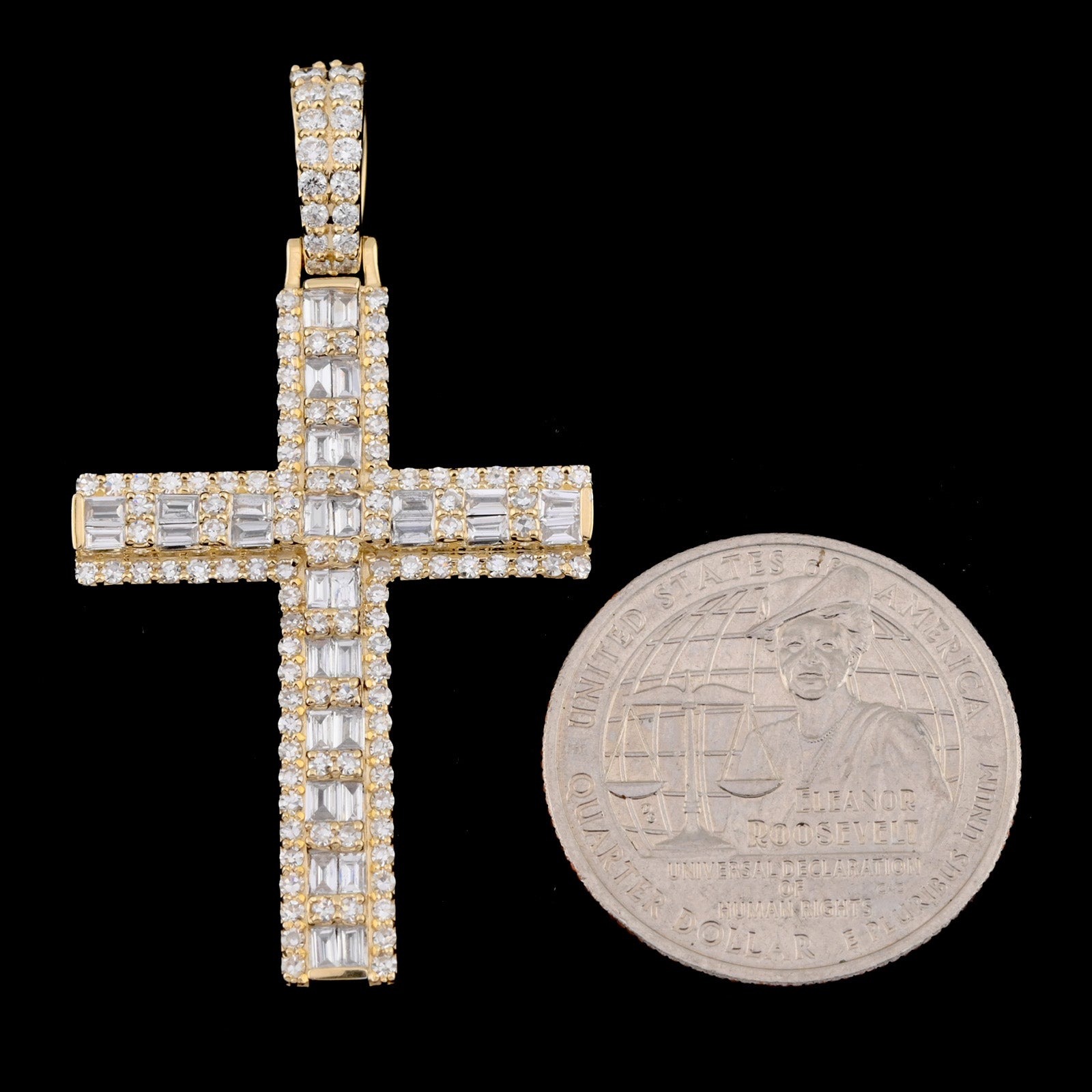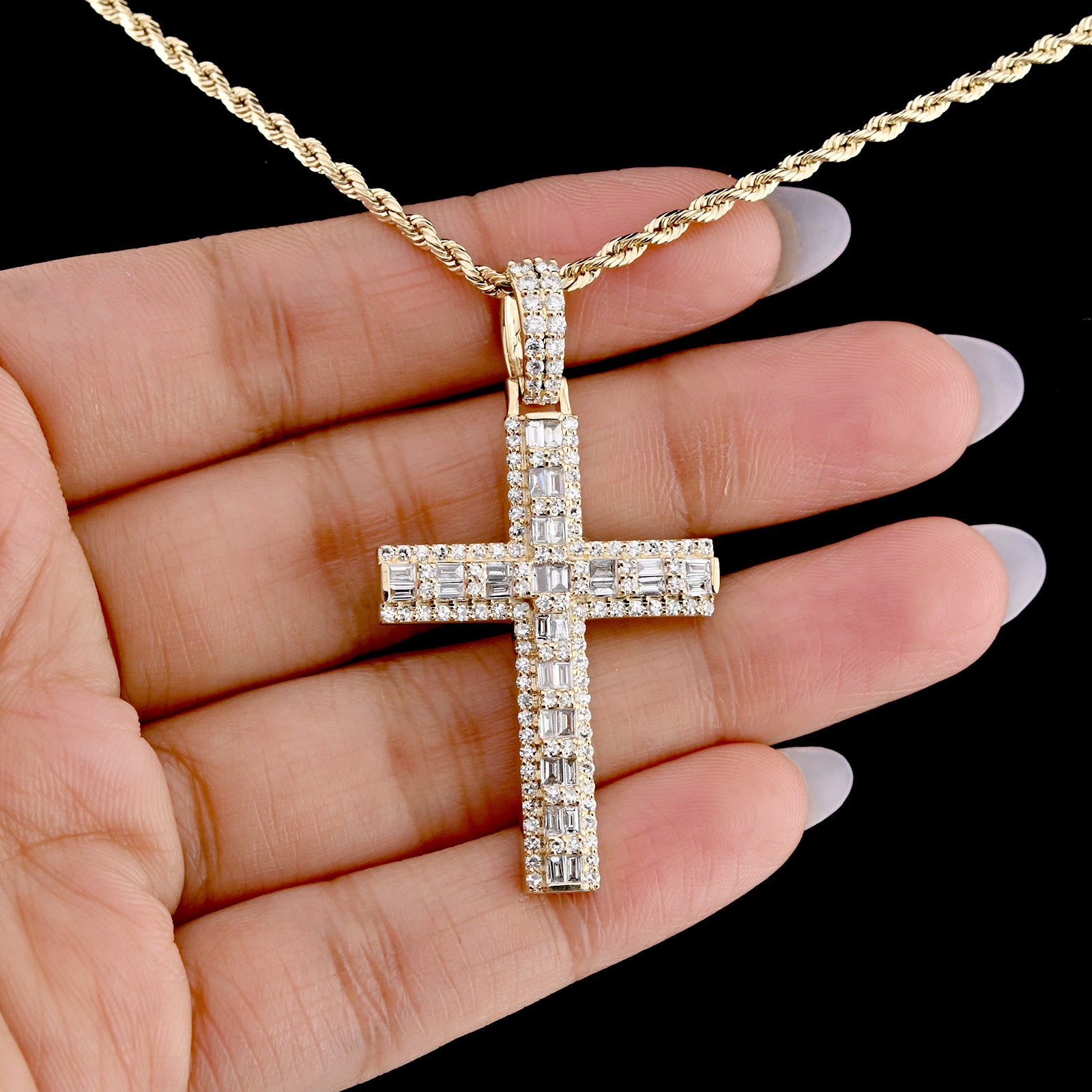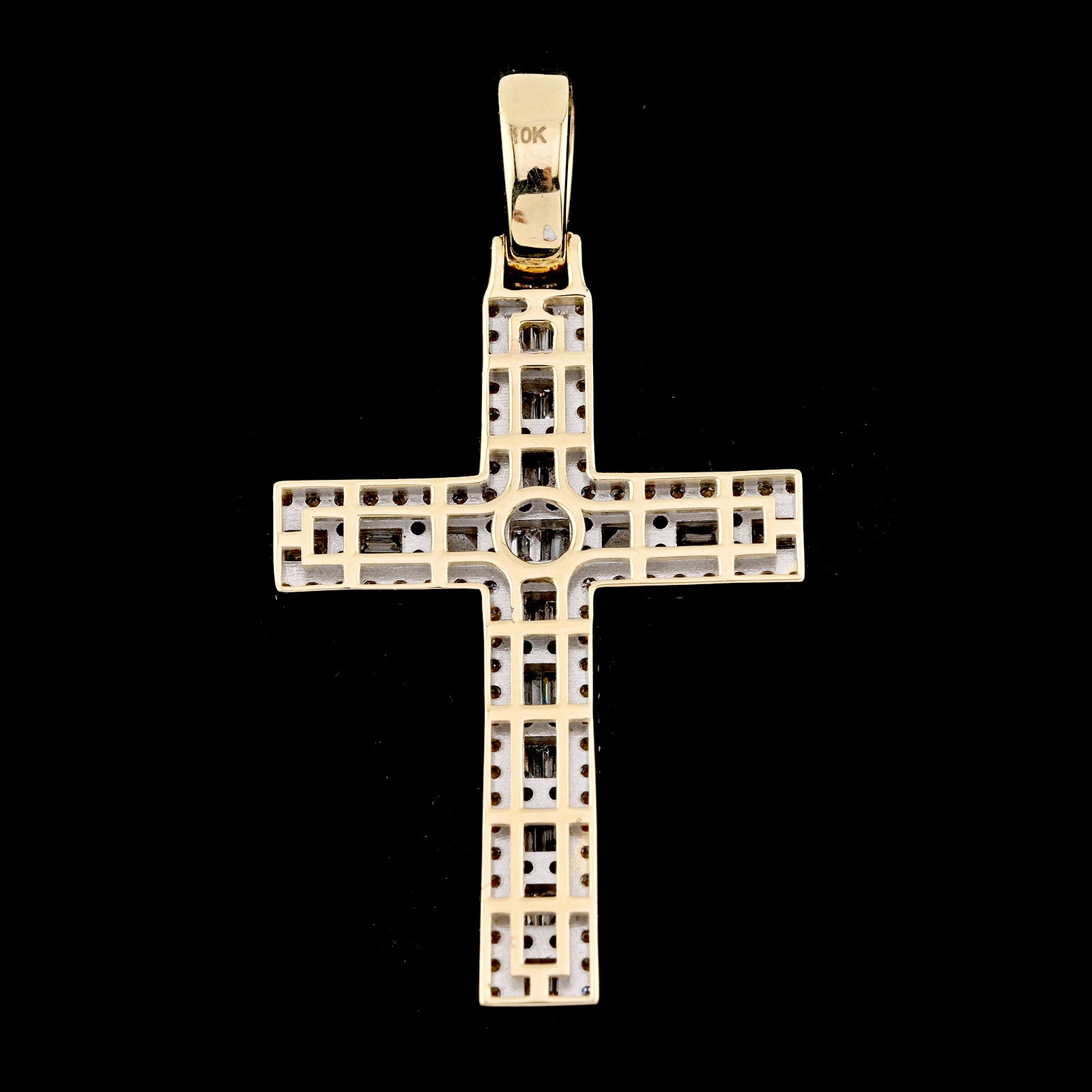 This 10k yellow gold cross pendant showcases a brilliant 1.8-carat total weight of lab-grown diamonds in round and baguette cuts, expertly arranged to enhance light reflection and brilliance. Weighing 6.1 grams, the pendant offers a balanced and luxurious feel, combining ethical diamond sourcing with timeless design suitable for both everyday wear and special occasions.