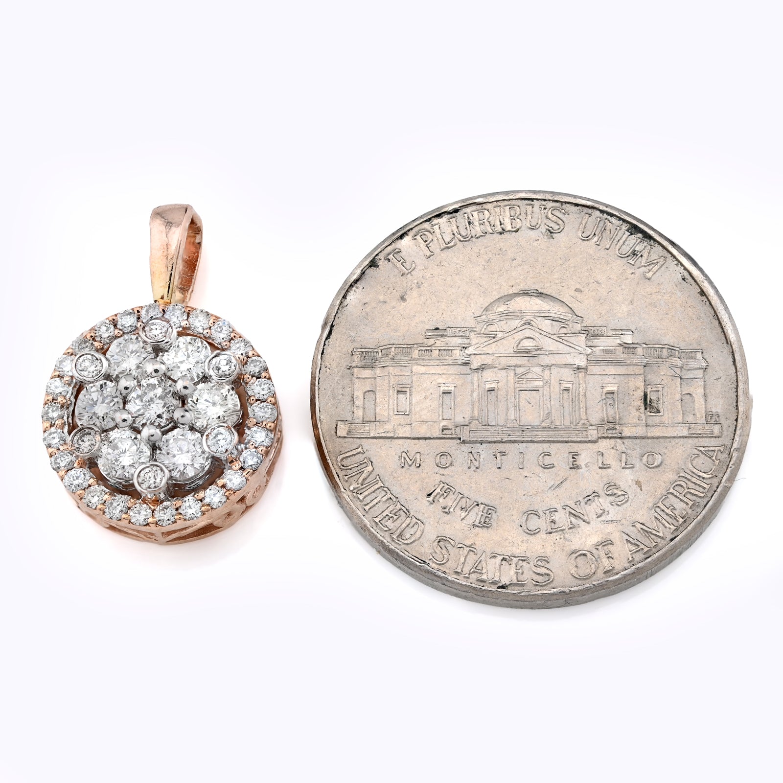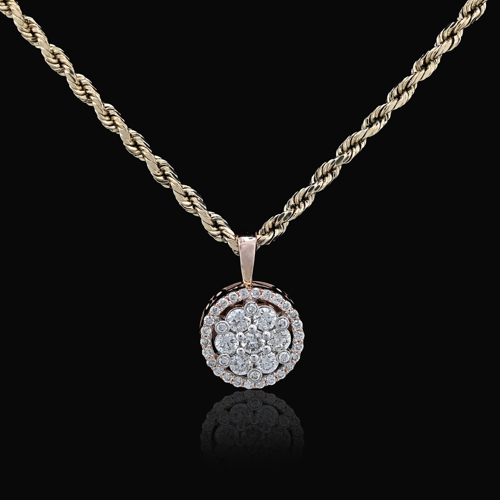 Radiant femininity shines through this stunning 10k rose gold pendant, where one carat of natural diamonds bloom in an intricate flower cluster design. The romantic blush tone of rose gold complements the sparkling arrangement, creating a piece that captures both delicate beauty and substantial presence. At just 1.6 grams, this lightweight charm offers impressive visual impact without compromising comfort for everyday wear. Perfect for those who appreciate botanical-inspired elegance, this pendant celebrates natural diamonds with refined artistry and timeless appeal.