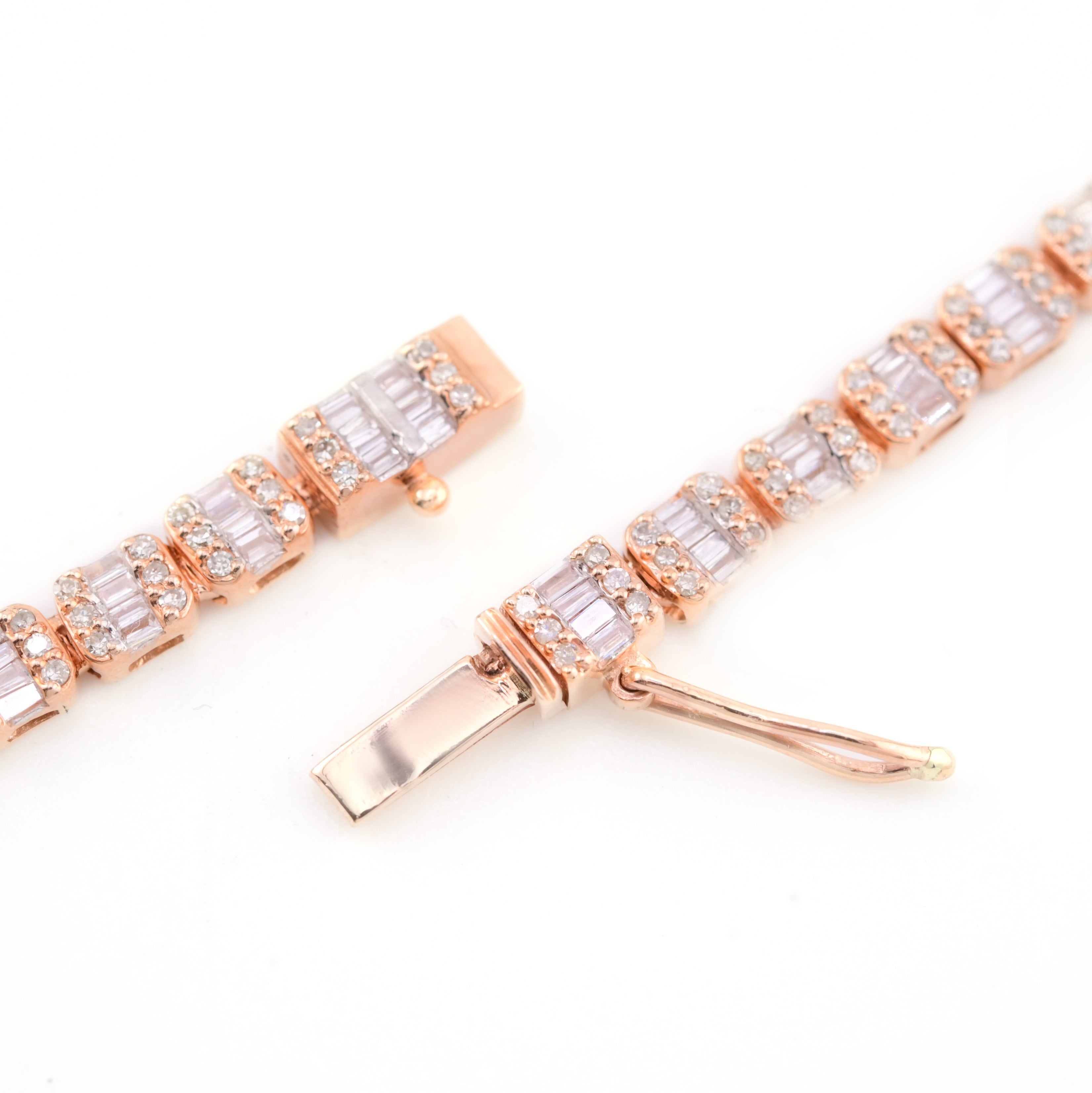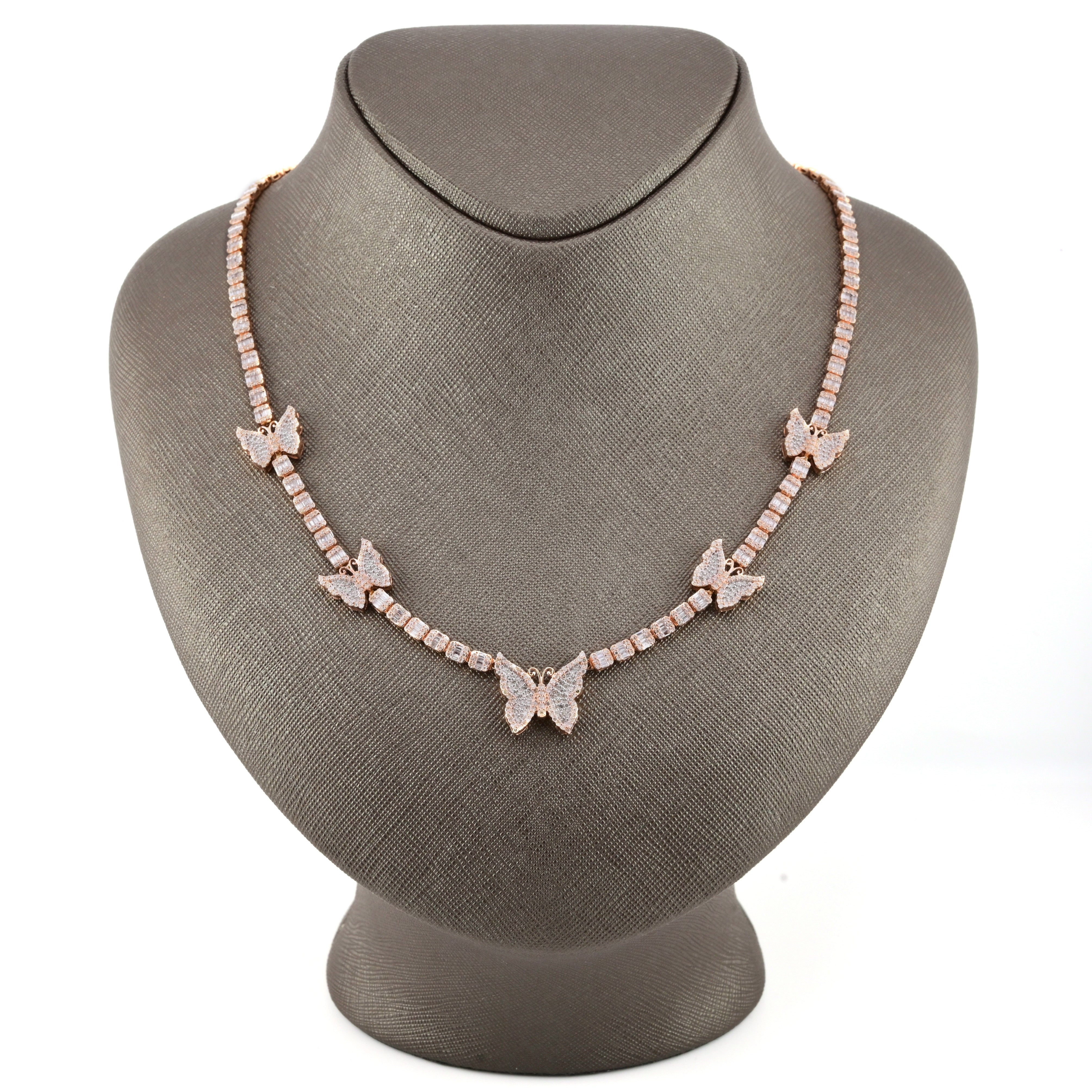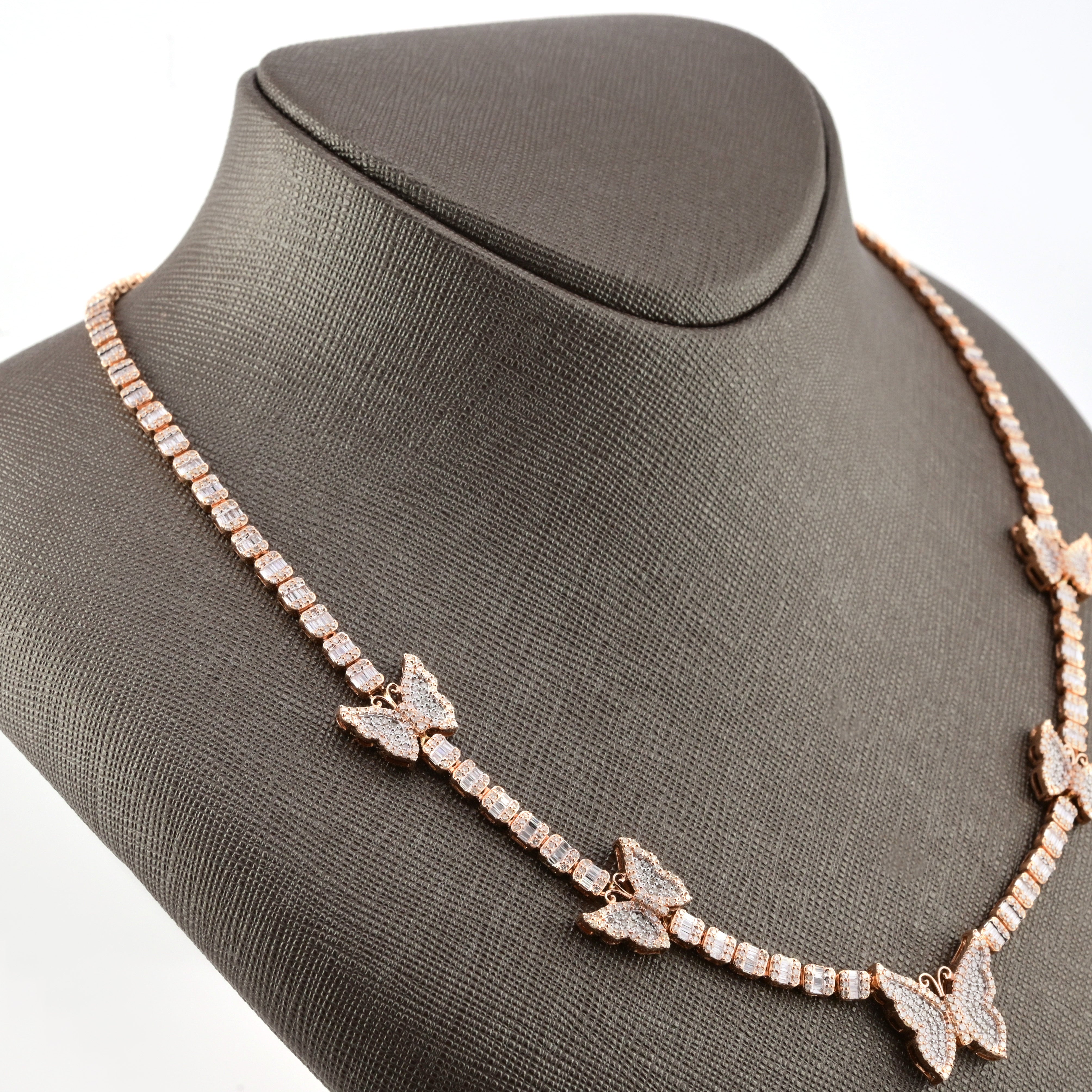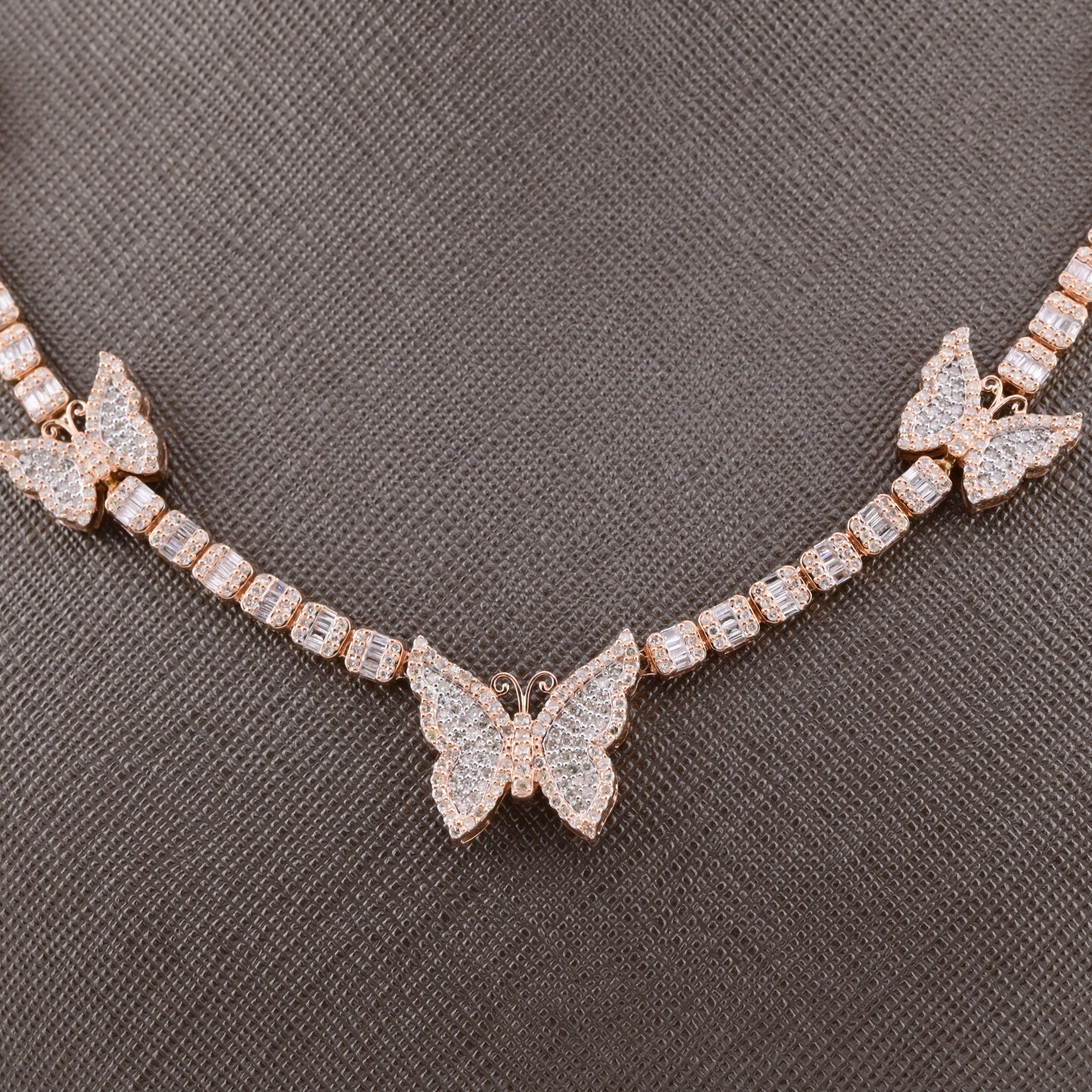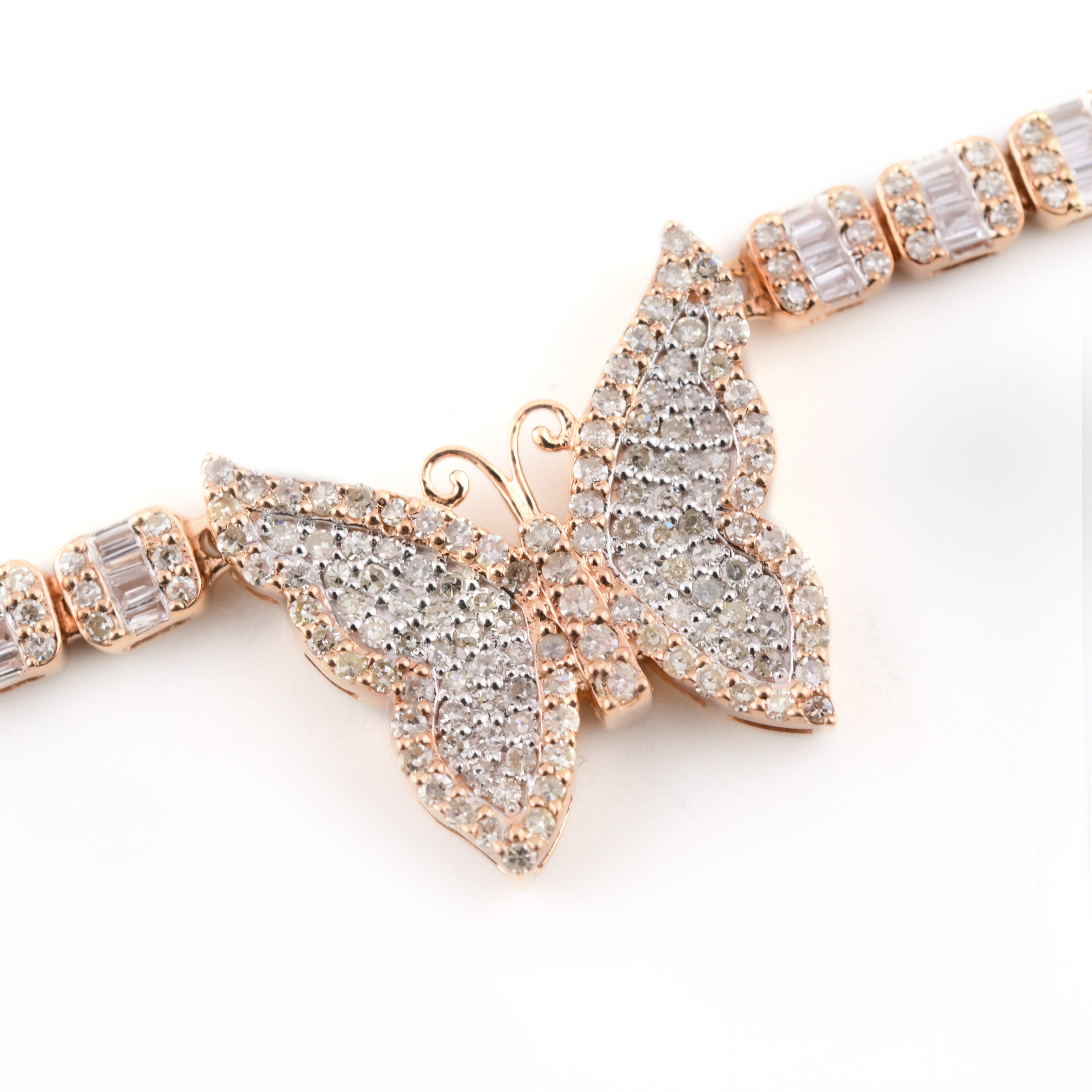This stunning 10k rose gold tennis chain showcases 5.48 carats of baguette-cut diamonds arranged in an enchanting butterfly motif. Weighing 25.4 grams, the 18-inch necklace delivers substantial luxury with refined elegance. The baguette diamonds create a distinctive linear sparkle that catches light with precision, while the rose gold setting adds warmth and contemporary allure. Perfect for those seeking a statement piece that balances boldness with grace, this necklace transitions effortlessly from sophisticated daytime wear to evening glamour. A timeless investment in distinctive jewelry craftsmanship.