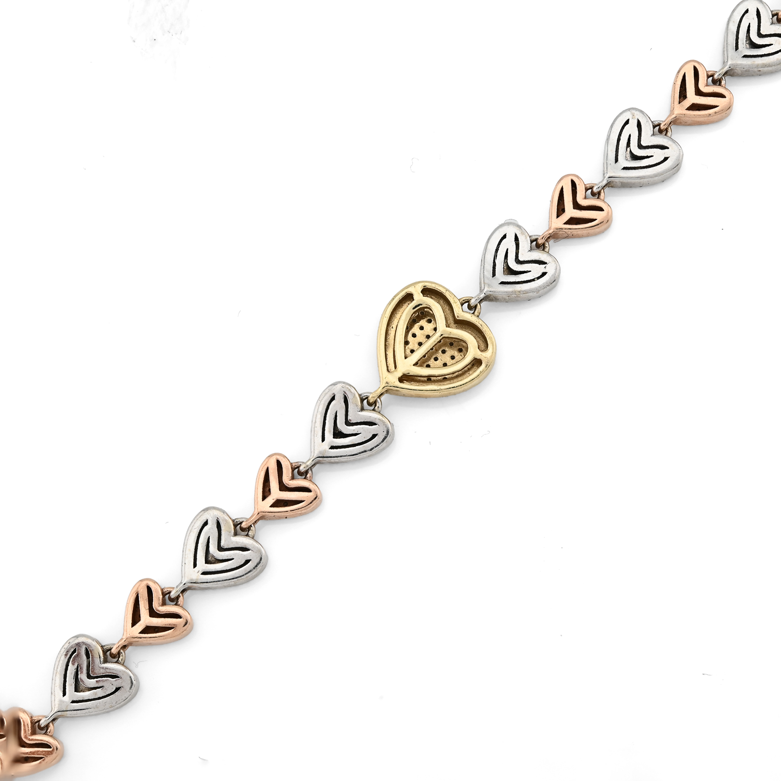 Celebrate timeless romance with this exquisite 10k three-tone gold bracelet, a refined expression of elegance and emotion. The heart-shaped design infuses classic bracelet styling with meaningful symbolism, creating a piece that transcends ordinary jewelry. Adorned with 2 carats of natural diamonds, each stone radiates authentic brilliance and enduring value, meticulously set to maximize sparkle and light reflection. The sophisticated three-tone composition—blending yellow, white, and rose gold—offers unprecedented versatility, harmonizing beautifully with any complexion or existing jewelry collection. Weighing 11.7 grams, this bracelet delivers substantial presence while the 7-inch length ensures comfortable fit and optimal positioning. The interplay of gold tones creates dimensional depth and visual interest, developing character and patina with time. This bracelet seamlessly transitions from intimate moments to significant celebrations, serving as both a personal treasure and a meaningful gift. A sophisticated investment piece for the woman who appreciates jewelry that celebrates beauty, emotion, and refined craftsmanship.