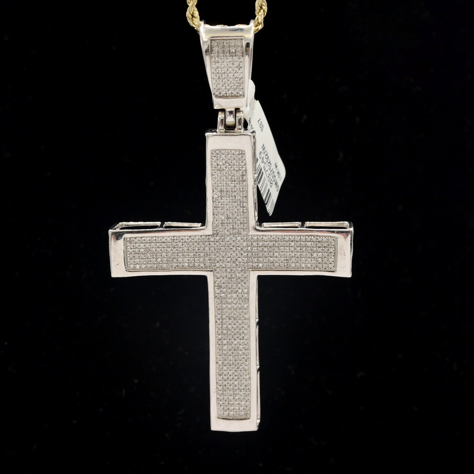 Command respect with this striking iced-out cross pendant in 10k white gold, designed for the modern man who embraces bold faith and luxury. Featuring an impressive 1.8 carats of natural diamonds that blanket the design with exceptional sparkle and brilliance, this charm celebrates both spiritual conviction and refined taste. At 16.5 grams, the substantial weight delivers commanding presence and exceptional craftsmanship, making it a statement piece worthy of daily wear. Each diamond is meticulously selected for clarity and fire, ensuring radiant beauty from every angle. The cool white gold setting provides a pristine backdrop that amplifies the diamonds' luminosity while offering lasting durability. An iconic pendant that honors faith with unapologetic style and sophistication.