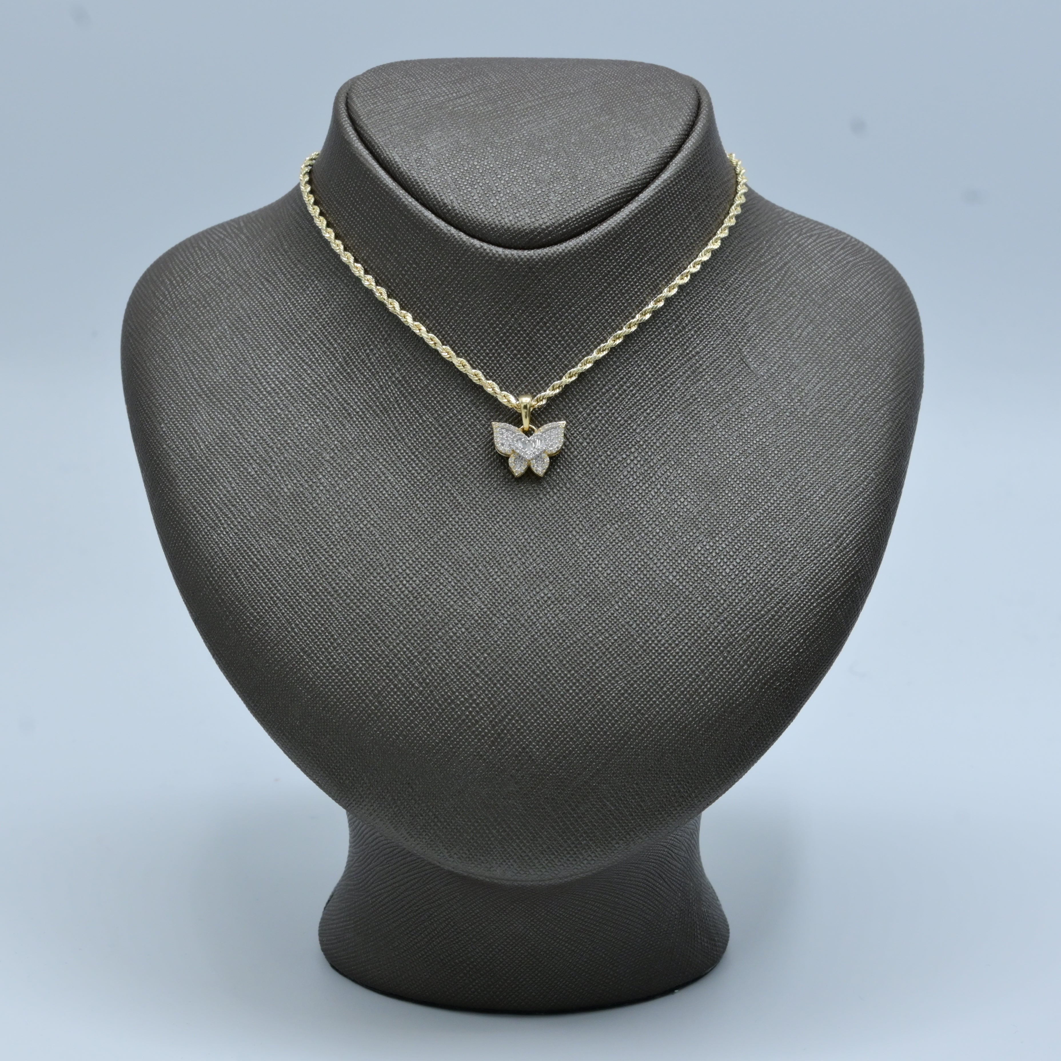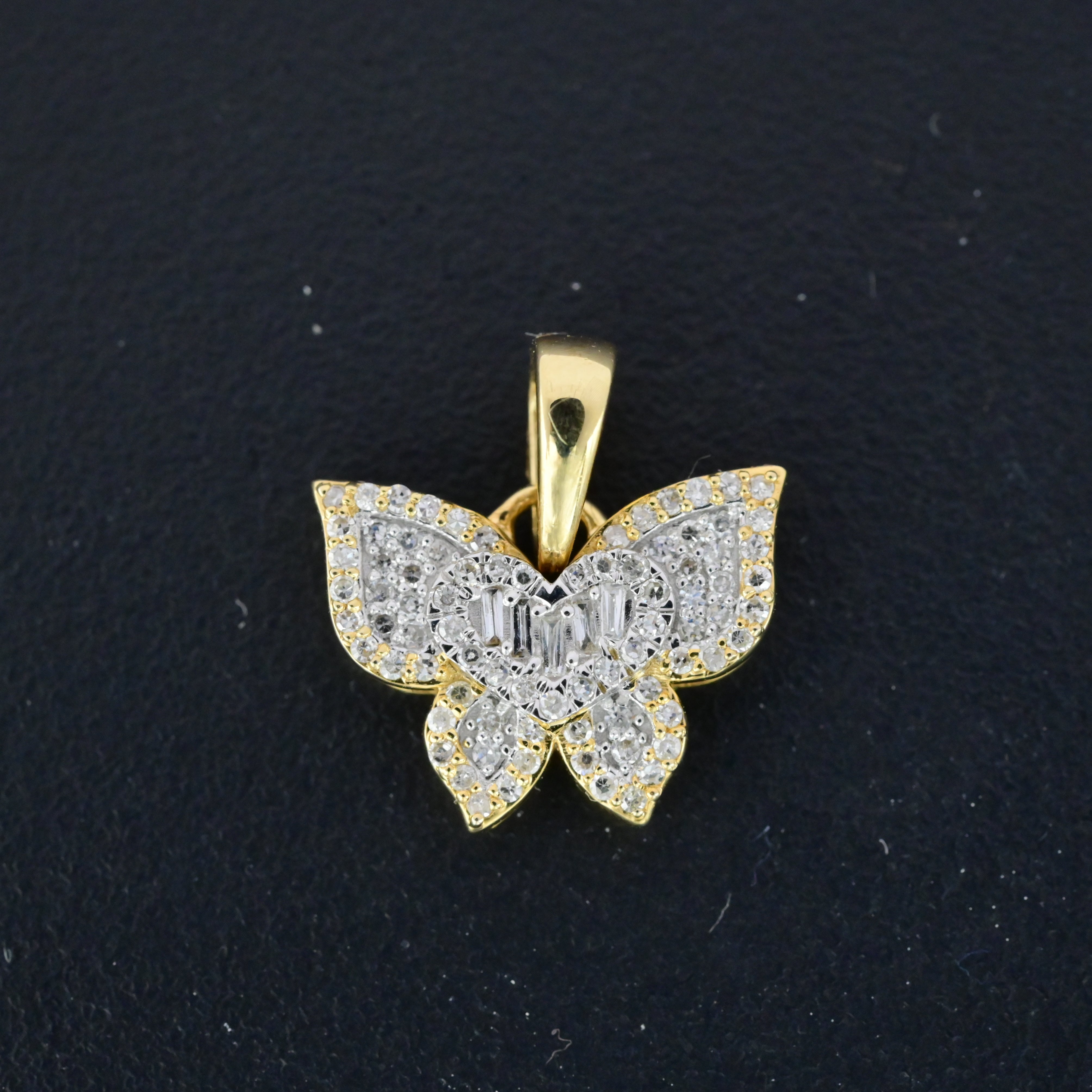 Celebrate delicate beauty with this charming 10k yellow gold butterfly pendant, featuring 0.25 carats of round and baguette diamonds in an enchanting design. Weighing just 1.9 grams, this versatile charm combines meaningful symbolism with refined elegance. The mixed diamond cuts create visual interest—round stones provide classic sparkle while baguettes add geometric sophistication to the butterfly motif. The warm yellow gold setting enhances the diamonds' brilliance, creating a luminous composition perfect for layering or wearing solo. Ideal as a standalone pendant or as part of a curated charm collection, this piece celebrates transformation and grace. A thoughtful investment that adds sentimental value and timeless sophistication to any jewelry wardrobe.