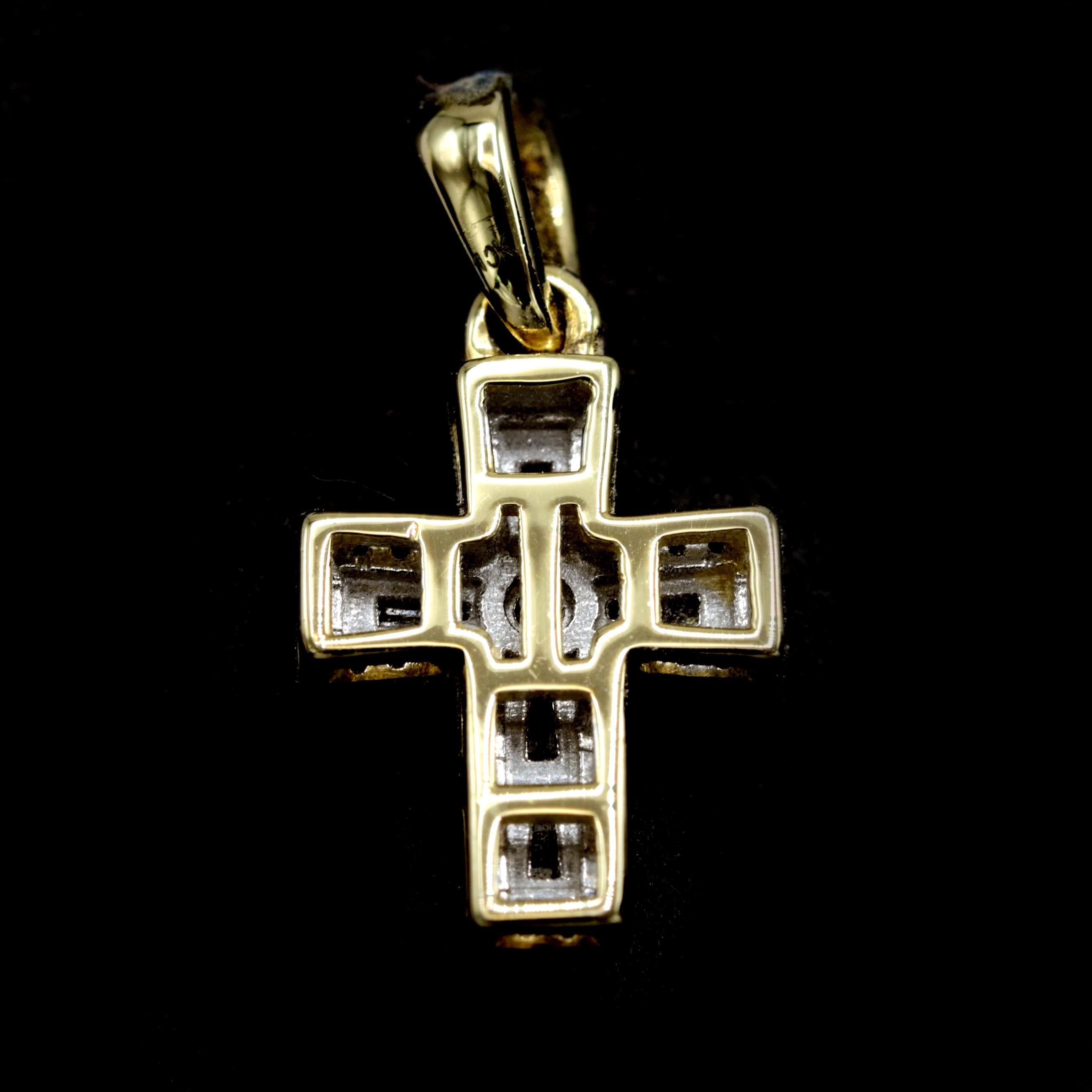 Embrace spiritual elegance with this delicate 10k yellow gold cross pendant, a refined charm that celebrates faith through understated sophistication. Weighing merely 1.6 grams, this graceful piece features 0.32 carats of natural baguette diamonds arranged with geometric precision along the cross design. The linear quality of baguette cuts creates architectural interest while maintaining the pendant's delicate proportions. An ideal selection for those seeking a subtle yet meaningful religious charm that honors devotion through premium craftsmanship and natural diamond artistry.