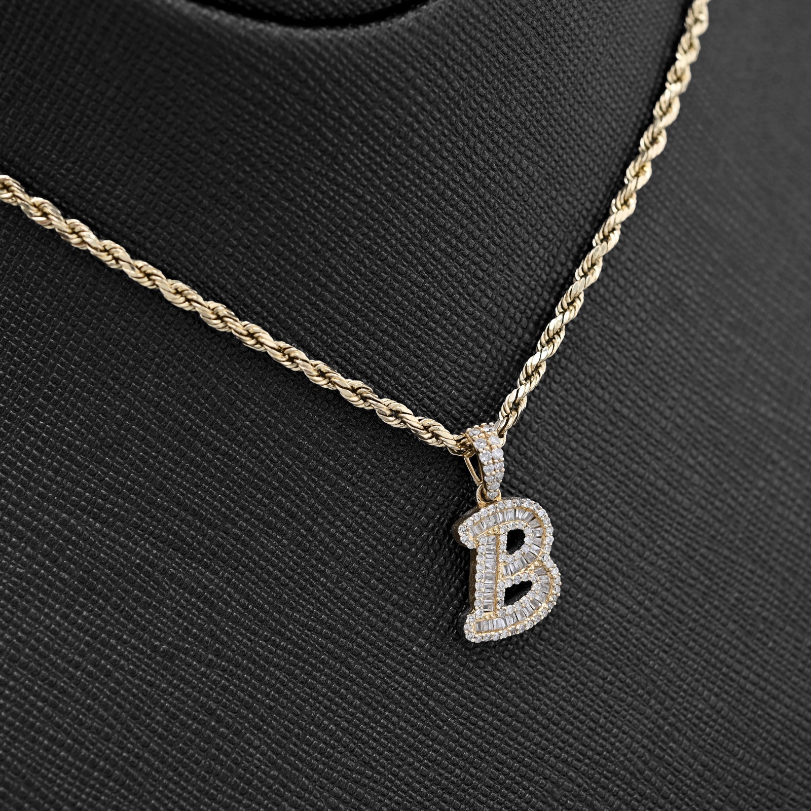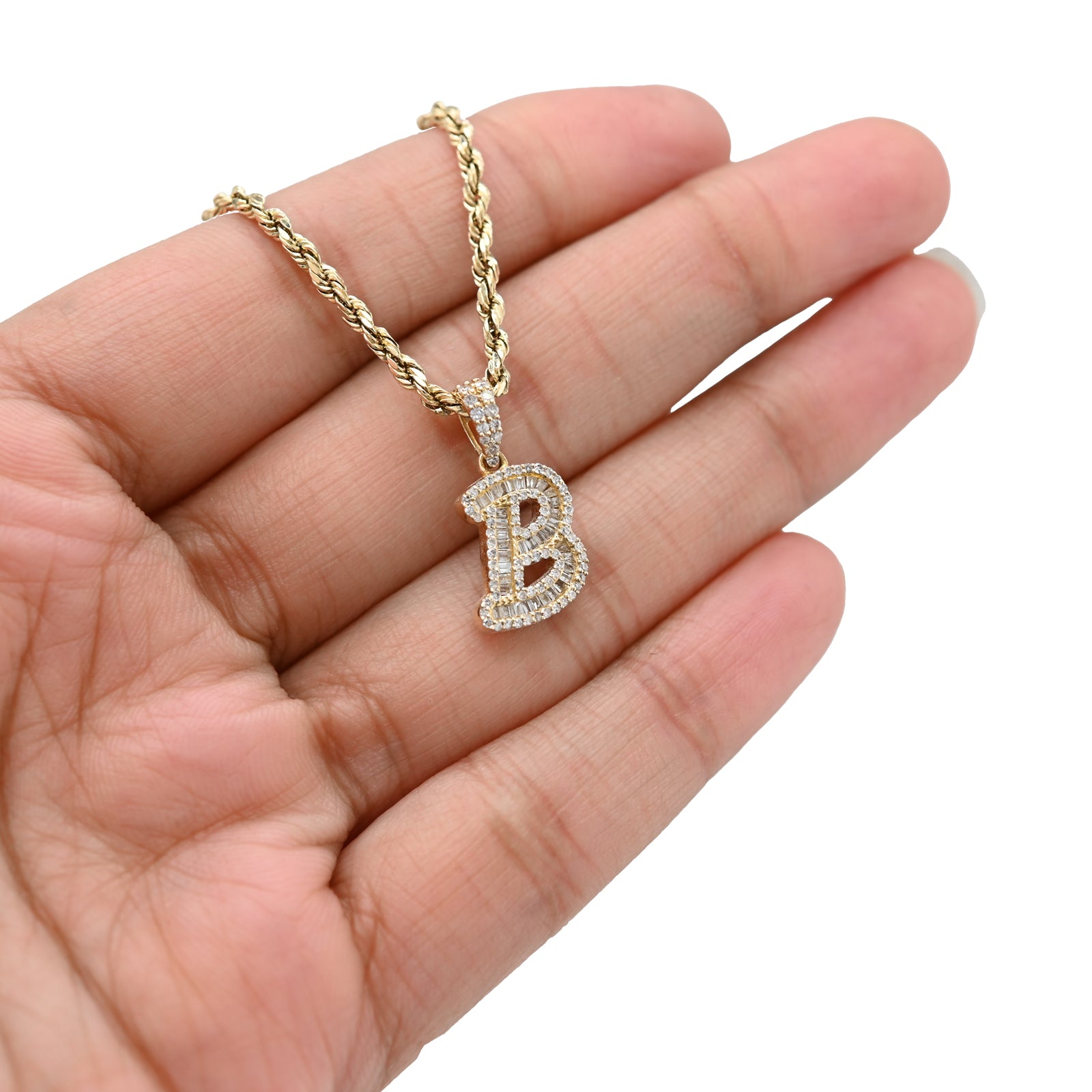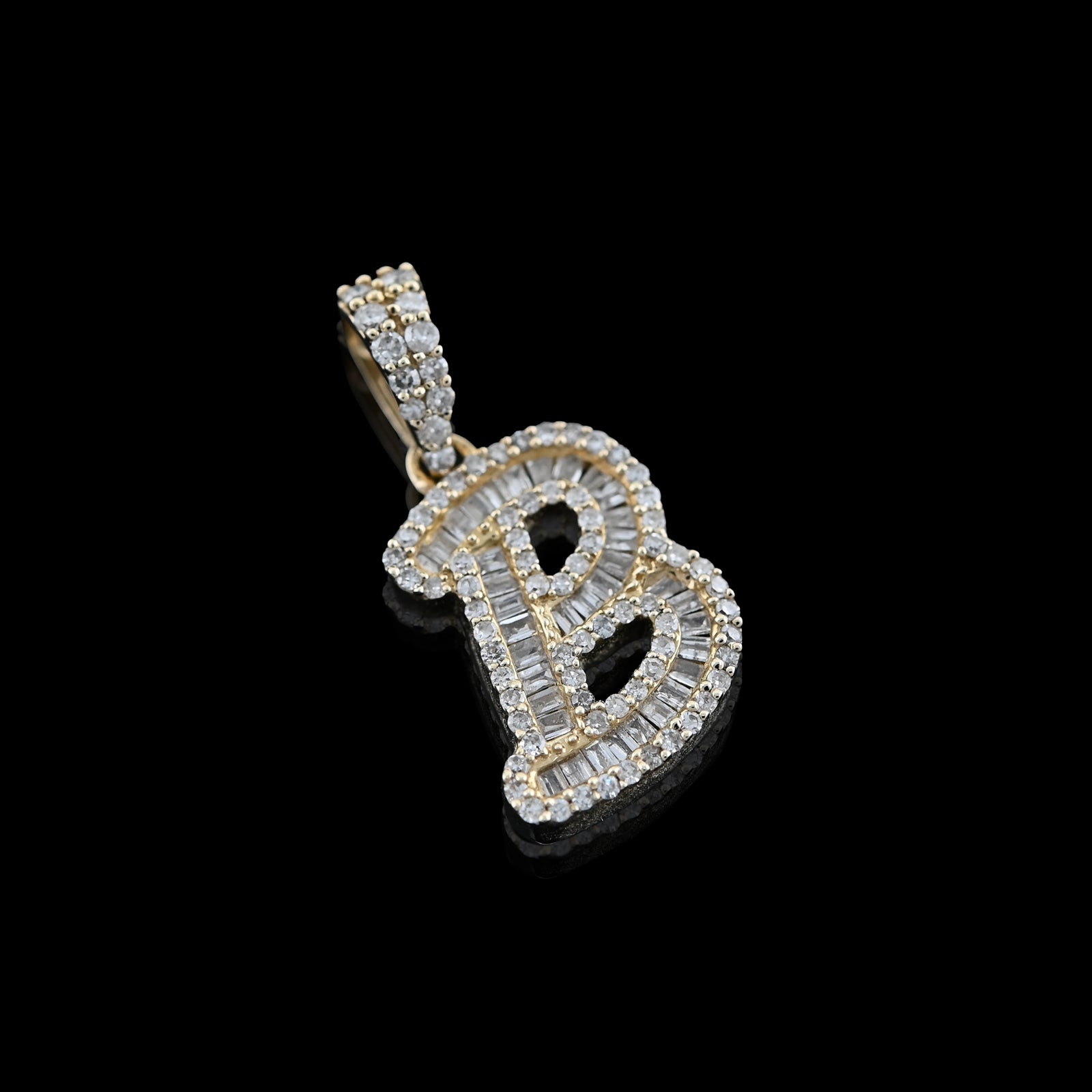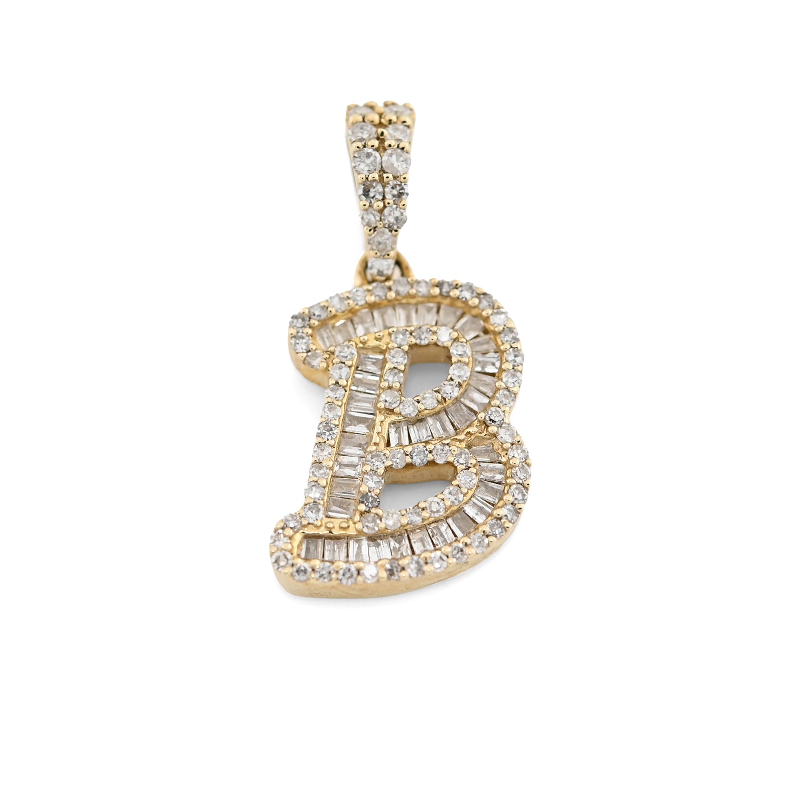 Elevate your personal style with this refined initial pendant crafted in 10k yellow gold. Featuring a graceful "B" design adorned with 0.375 carats of natural diamonds—a blend of brilliant round and elegant baguette cuts—this piece strikes the perfect balance between understated elegance and timeless sparkle. Weighing just 1.6 grams, it's delicate enough for everyday wear yet substantial enough to make a meaningful statement. An ideal choice for those seeking a sophisticated, personalized accessory that celebrates individuality with enduring beauty.