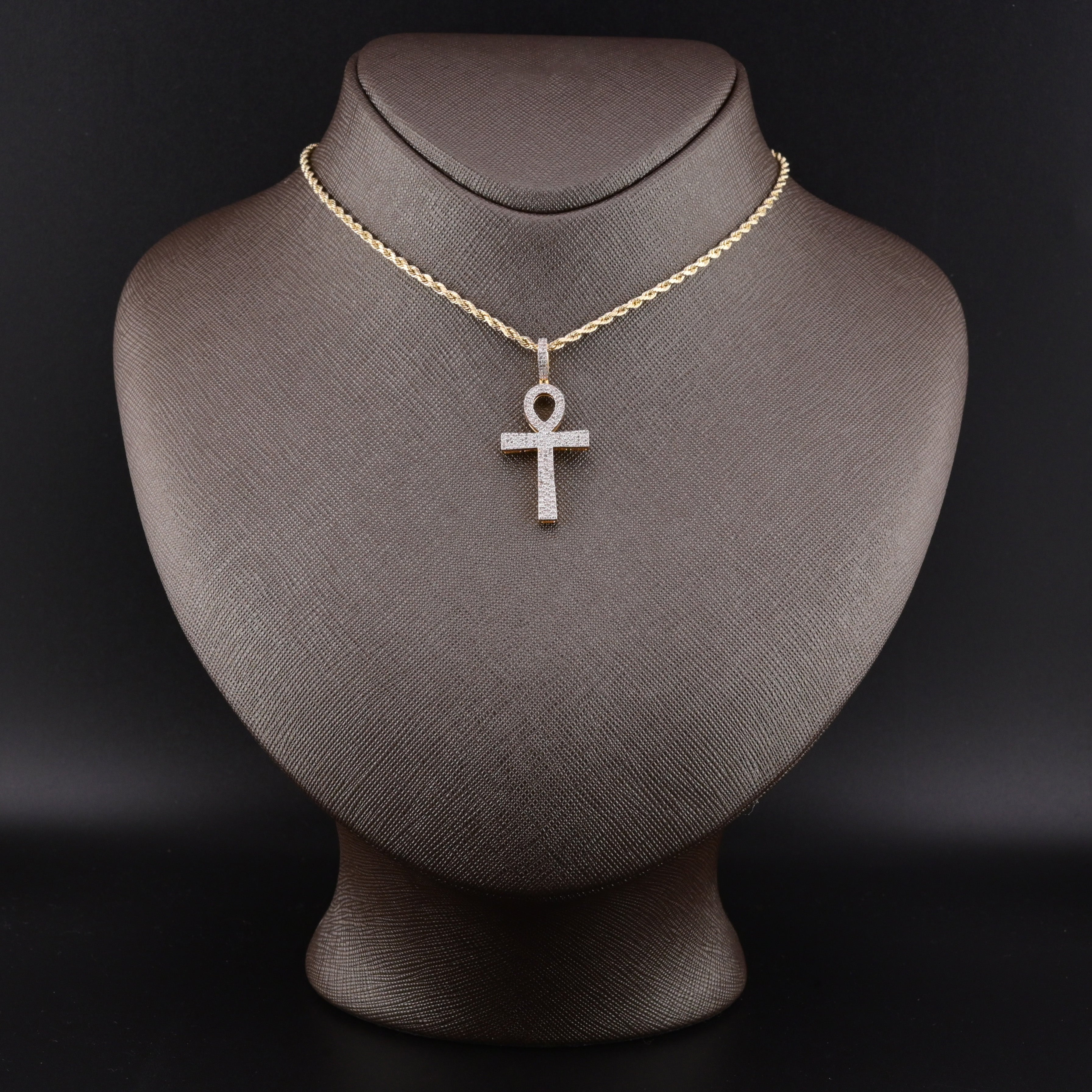 This exquisite ankh cross pendant combines timeless spiritual symbolism with refined elegance. Crafted in 10k yellow gold and adorned with 0.6 carats of natural round diamonds, this piece radiates understated luxury. Weighing just 2.6 grams, it strikes the perfect balance between presence and wearability, making it an ideal charm for layering or standalone wear. The natural diamonds catch light beautifully, adding brilliance to this meaningful design. A sophisticated choice for those seeking jewelry that honors both aesthetic beauty and deeper significance.