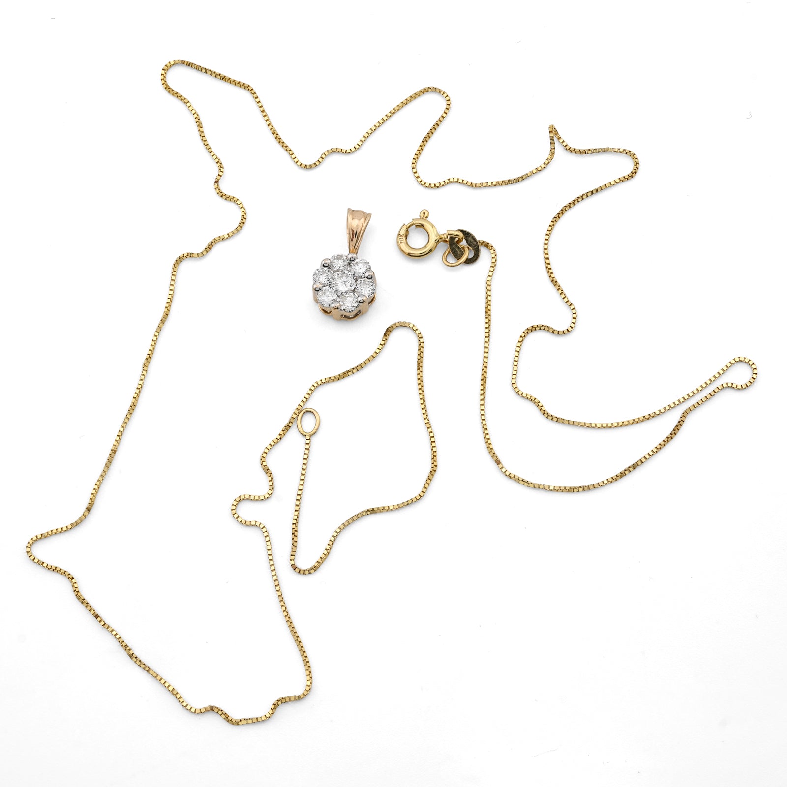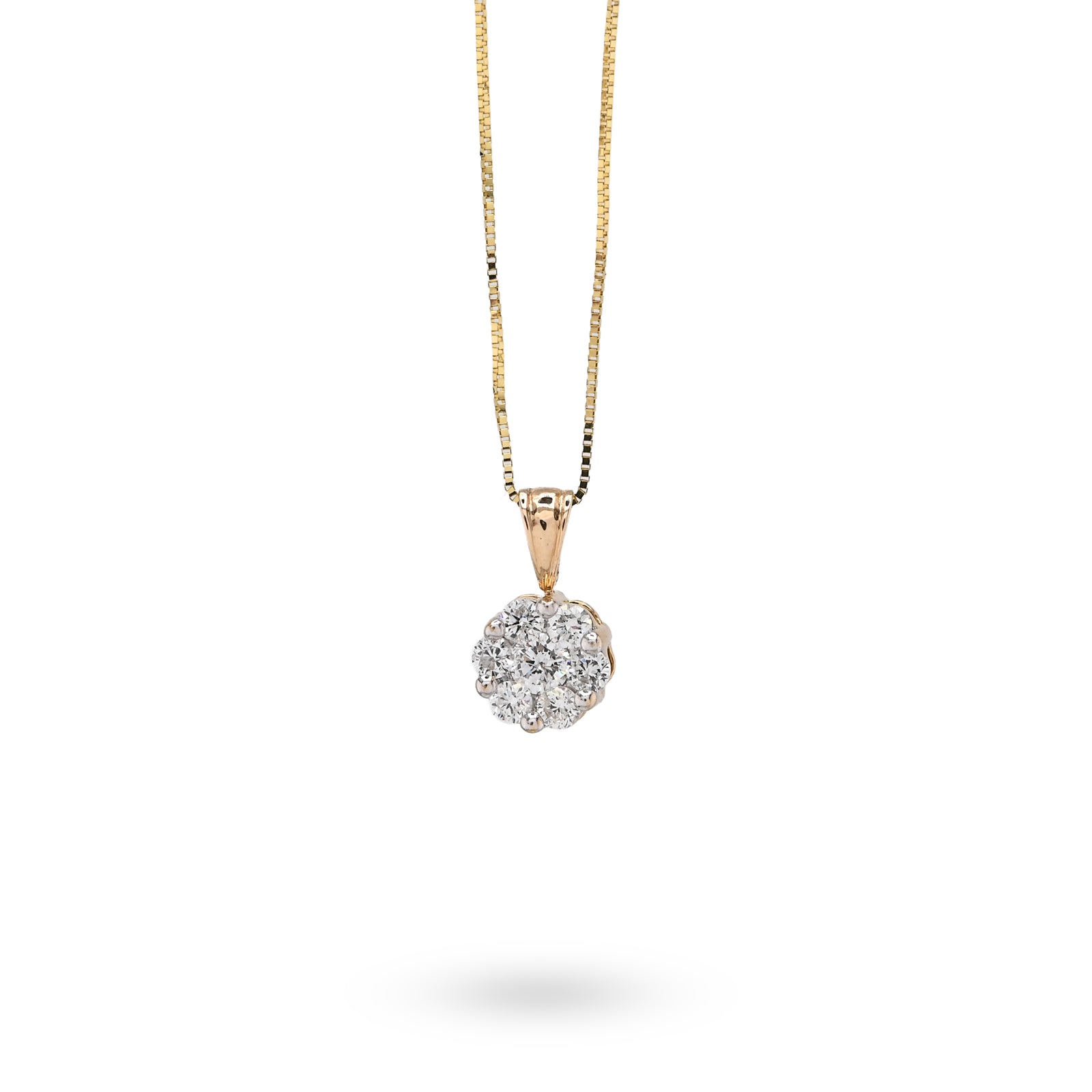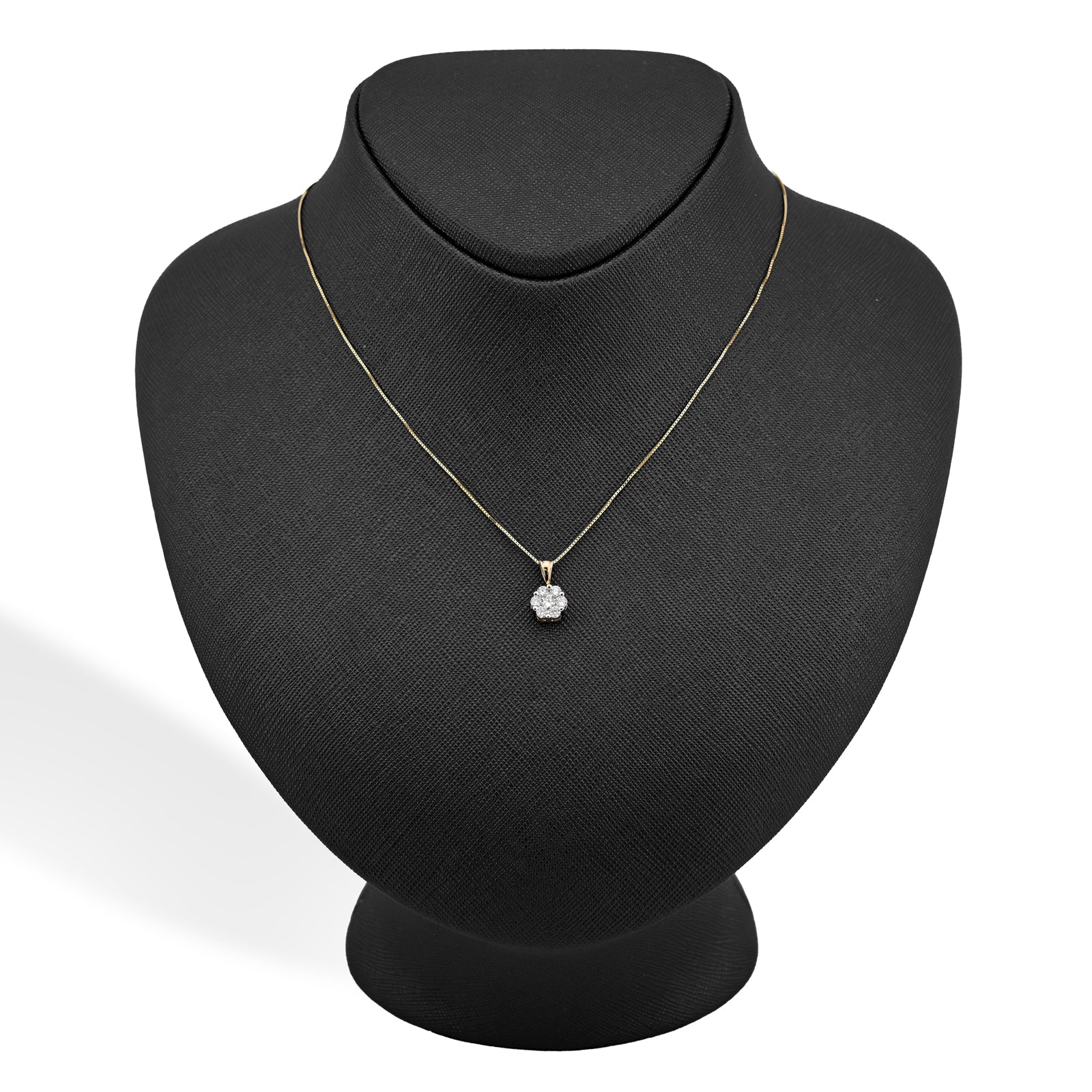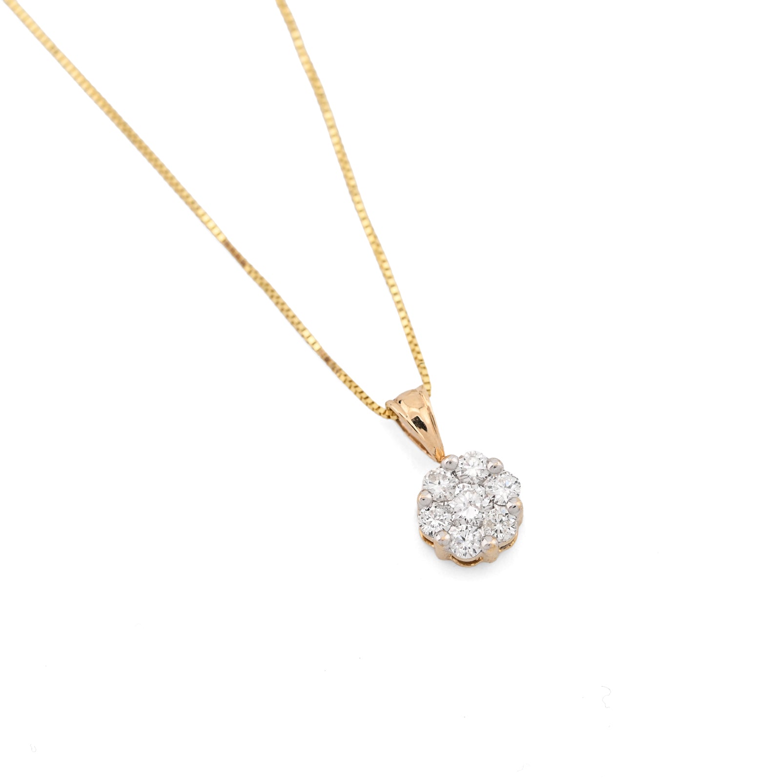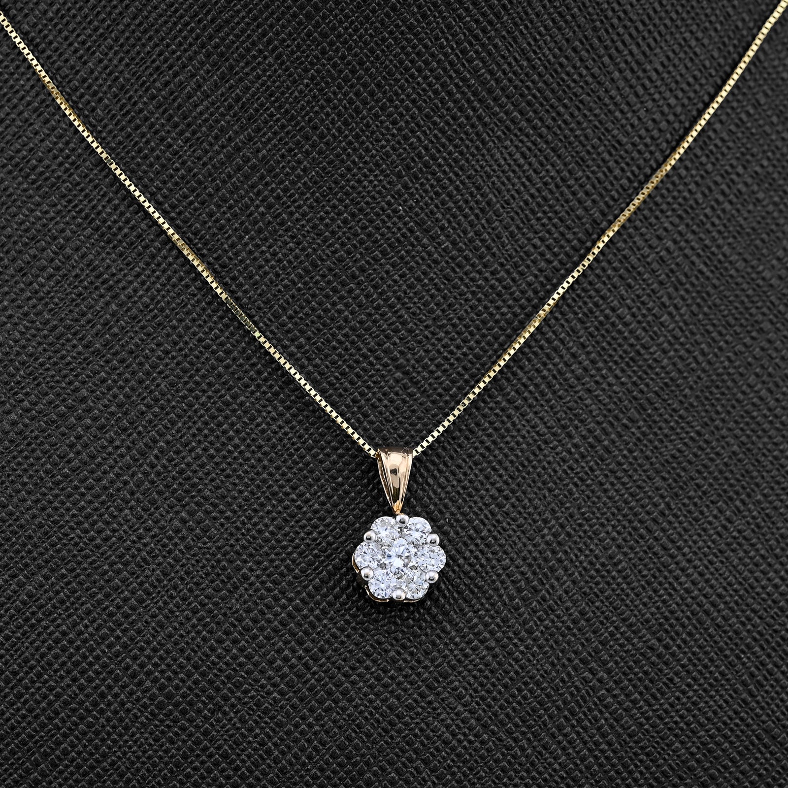 Complete elegance arrives with this comprehensive 10k yellow gold set, pairing a luminous 0.75-carat natural diamond flower cluster pendant with a matching box chain. The warm glow of yellow gold enhances the brilliance of the diamonds arranged in botanical splendor, while the sturdy box chain ensures secure, graceful draping. Weighing just 2.4 grams, this coordinated ensemble delivers substantial sparkle in a refined, wearable package. Ready to wear straight from the box, this set eliminates the guesswork of pairing pieces, making it an ideal choice for gifting or personal indulgence.