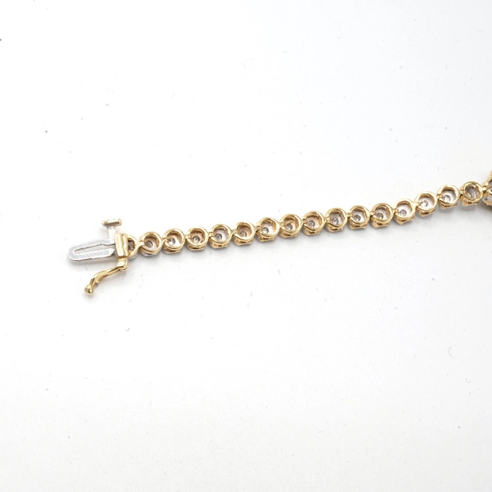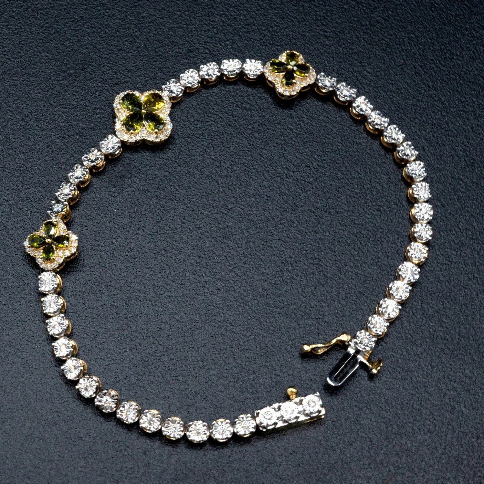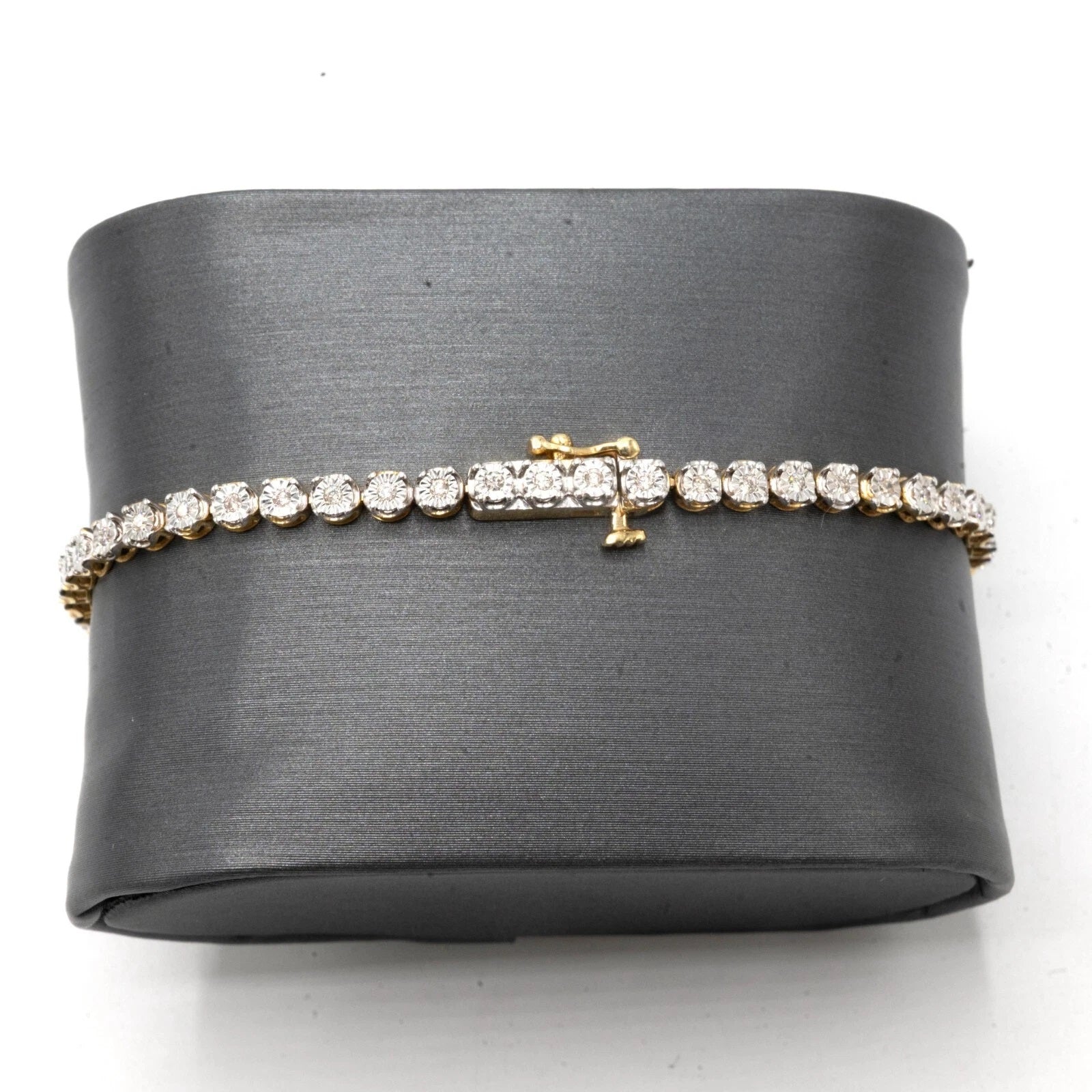This 10k Yellow Gold 0.75CTW Diamond Graduating 11MM Clove Tennis Bracelet is a stunning piece of fine jewelry for women. The bracelet features a stunning array of diamonds in an illusion setting, with a total weight of 0.75 carats. It is crafted from polished 10k yellow gold, making it a perfect accessory for special occasions like anniversaries, birthdays, engagements, Father's Day, and Mother's Day. The bracelet comes in a complimentary SB Signature jewelry box and is professionally tested and stamped for quality assurance. With a hip hop theme, this original piece by SB Jewelers is a stylish and elegant addition to any jewelry collection.
