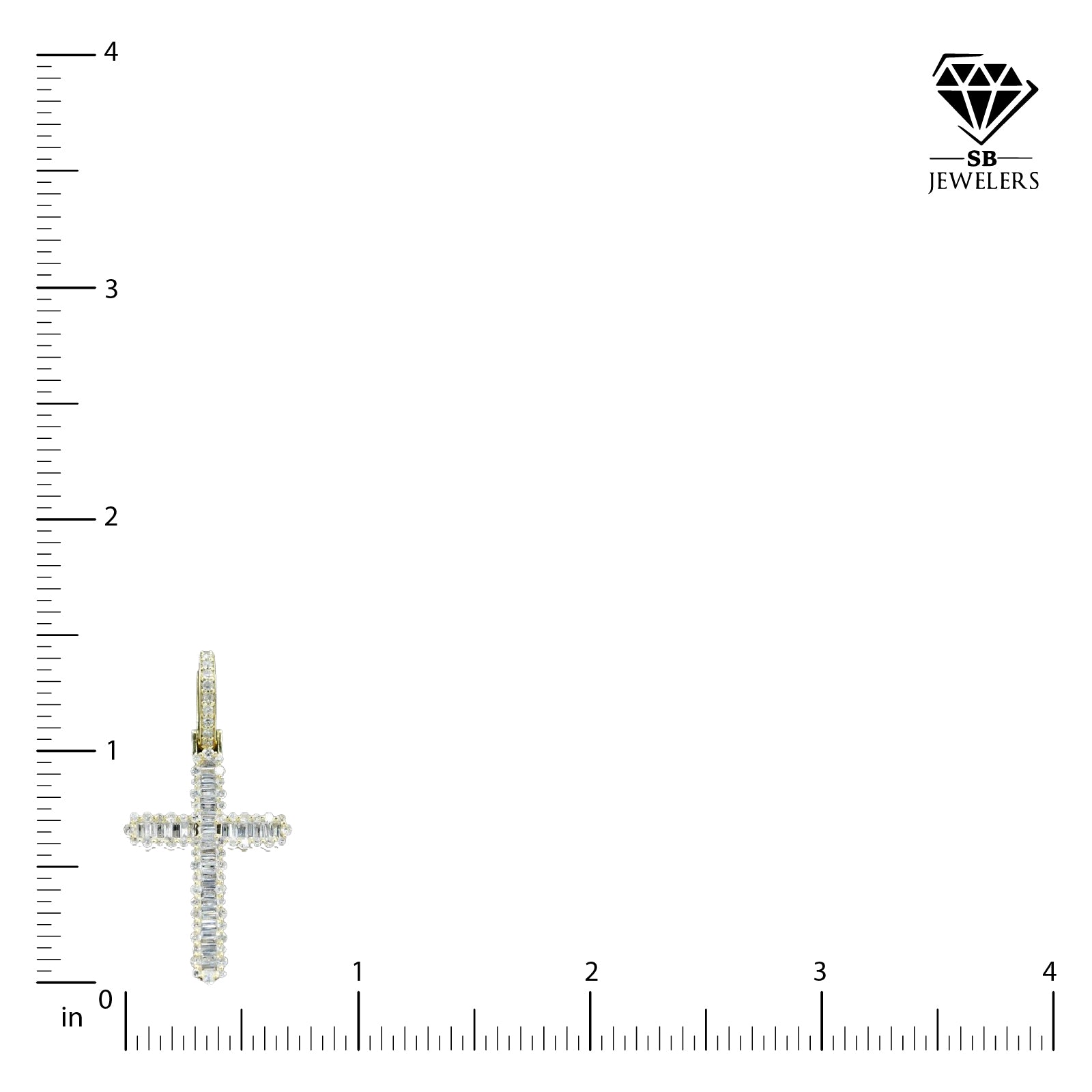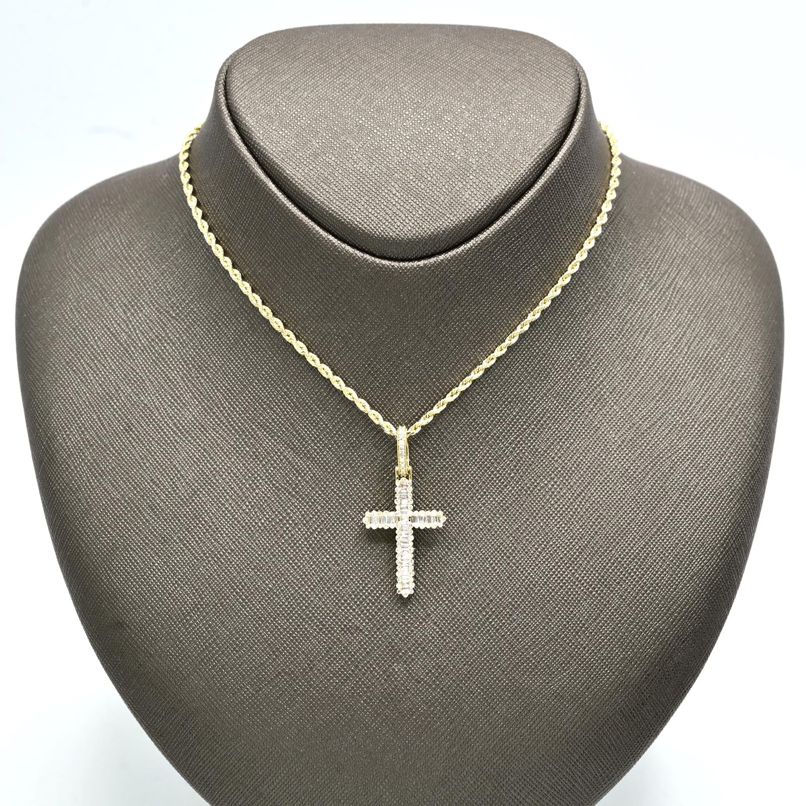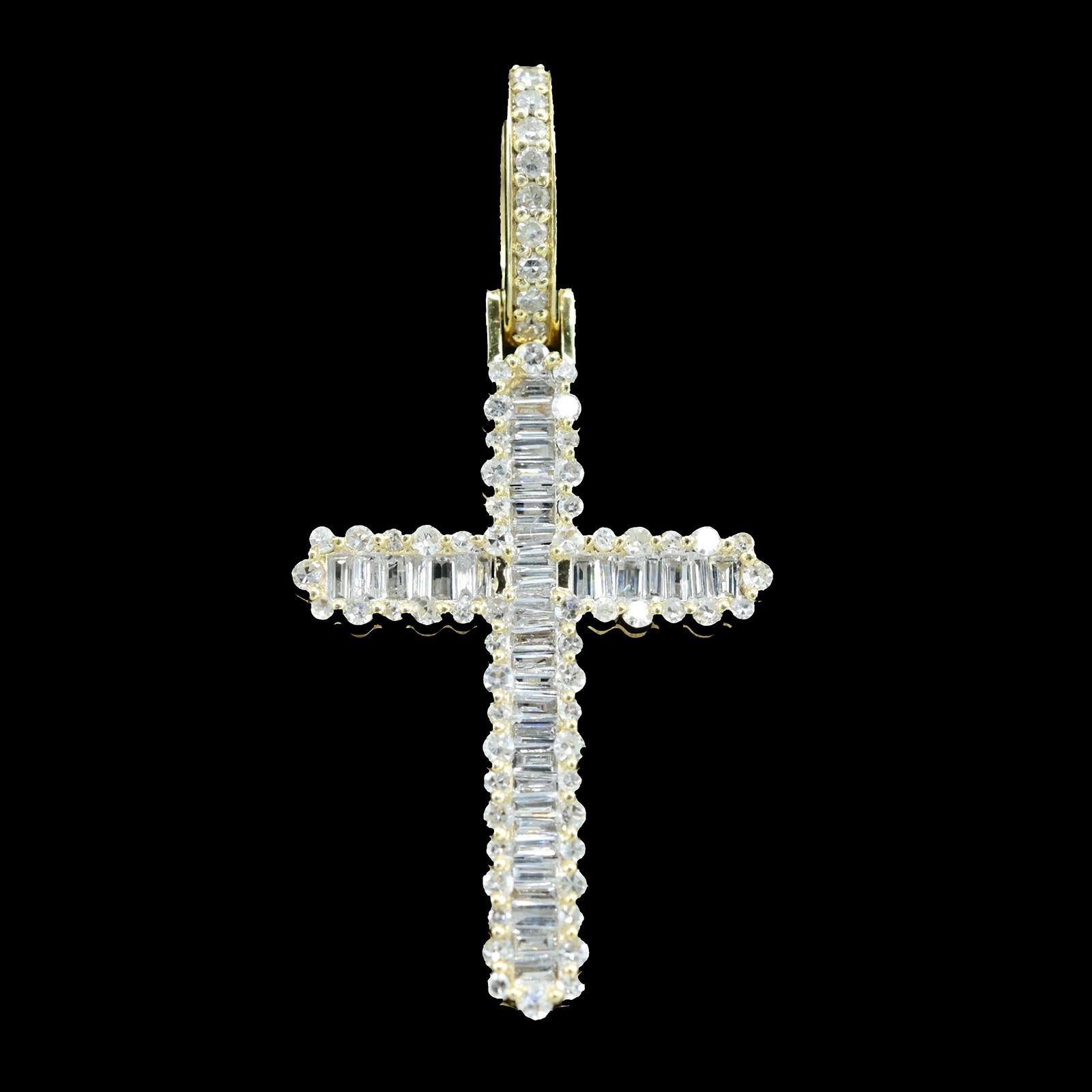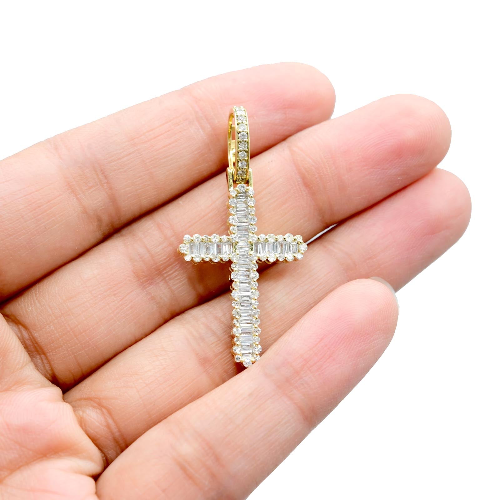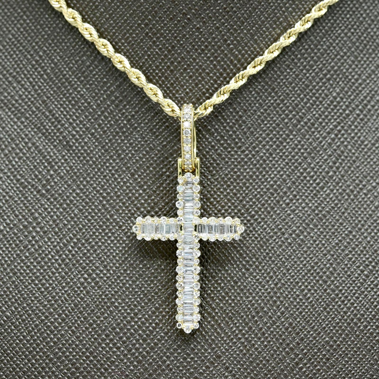 Express your faith with this refined 10k yellow gold cross pendant, a pure and meaningful charm that balances spiritual significance with elegant design. Weighing just 2.7 grams, this delicate piece combines 0.85 carats of round and baguette diamonds in a harmonious composition. The brilliant round stones provide radiant sparkle while geometric baguettes add architectural precision, creating visual interest across the sacred cross form. Perfect for those seeking a subtle yet sophisticated religious pendant that honors devotion through premium craftsmanship and natural diamond artistry.