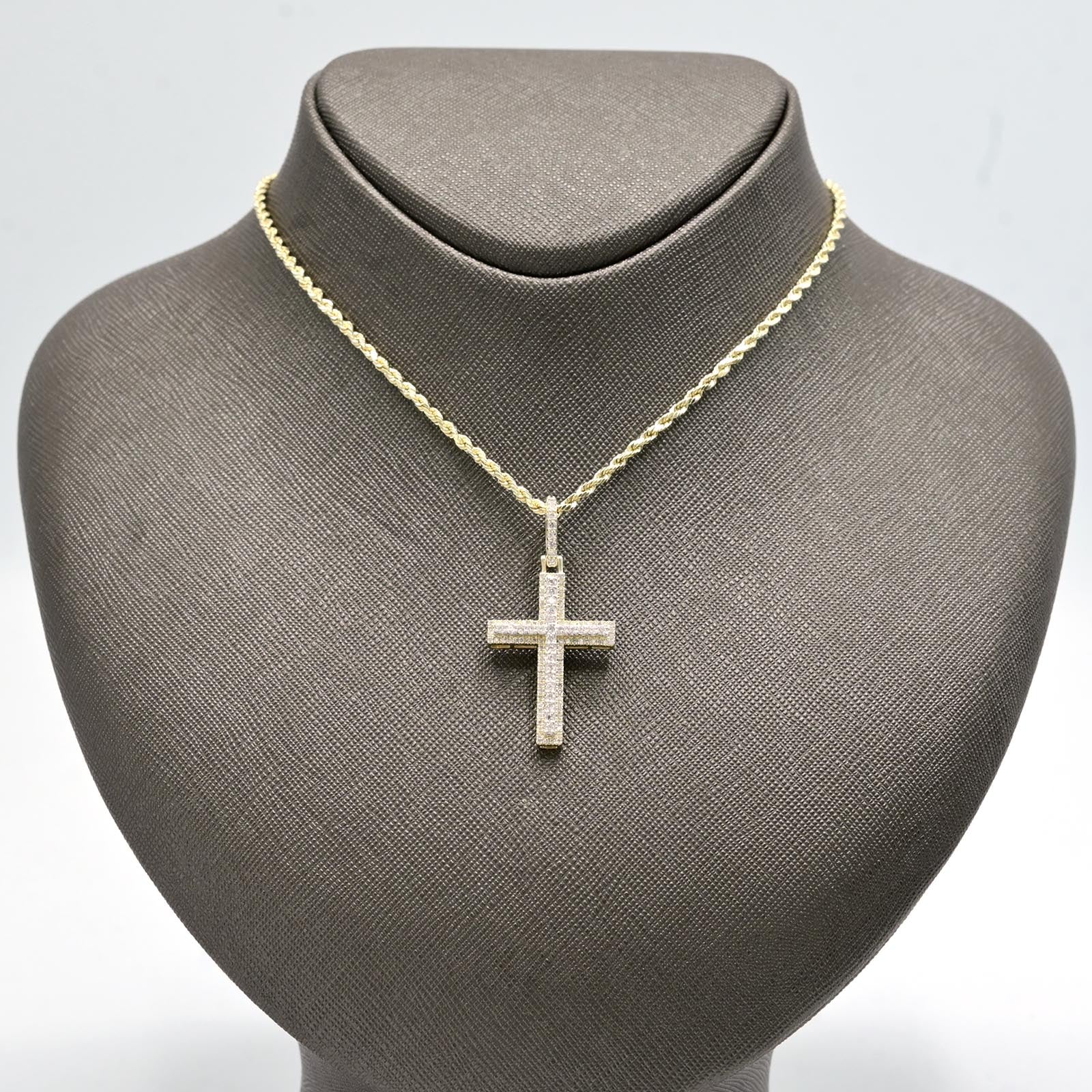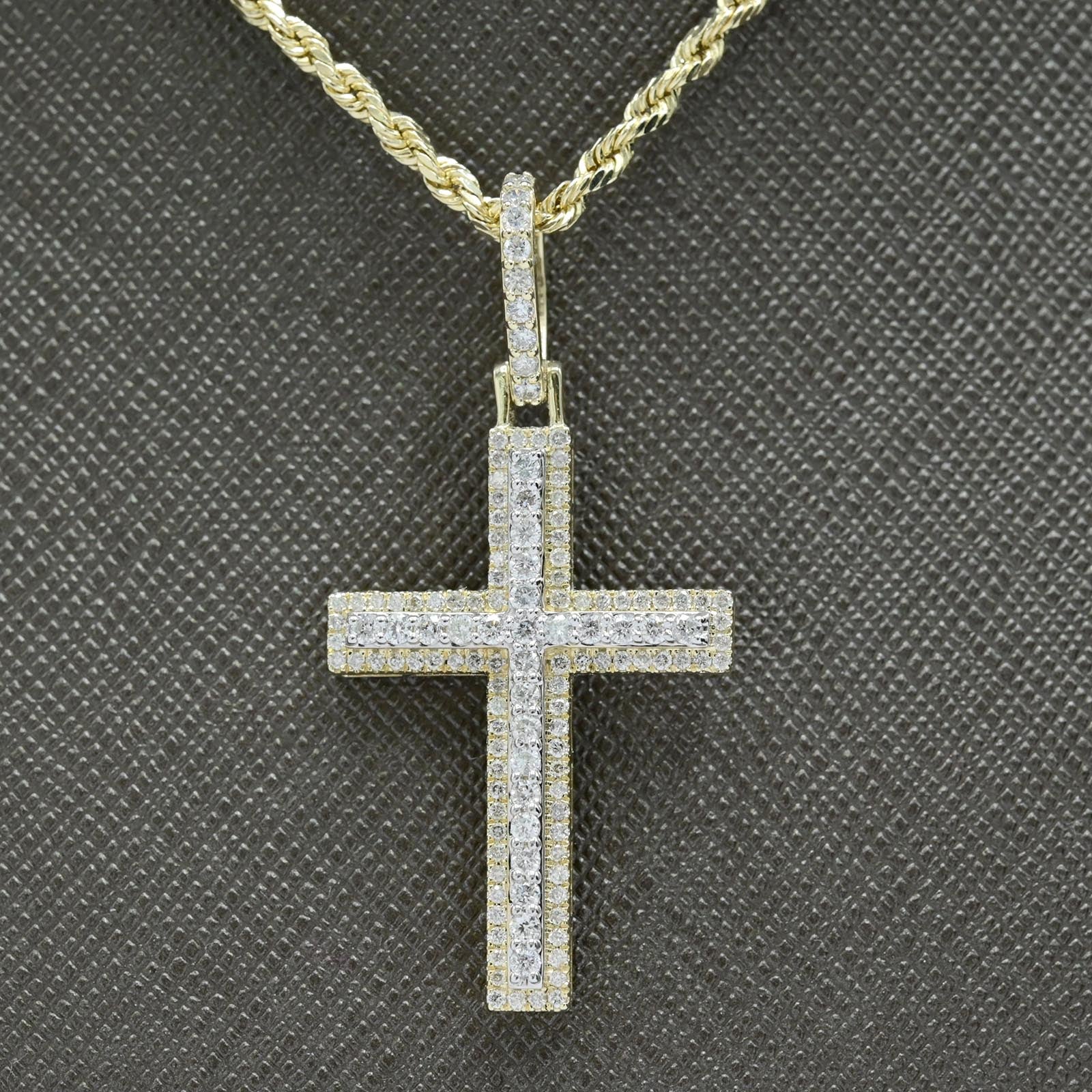 Deepen your spiritual expression with this elegant 10k yellow gold cross pendant, featuring a distinctive two-layer design that adds dimensional sophistication. Weighing 3.6 grams, this refined piece showcases 0.9 carats of natural round diamonds distributed across both layers, creating captivating depth and radiance. The layered construction enhances the cross symbolism while the brilliant diamond setting catches light beautifully from multiple angles. An excellent choice for those seeking a meaningful religious pendant that celebrates faith through innovative design and premium gemstone craftsmanship.