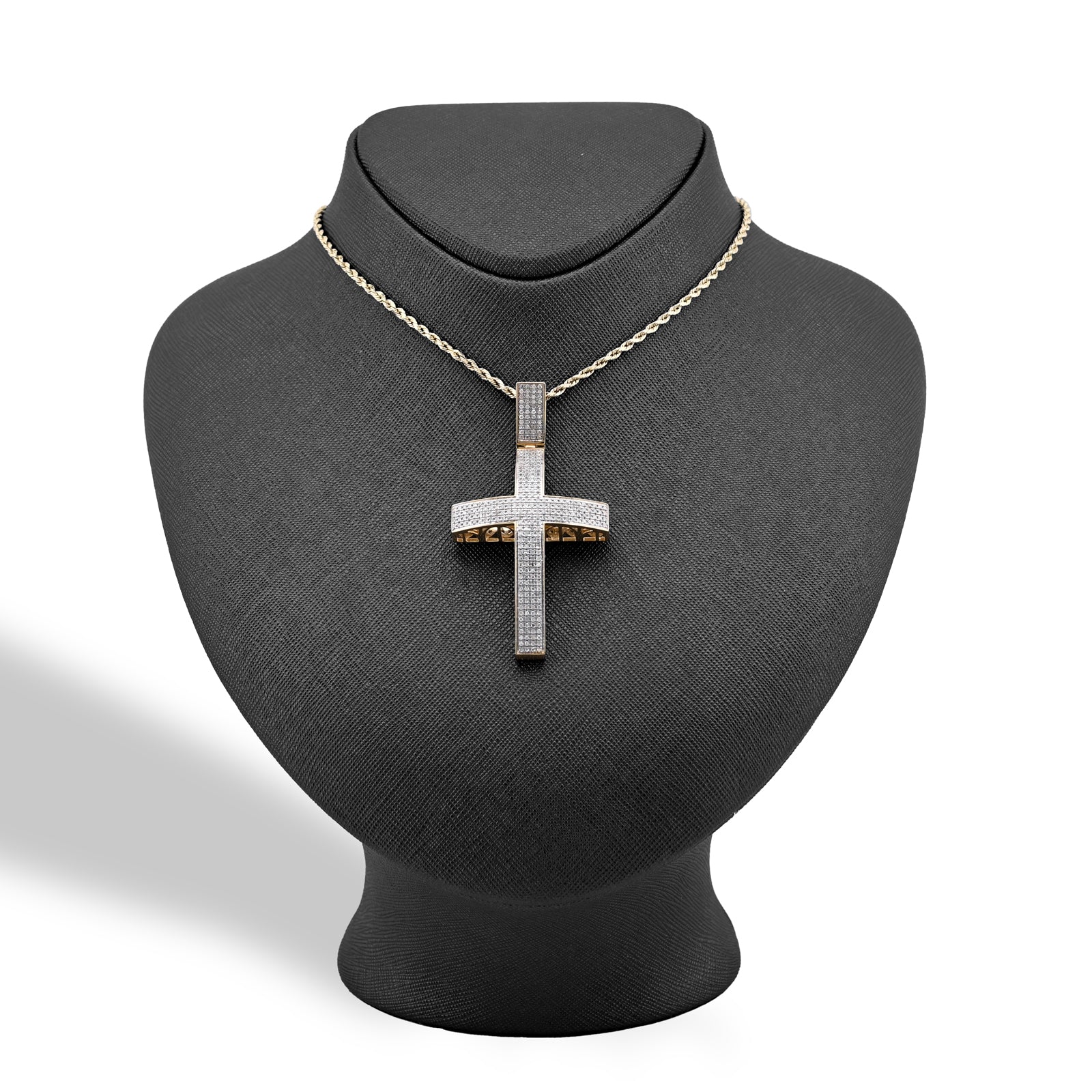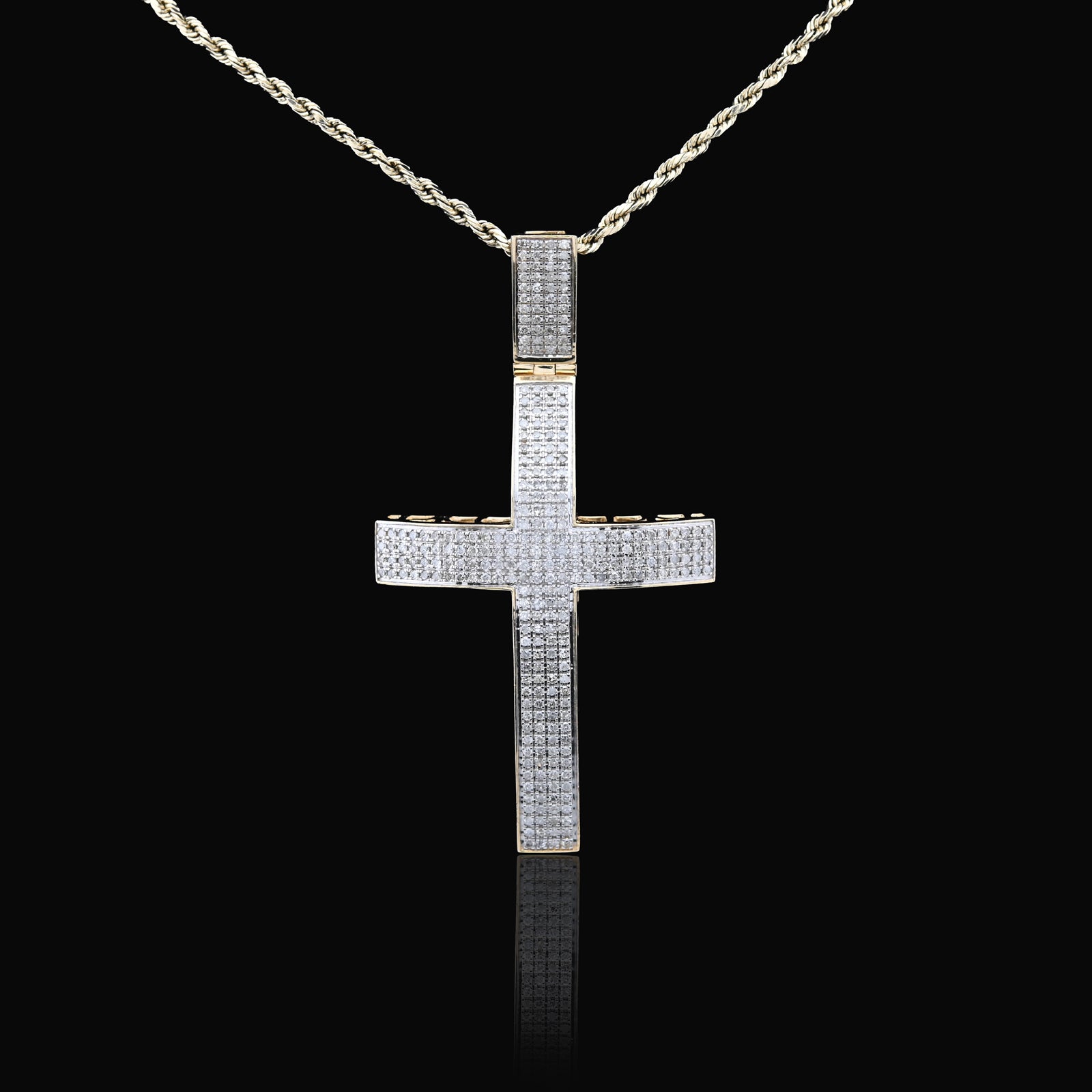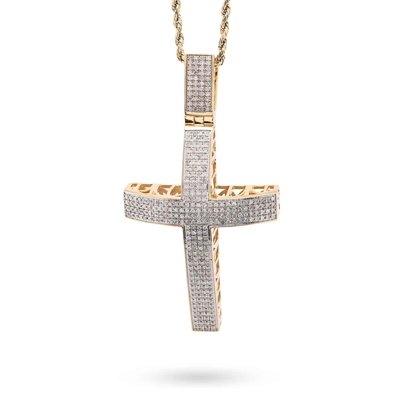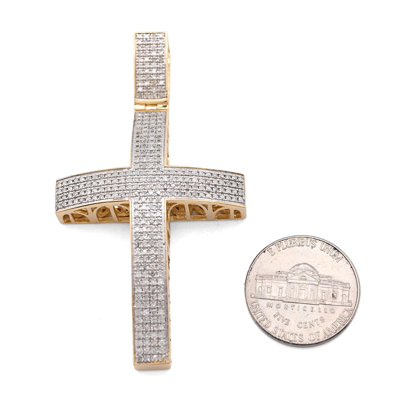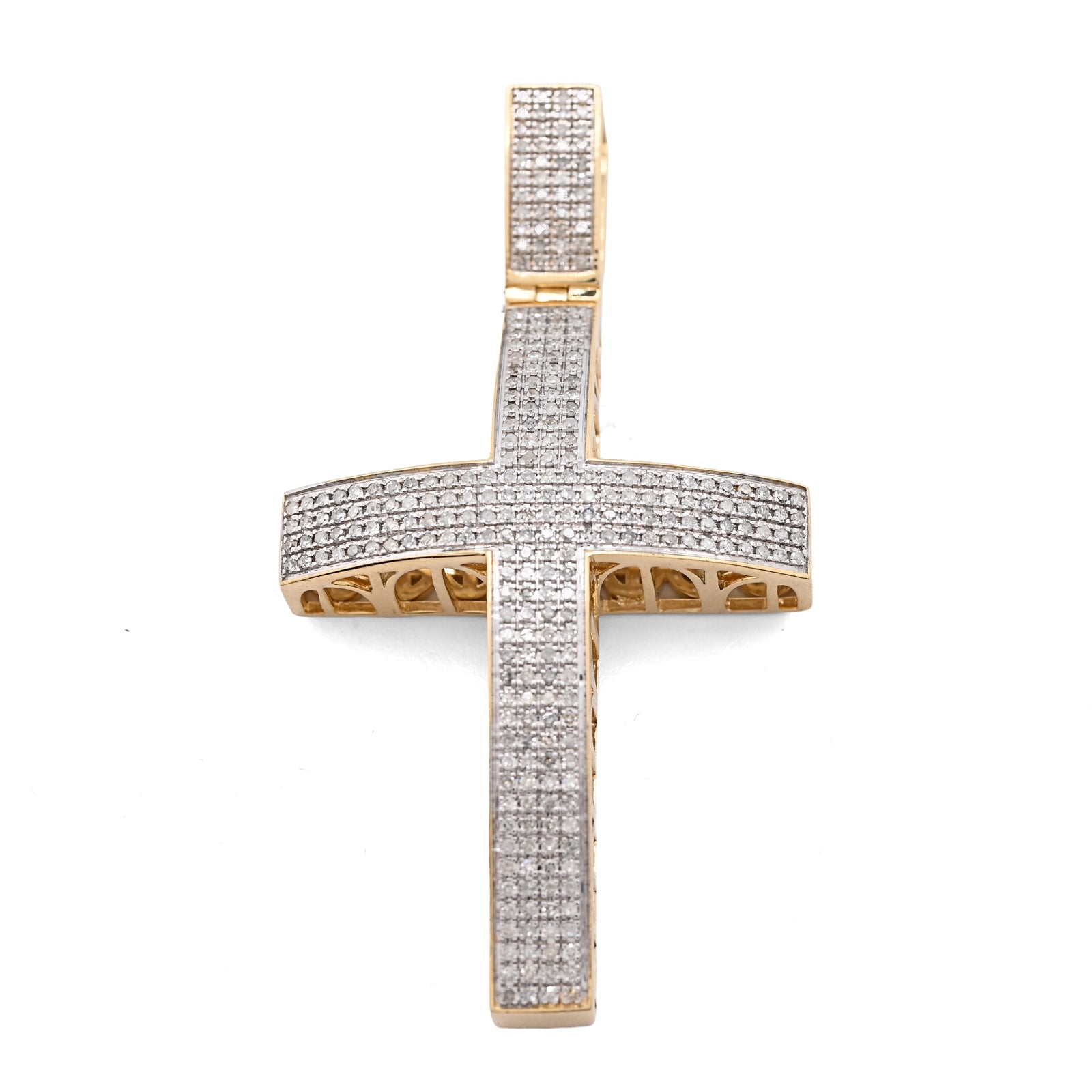 Make a profound statement with this magnificent domed cross pendant in rich 10k yellow gold. Featuring 1.45 carats of natural diamonds meticulously pave-set across the curved surface, the stones create a luminous, three-dimensional effect that captures light beautifully from every angle. Weighing 17.5 grams, this substantial piece commands presence and reverence, perfect for those seeking to express their faith with confidence and style. The domed architecture combined with genuine gemstones elevates this beyond ordinary religious jewelry, creating a heirloom-quality charm that celebrates spirituality through exceptional craftsmanship and timeless elegance.