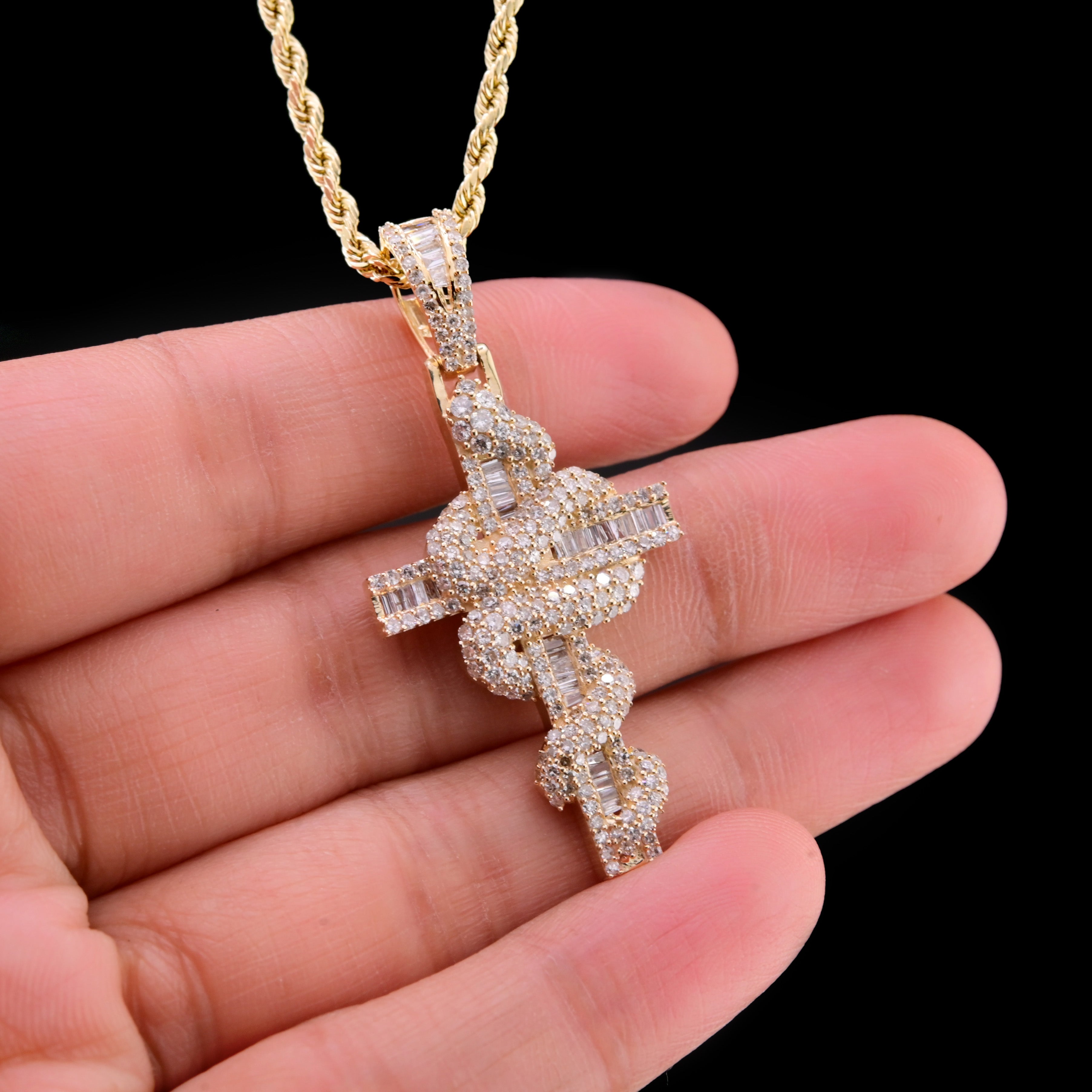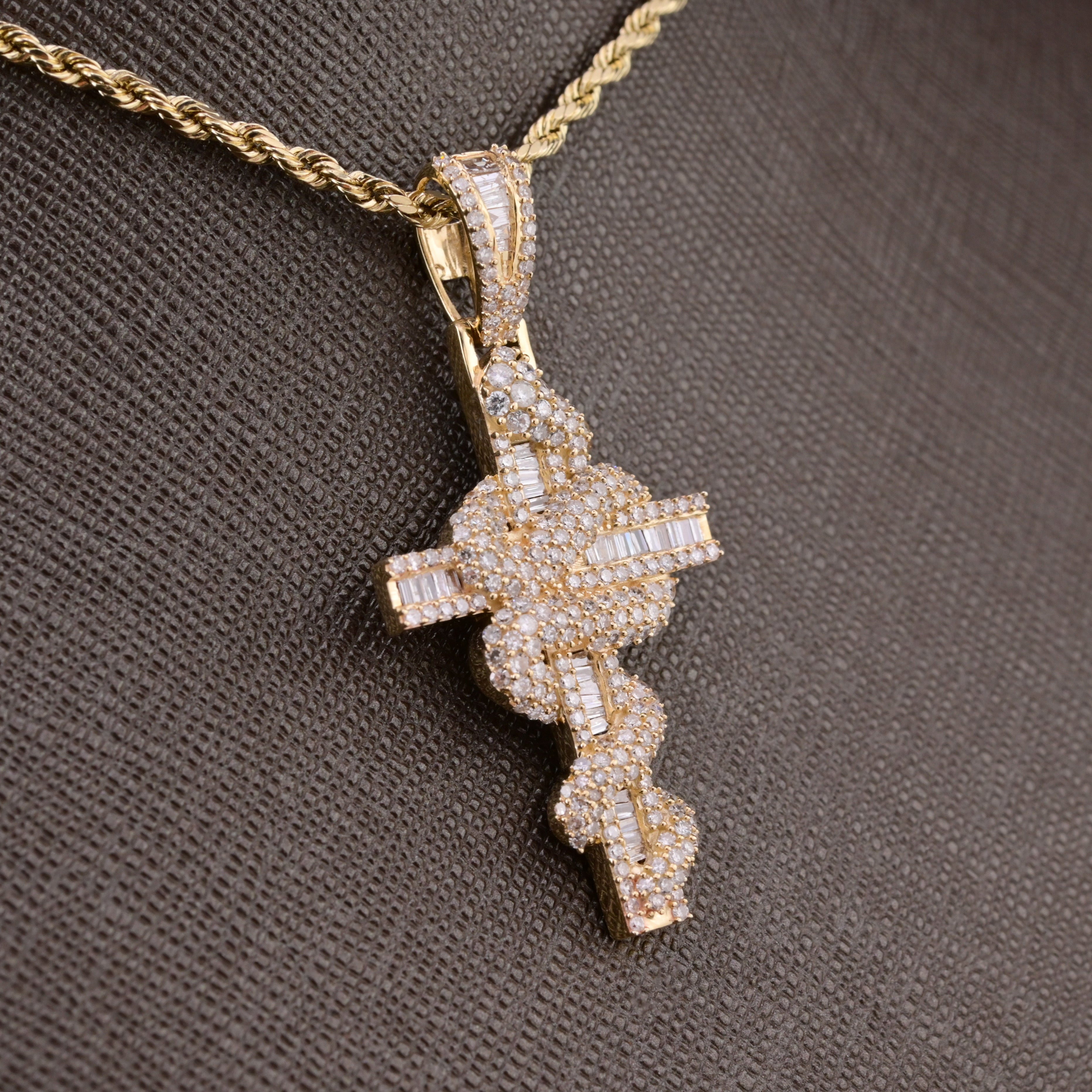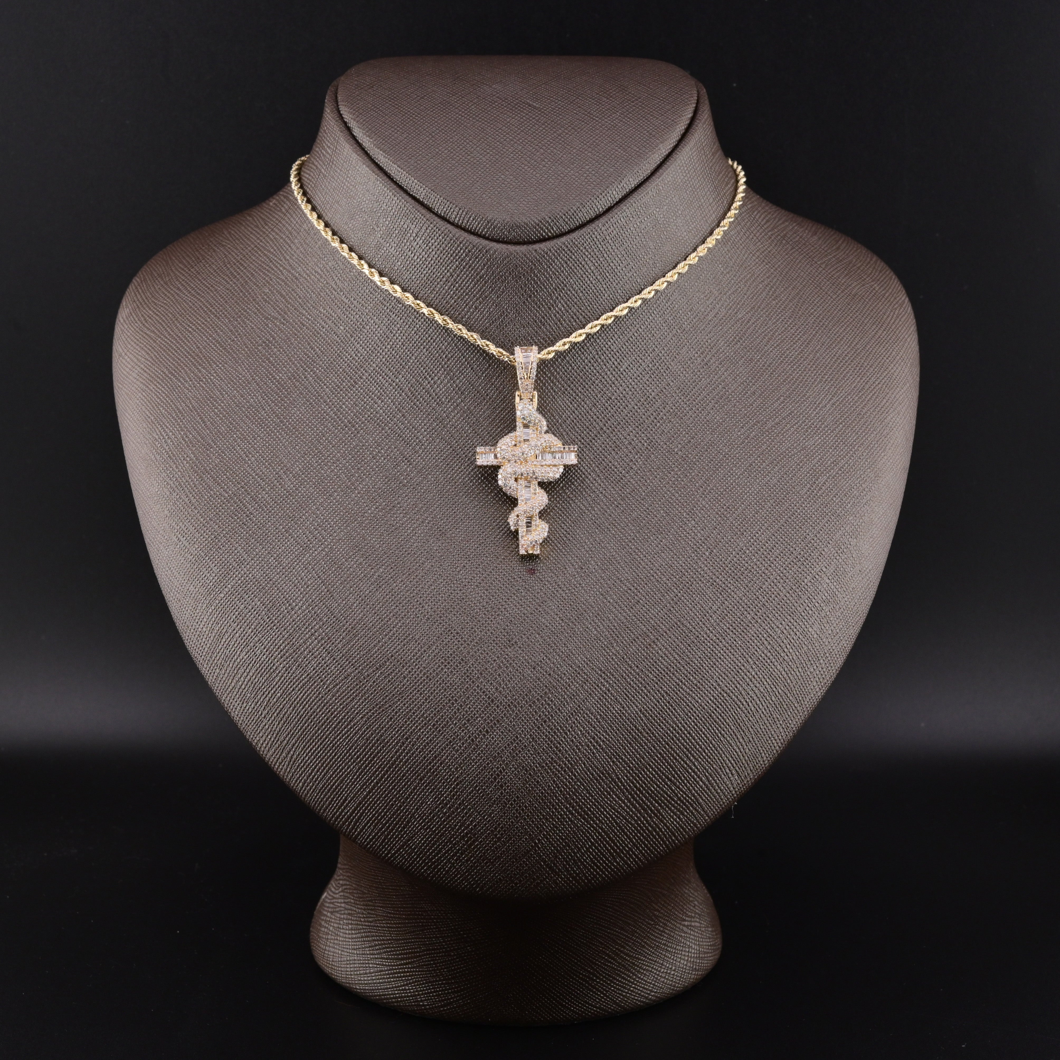 This intriguing 10k yellow gold pendant merges spiritual symbolism with natural imagery, featuring a cross intertwined with an elegant snake design. Weighing just 5.3 grams, the piece showcases 1.65 carats of natural diamonds that illuminate both the sacred cross and the serpent motif with brilliant radiance. The warm gold tone provides a rich backdrop for the diamond setting, creating a sophisticated composition that balances religious significance with artistic intrigue. Perfect for those drawn to meaningful pendants that celebrate faith through unconventional design and premium gemstone craftsmanship.