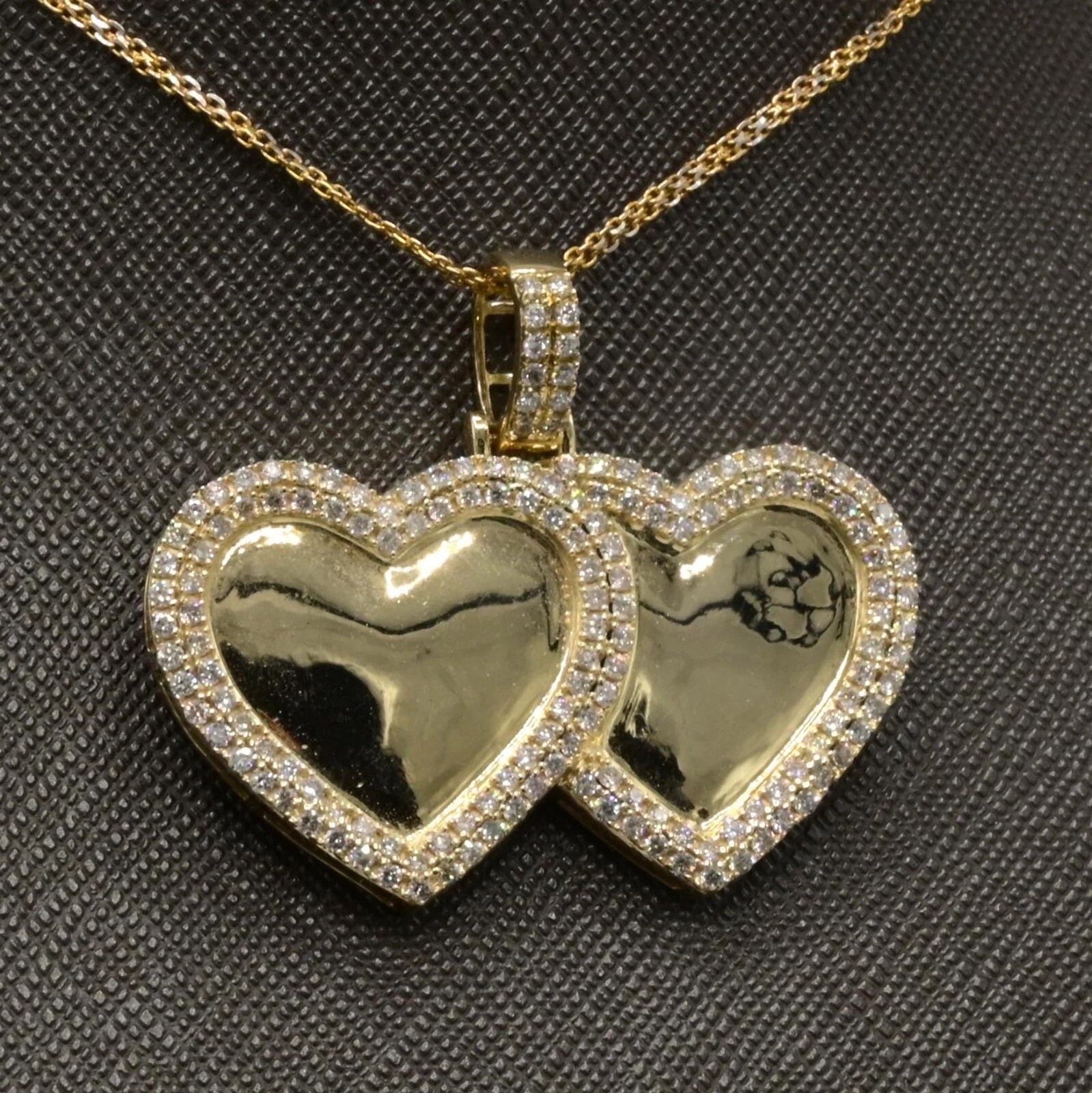 This 10k Yellow Gold Diamond Double Heart Memory Pendant is a stunning piece of fine jewelry perfect for special occasions like anniversaries, weddings, birthdays, and other celebrations. The pendant features two interconnected hearts, one of which is adorned with 1.79 carats of natural diamonds in H-I color, giving it a beautiful and elegant look. The pendant is crafted with high-quality 10k yellow gold and polished to a pristine finish, making it a timeless and unique gift for both men and women. It comes with a complimentary jewelry box and is professionally tested and stamped for authenticity.