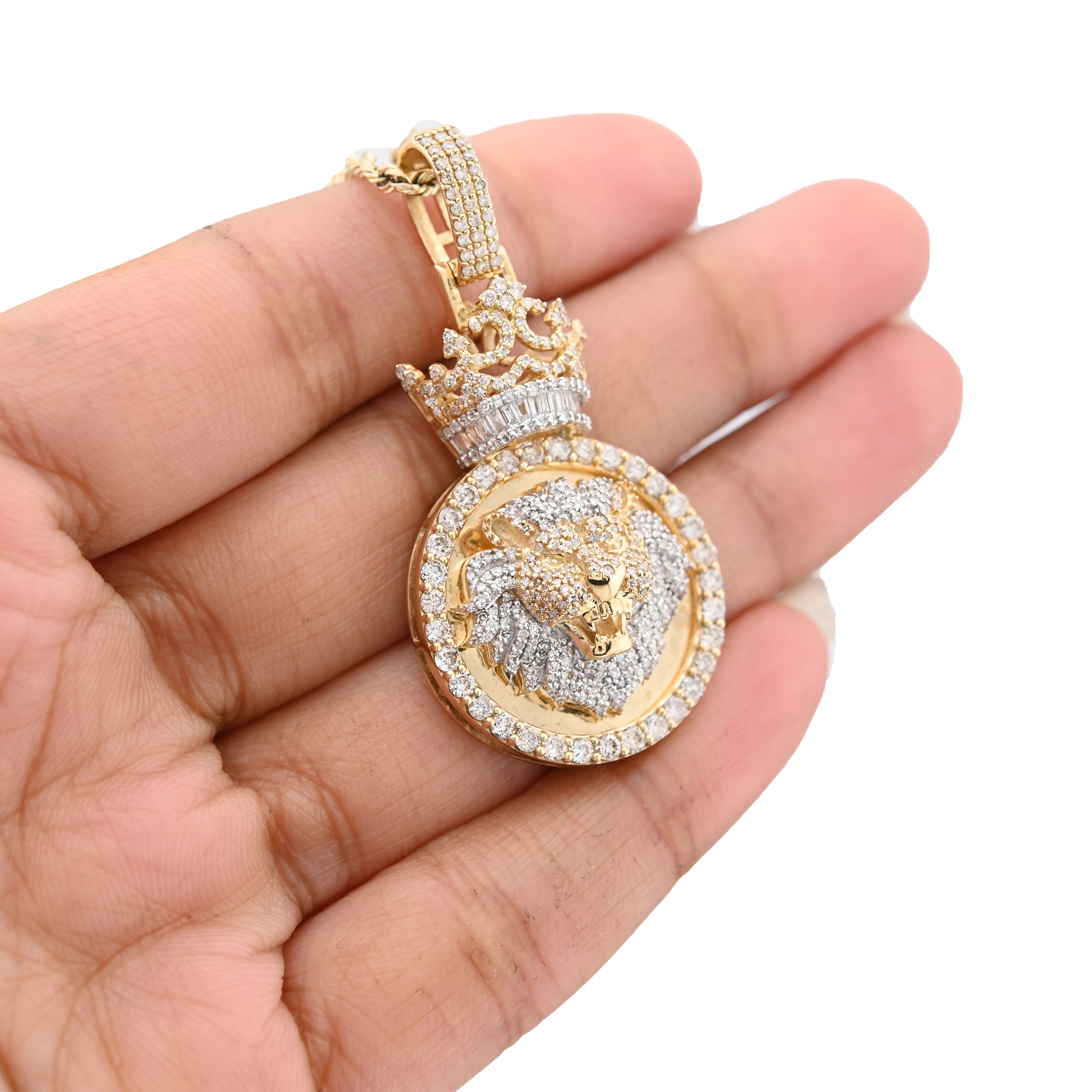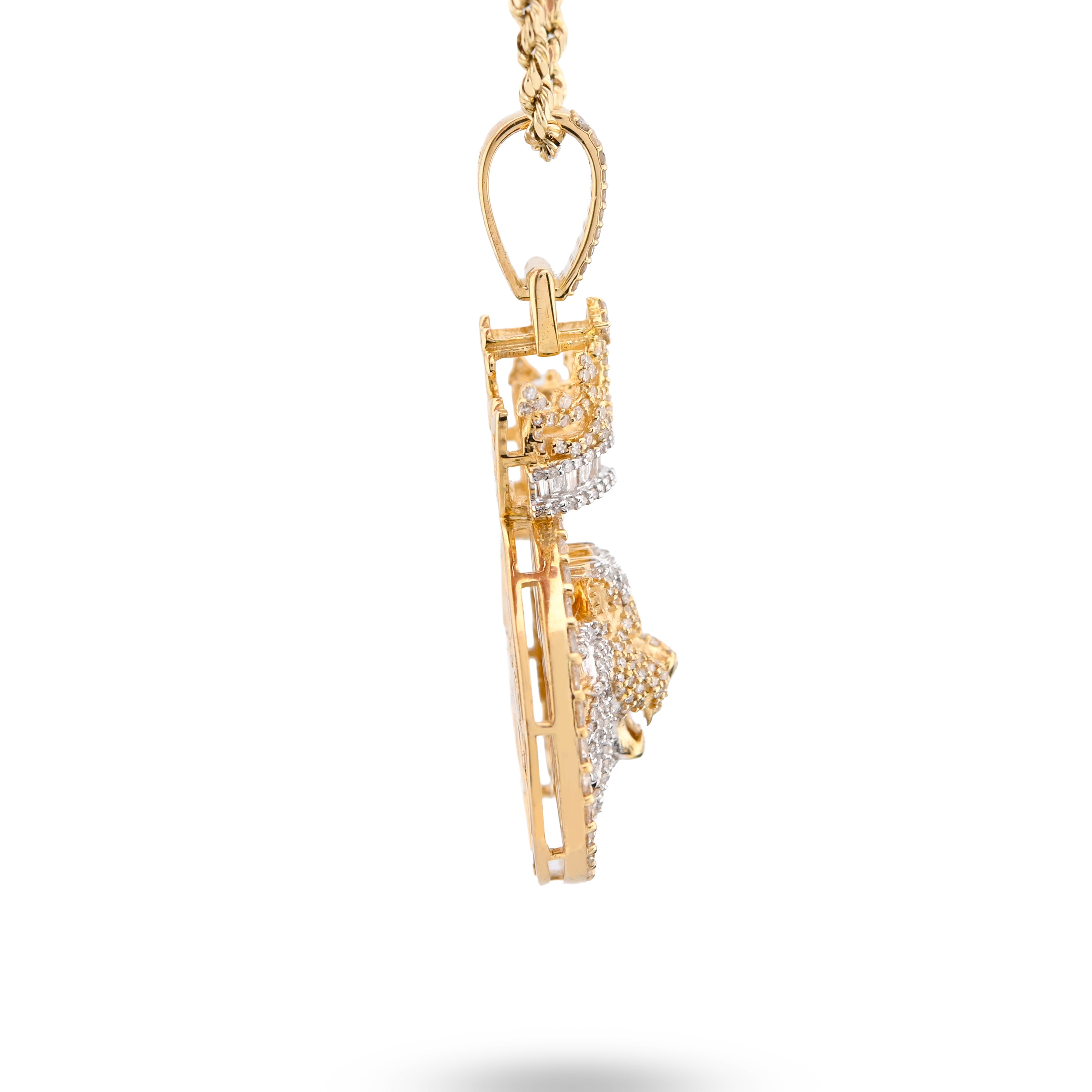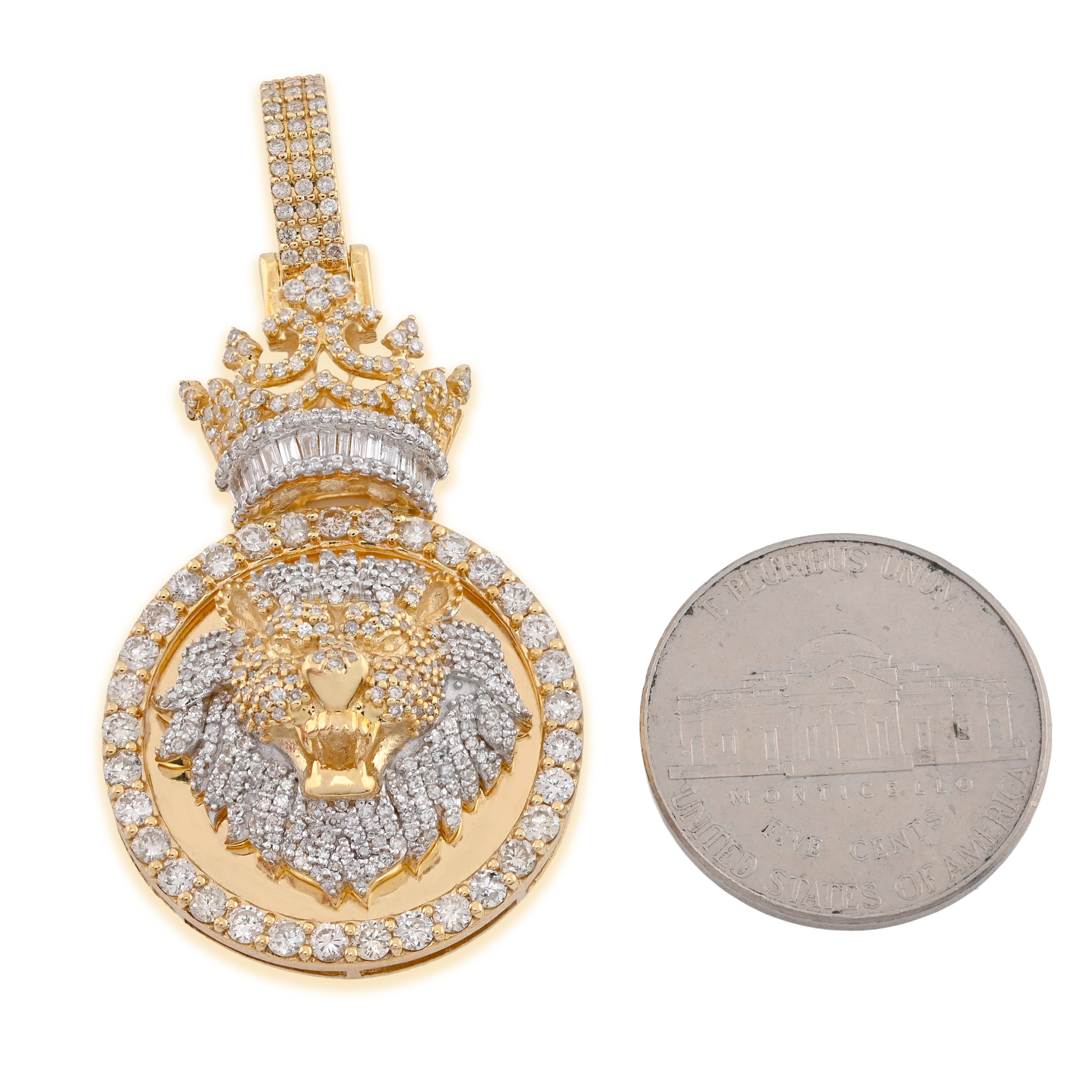 Command attention with this majestic lion crown pendant charm in lustrous 10k yellow gold. This statement piece showcases an impressive 3.75 carats of genuine round and baguette diamonds, creating unparalleled brilliance and sophistication. Weighing a substantial 12 grams, its bold presence celebrates strength, courage, and regal elegance. Perfect for those seeking distinctive jewelry that captures power and prestige while embodying exceptional craftsmanship, remarkable sparkle, and timeless luxury.