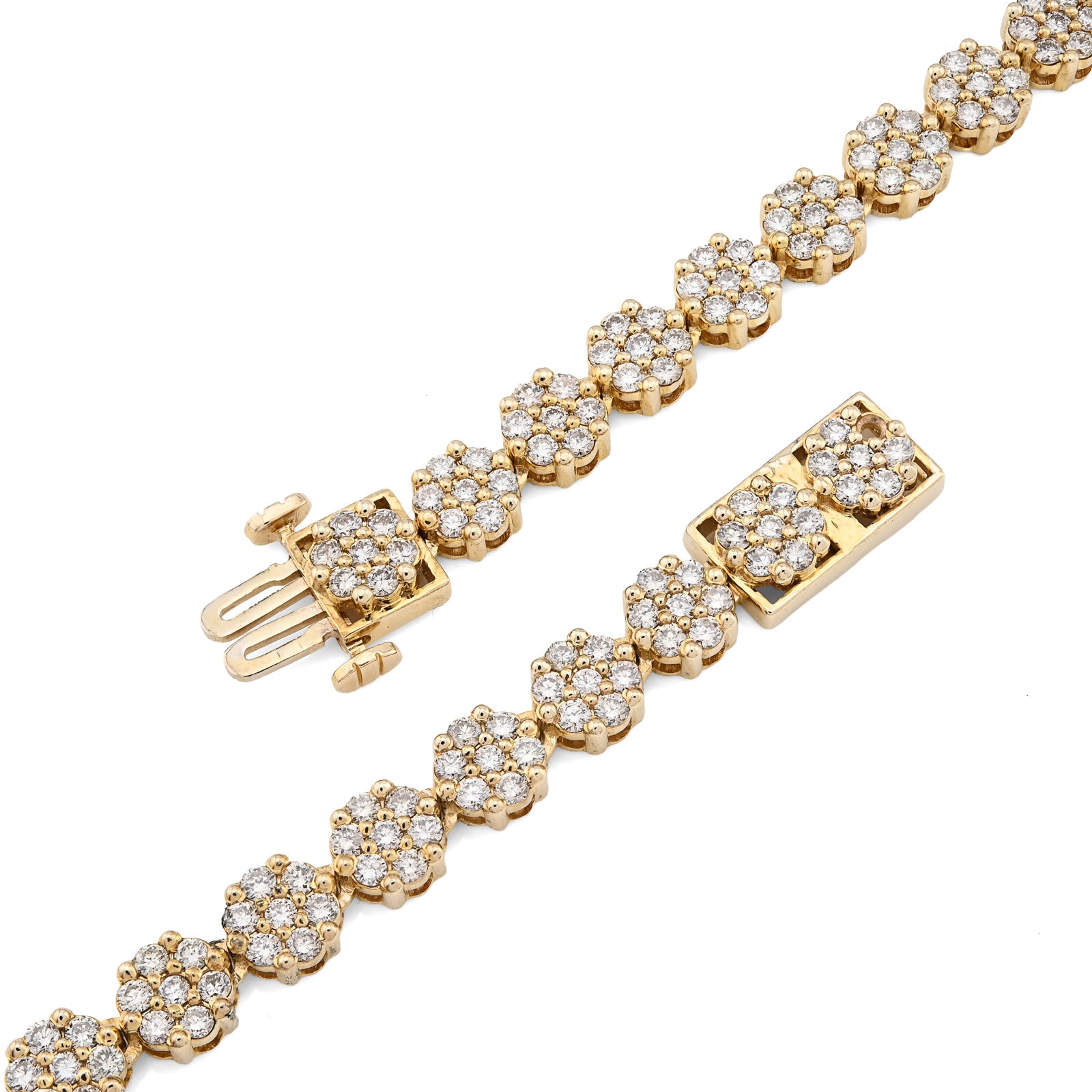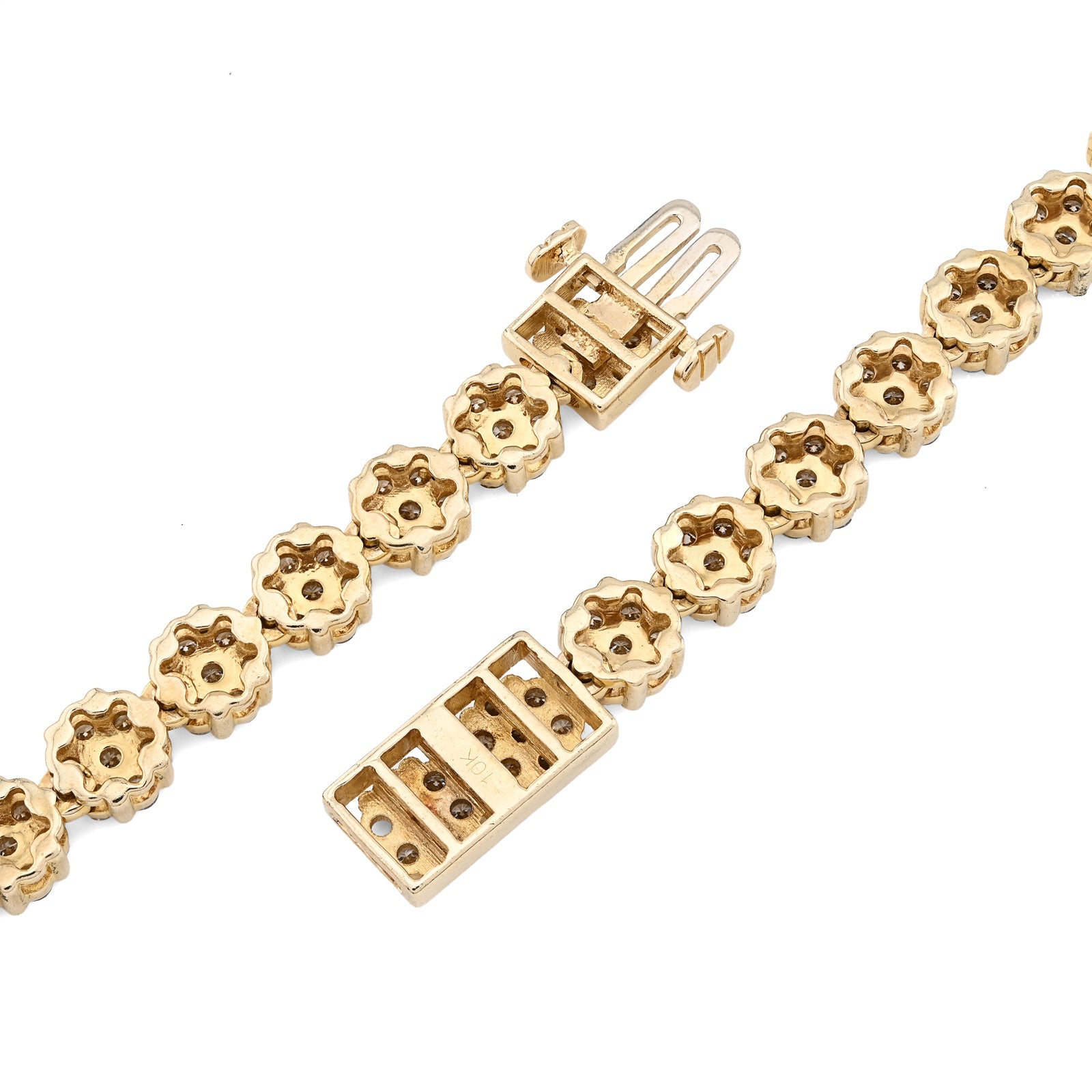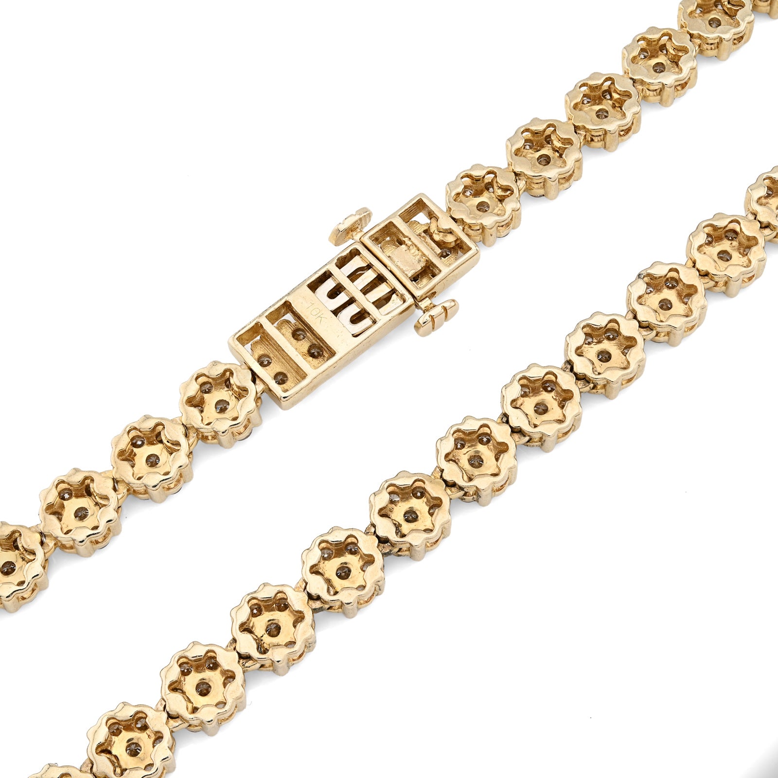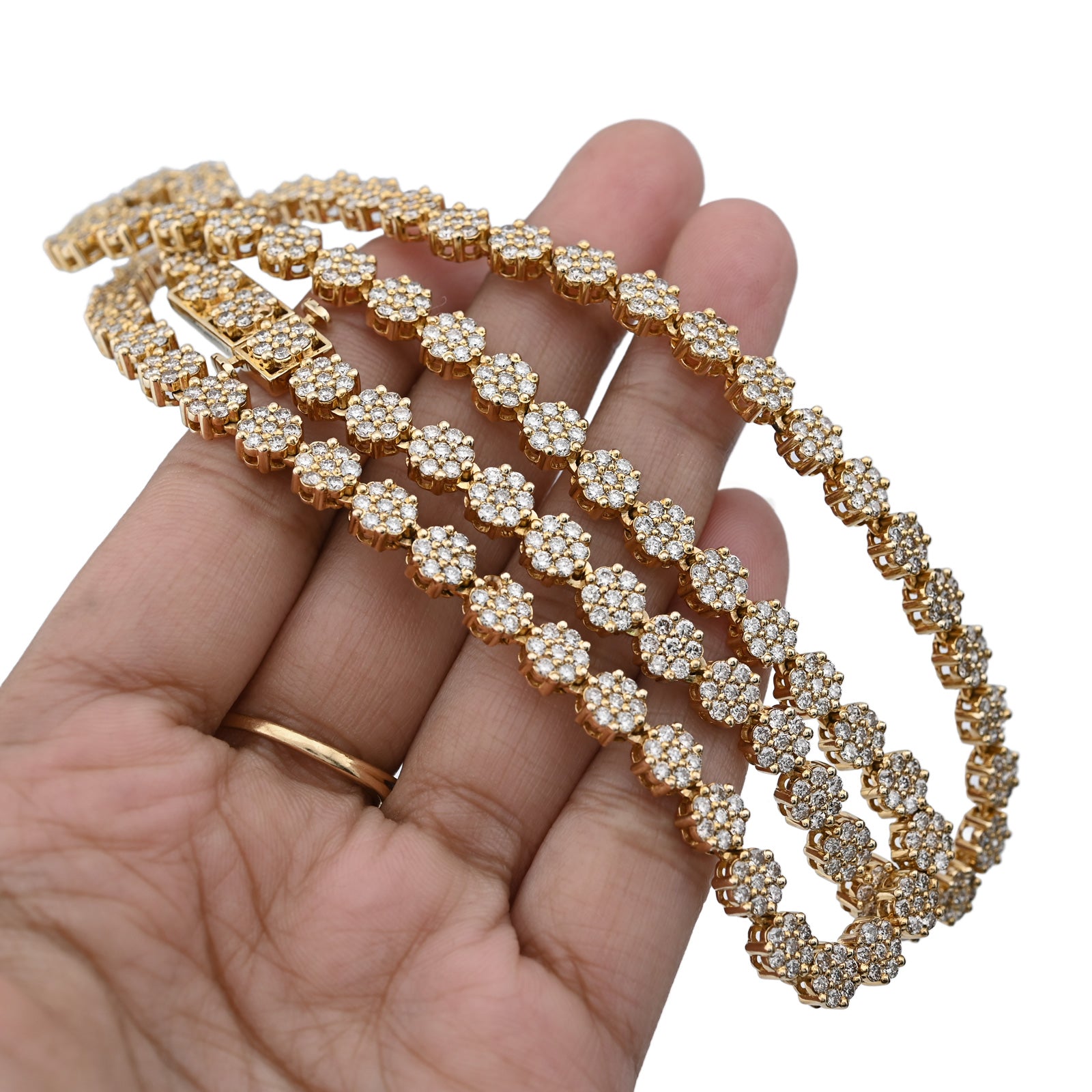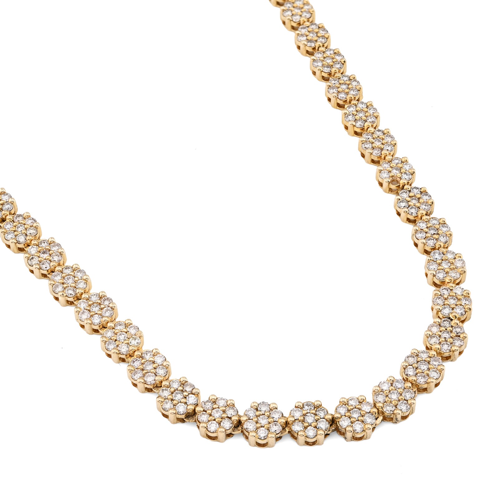 Blossom into luxury with this breathtaking 10k yellow gold tennis chain, where botanical elegance meets diamond brilliance. The delicate 6mm flower settings cradle 16 carats of natural diamonds, each petal precisely crafted to maximize light reflection and create mesmerizing sparkle. The intricate floral motif transforms traditional tennis chain design into wearable art—a garden of radiance that celebrates both nature's beauty and exceptional craftsmanship. Weighing 49.9 grams, this chain delivers substantial presence and authentic quality construction that affirms genuine materials and meticulous attention to detail. The warm, luminous finish of 10k yellow gold provides an elegant foundation that enhances diamond brilliance while developing character with time. The flower settings create dimensional depth and visual interest, appealing to those who appreciate sophisticated design nuance. This necklace transcends occasion, equally stunning at intimate gatherings or grand celebrations—a transformative investment piece for the discerning collector.
