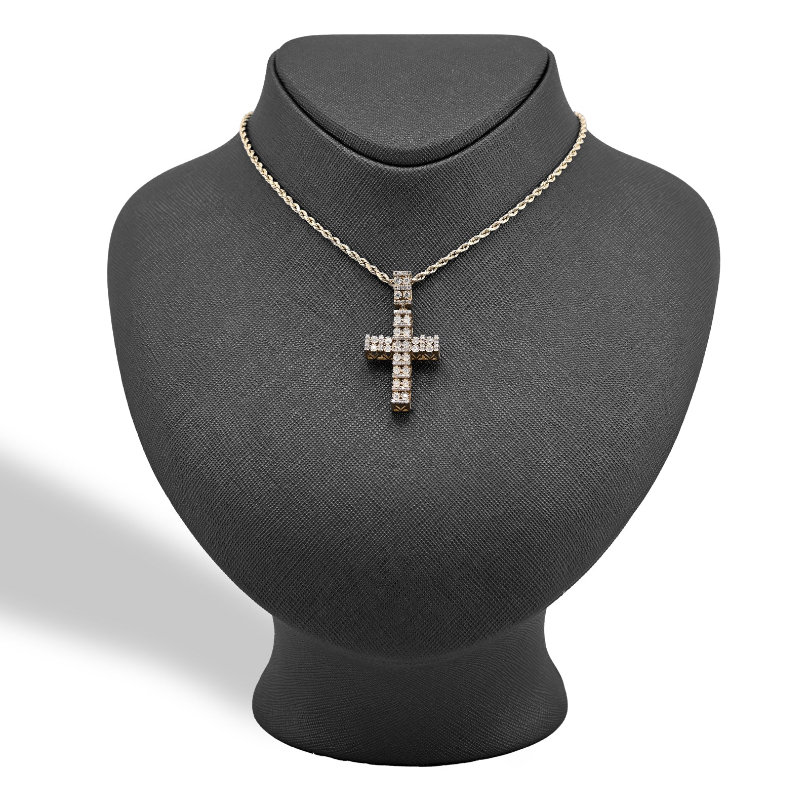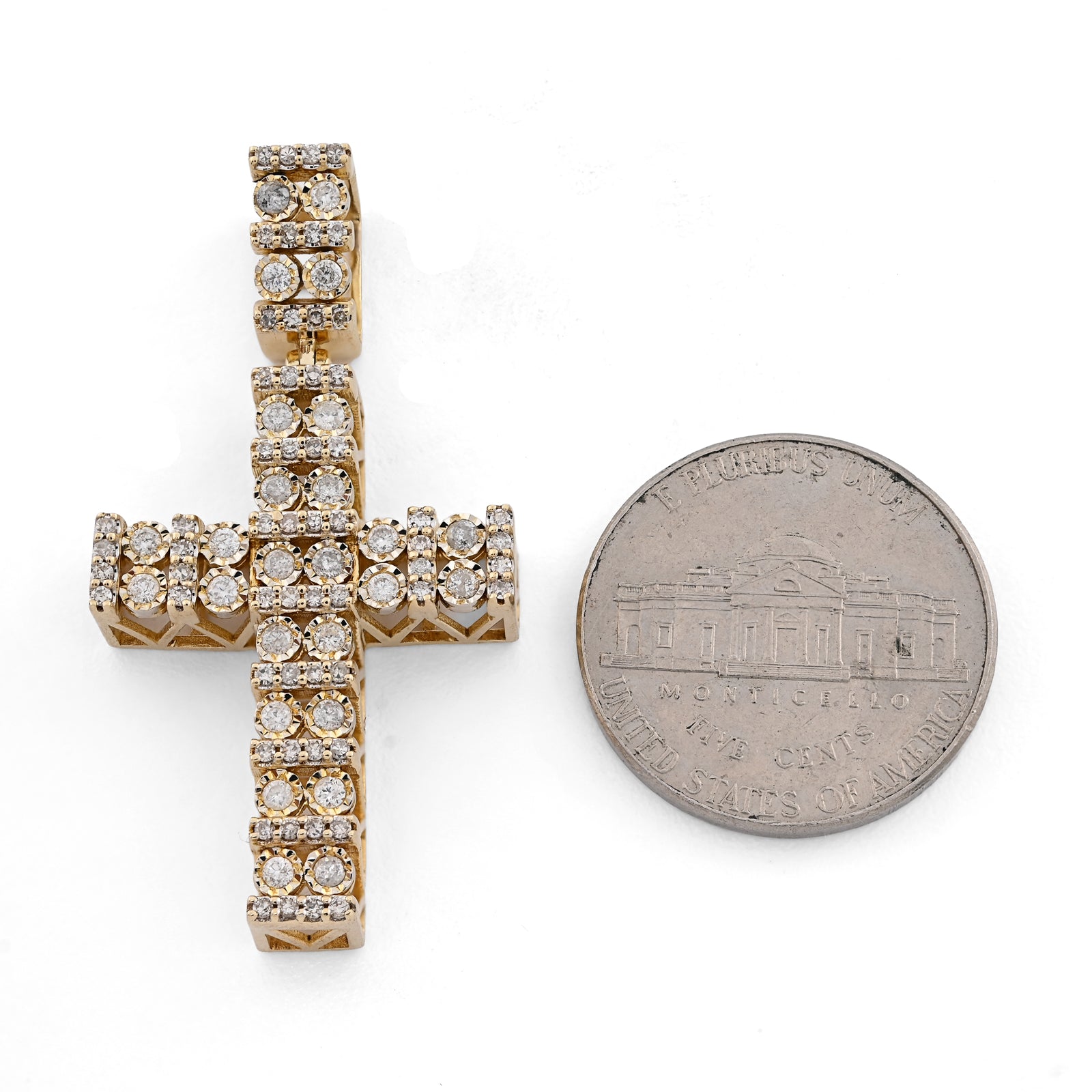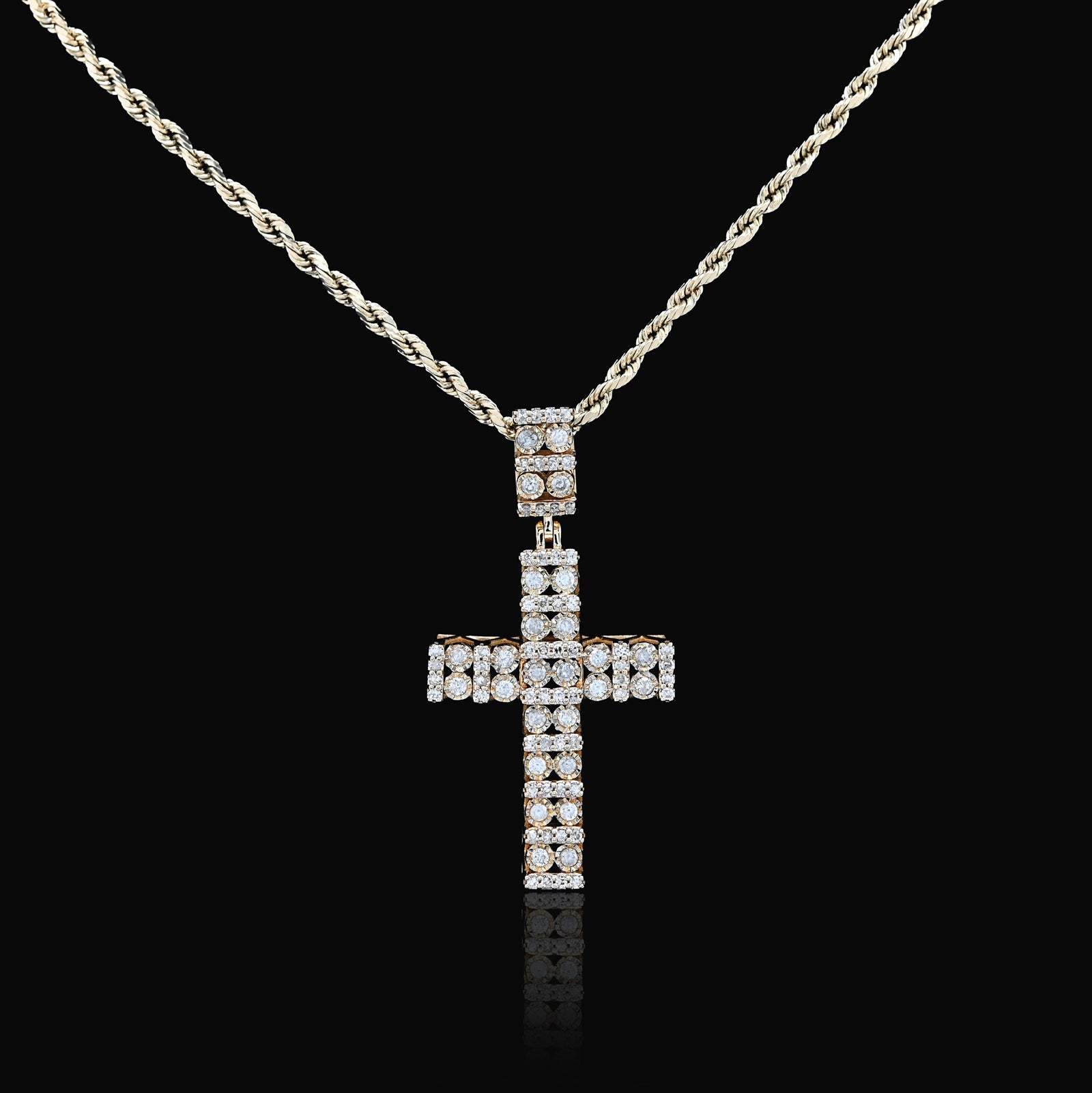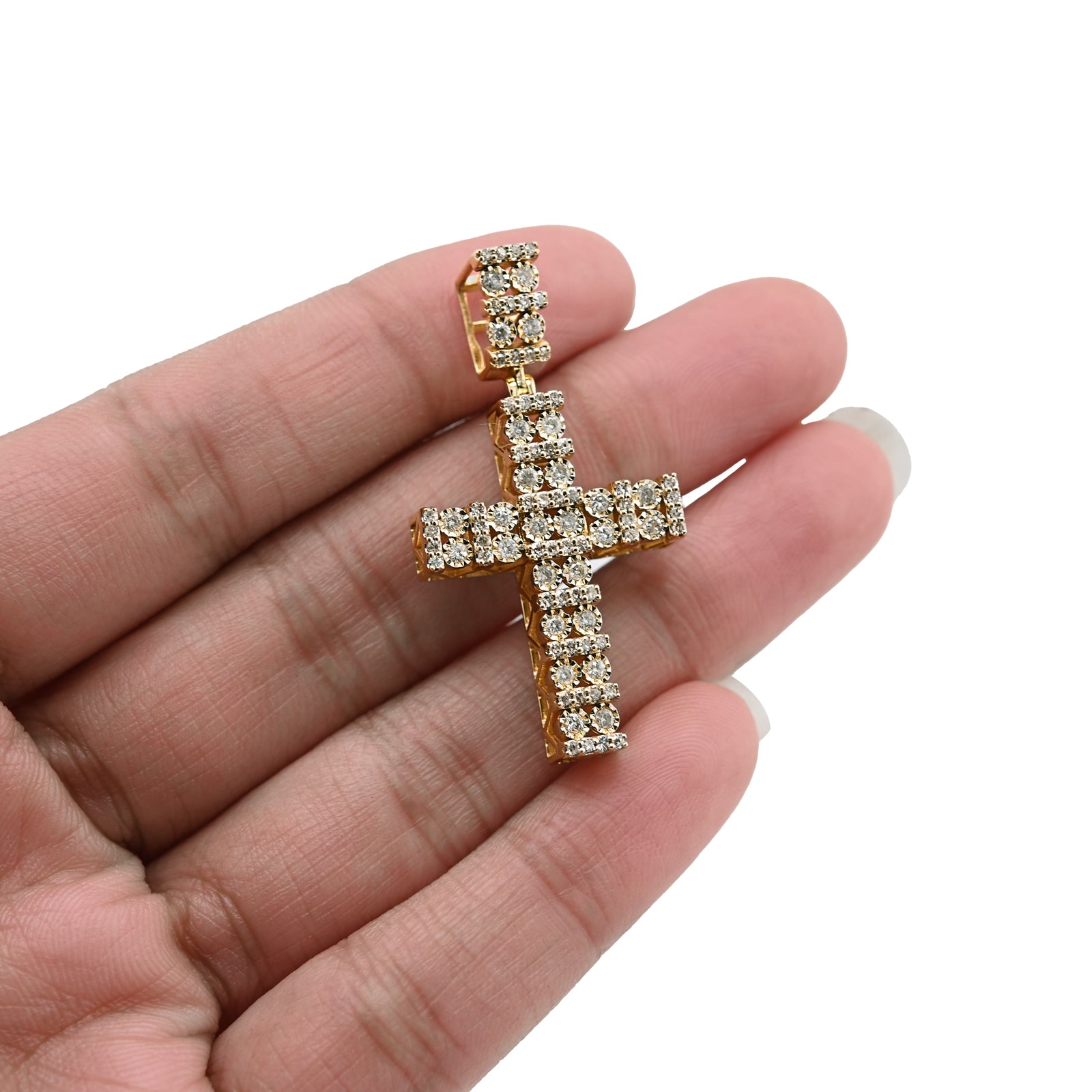 Radiate divine elegance with this exquisite double cluster cross pendant in warm 10k yellow gold. Featuring 1 carat of pure diamonds arranged in dual clusters that frame the cross with breathtaking brilliance, this design maximizes sparkle and visual impact. The innovative cageback setting allows light to flow through the pendant, enhancing the diamonds' natural radiance. At 6 grams, it delivers impressive presence with refined proportions ideal for layering or standalone wear. A sophisticated religious charm that merges contemporary design with timeless faith symbolism, crafted for those who appreciate exceptional gemstone artistry.
