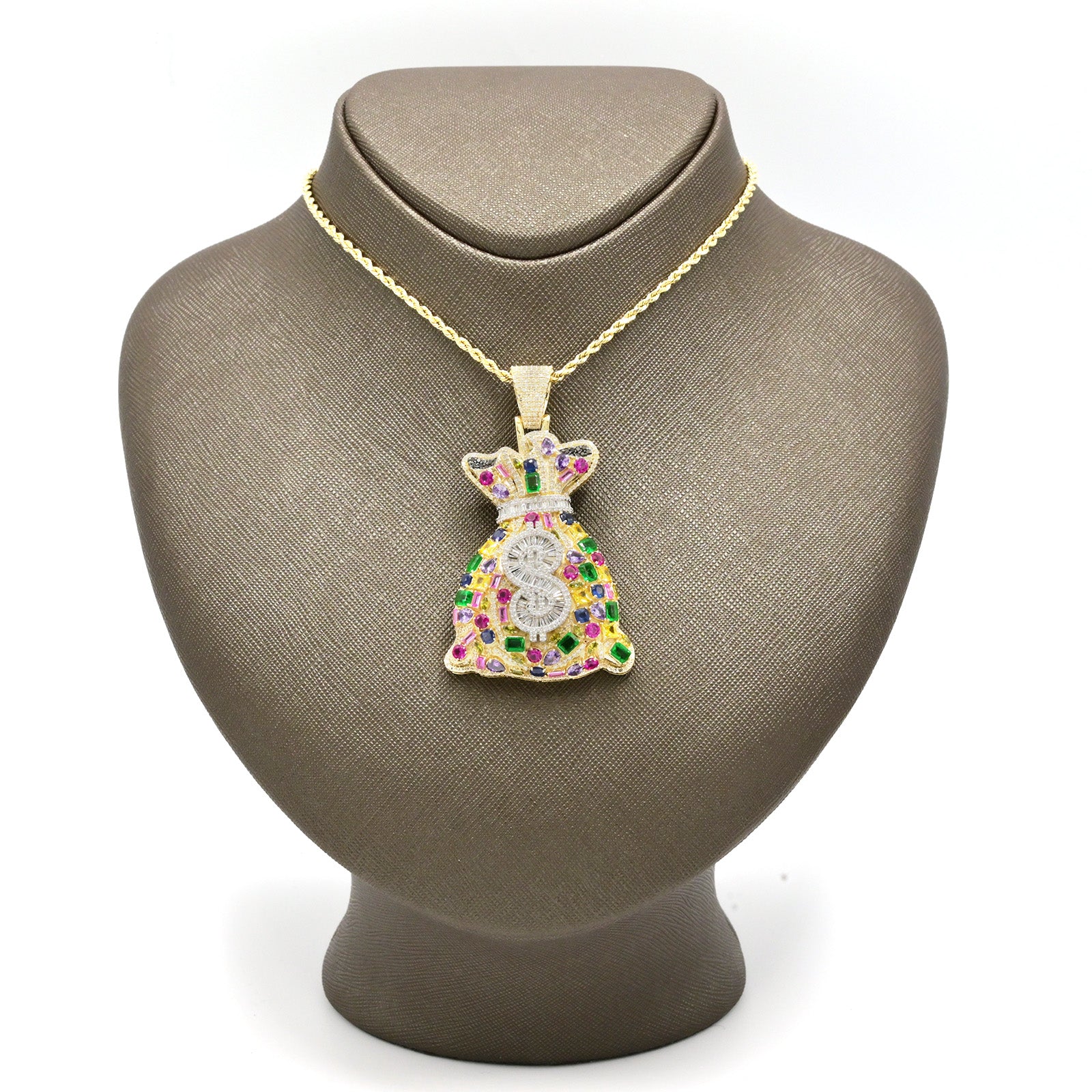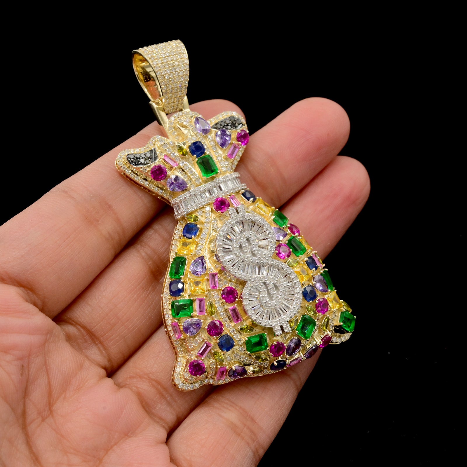 10k Yellow Gold 3.1CTW Round/Baguette Diamond Gems Stone Money Bag Charm 24.6gms.