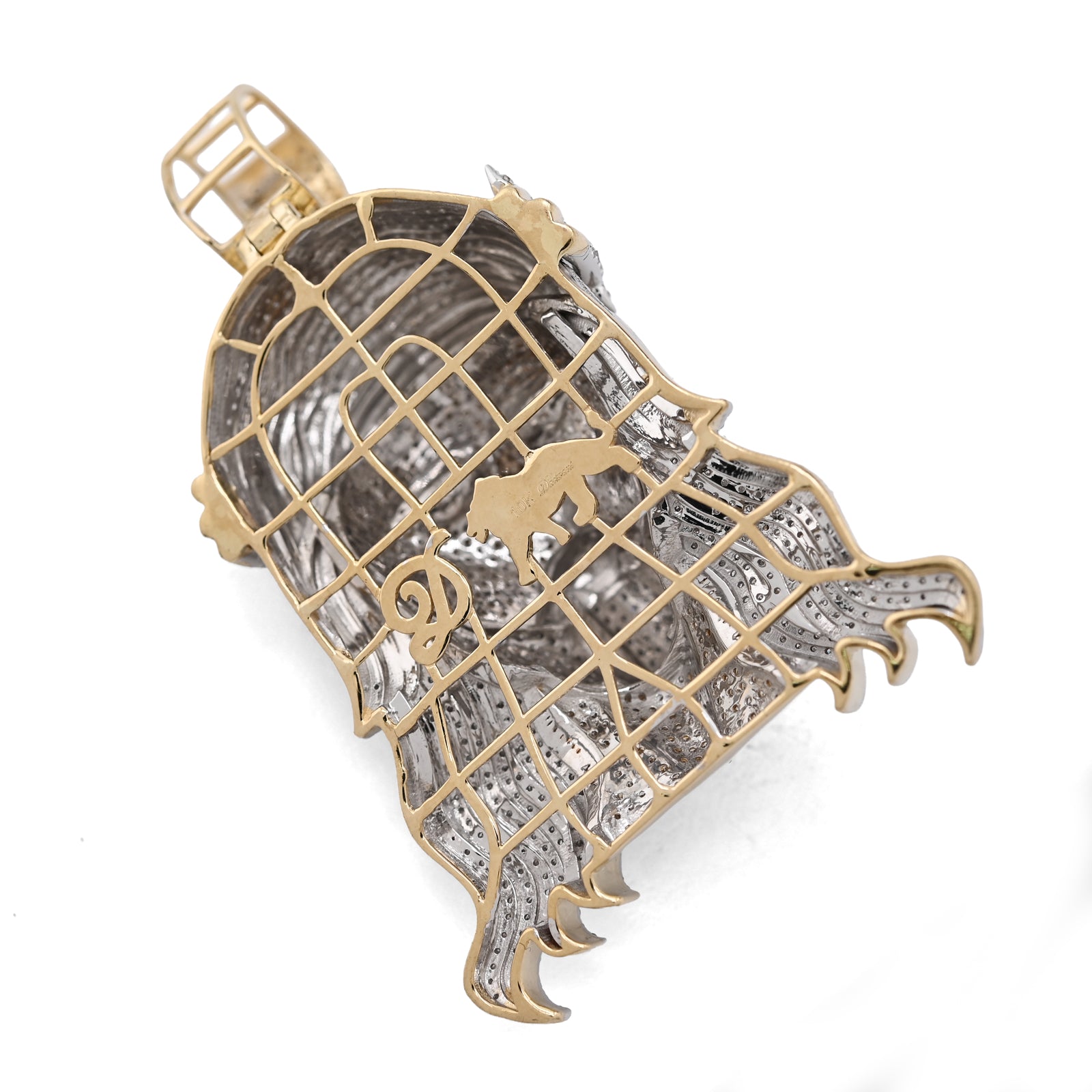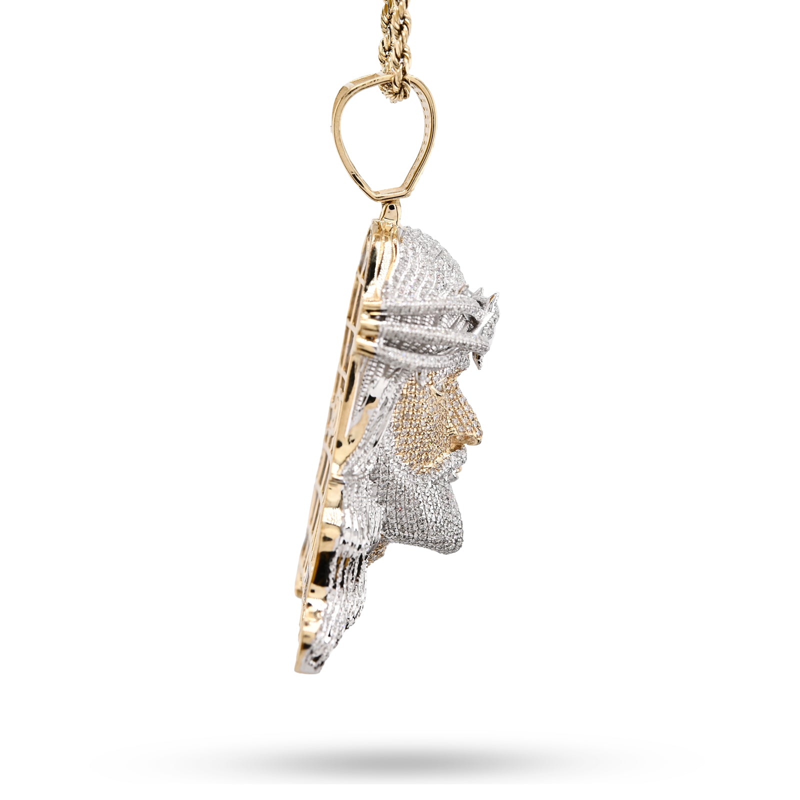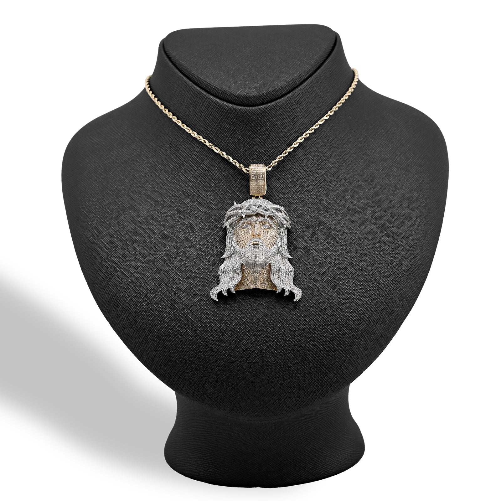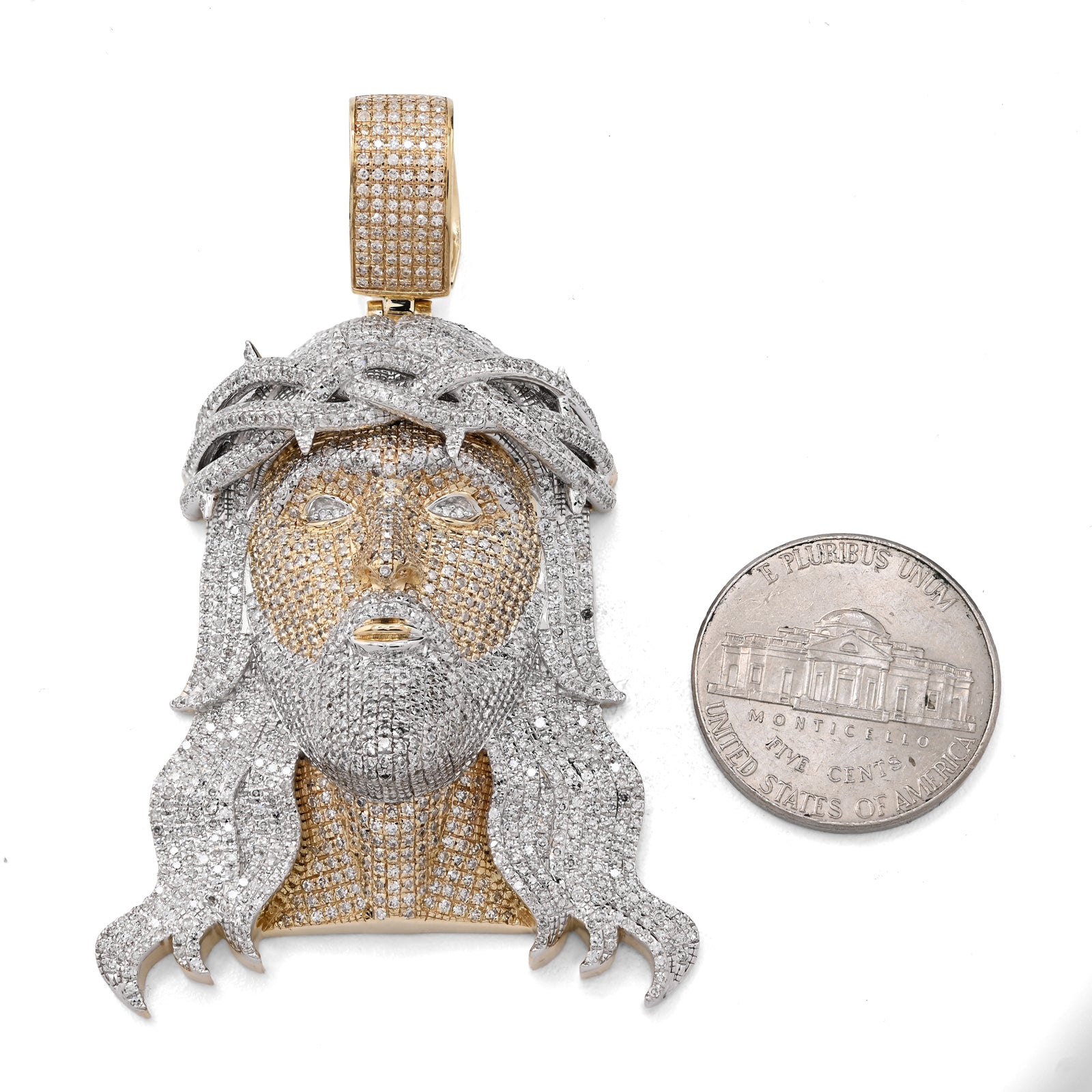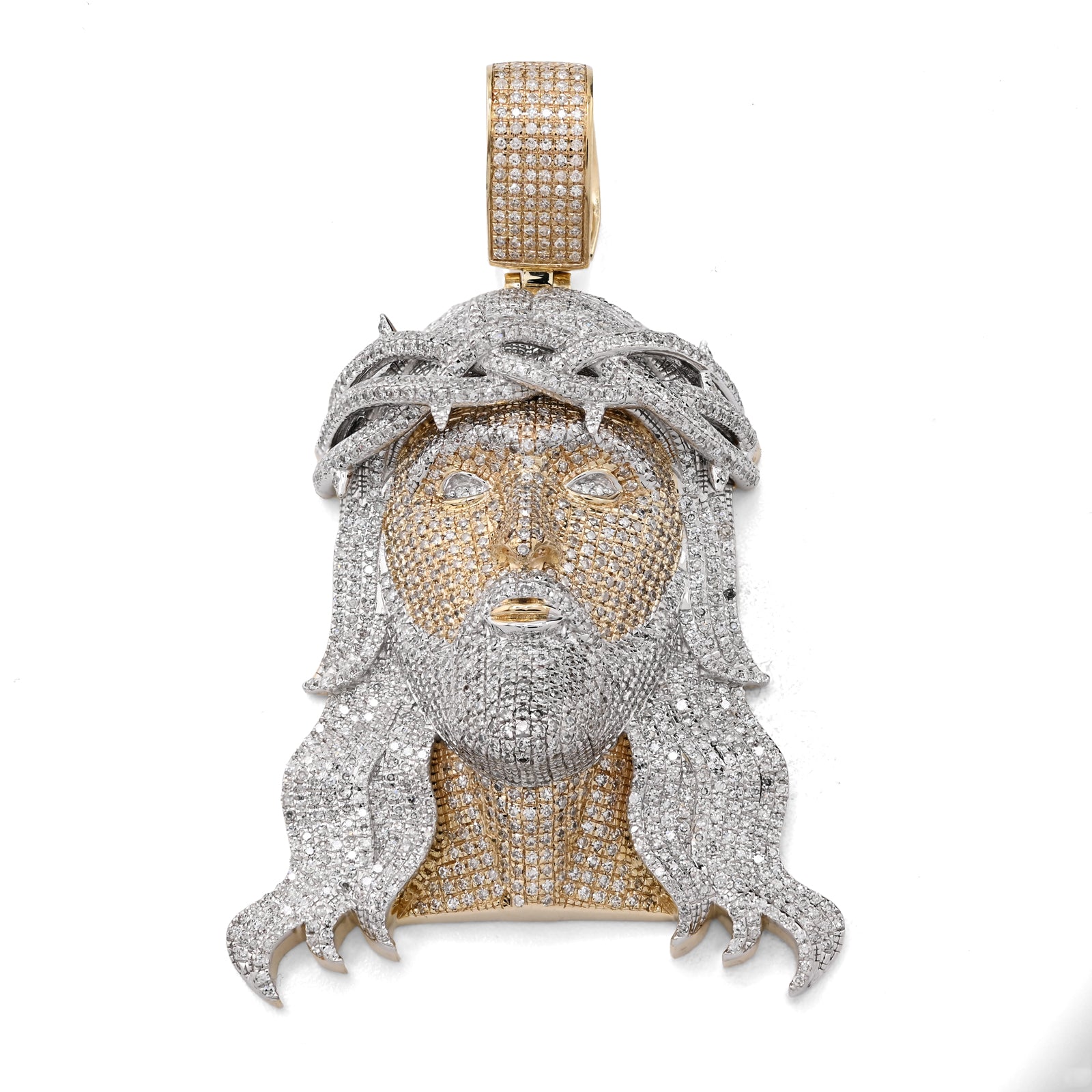 Proclaim your faith with this powerful Jesus head pendant in rich 10k yellow gold, completely iced out with 3.75 carats of natural diamonds. Every facet gleams with brilliant radiance, honoring the sacred image through exceptional gemstone artistry and luxury craftsmanship. Weighing 24.2 grams, this substantial religious charm makes an unmistakable statement of devotion and spiritual conviction. The comprehensive diamond setting elevates this beyond traditional religious jewelry, creating a heirloom-quality piece that celebrates Christ with uncompromising elegance and refinement. Perfect for those seeking to wear their faith boldly and beautifully.