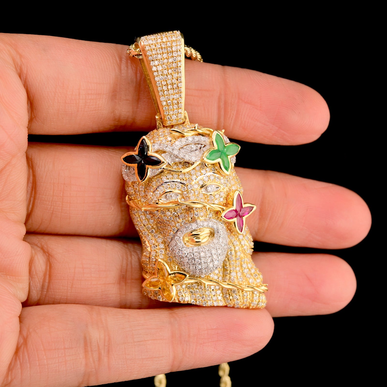 This exquisite 10k yellow gold pendant showcases a meticulously crafted Jesus head design, adorned with 4.05 carats of brilliant diamonds and vibrant color stones. Weighing 15.3 grams, this substantial charm combines spiritual significance with refined artistry. The interplay of precious gemstones creates a luminous, multidimensional appearance that captures light beautifully. Perfect for those seeking a meaningful piece that balances devotional symbolism with luxury craftsmanship, this pendant makes a distinguished statement whether worn daily or reserved for special occasions.