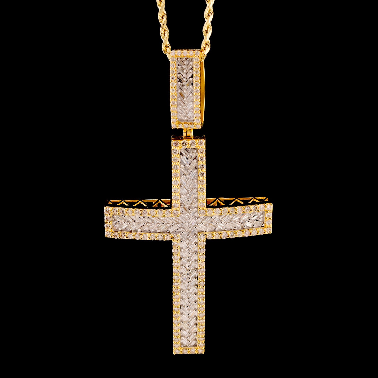 This contemporary 10k yellow gold cross pendant reimagines religious symbolism through a dynamic zig zag design, enhanced with 4.3 carats of round and baguette diamonds. Weighing 18.2 grams, the piece strikes an elegant balance between spiritual meaning and modern aesthetic sensibility. The alternating diamond cuts—brilliant rounds interspersed with geometric baguettes—create visual movement and sophisticated texture across the angular cross form. An ideal choice for those seeking a religious charm that honors tradition while embracing innovative design and premium diamond craftsmanship.