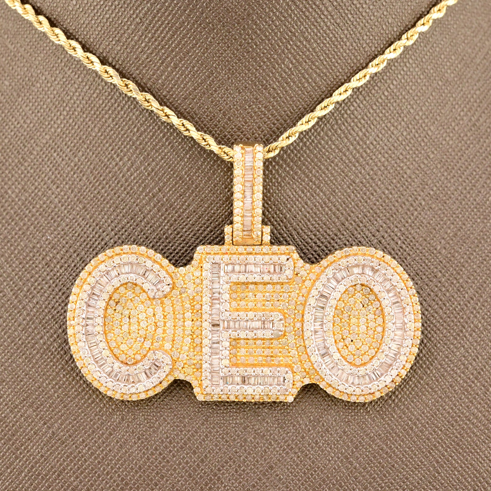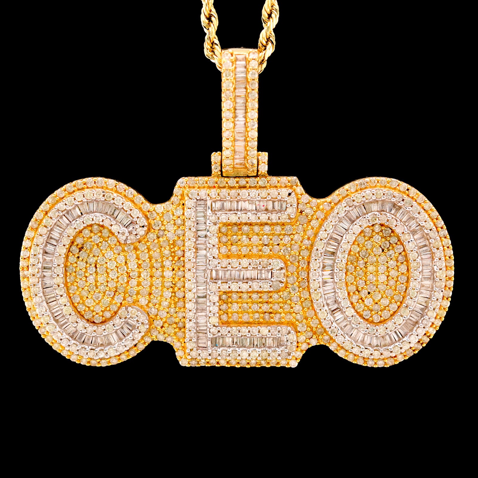 Crafted in 10k yellow gold, this CEO solid back charm features a stunning 6.5 carat total weight of pure round and baguette diamonds. Weighing 24.1 grams, it combines intricate design with substantial presence, making it a refined statement piece. The blend of diamond shapes enhances light reflection, ensuring exceptional brilliance and sophistication for discerning collectors and enthusiasts.