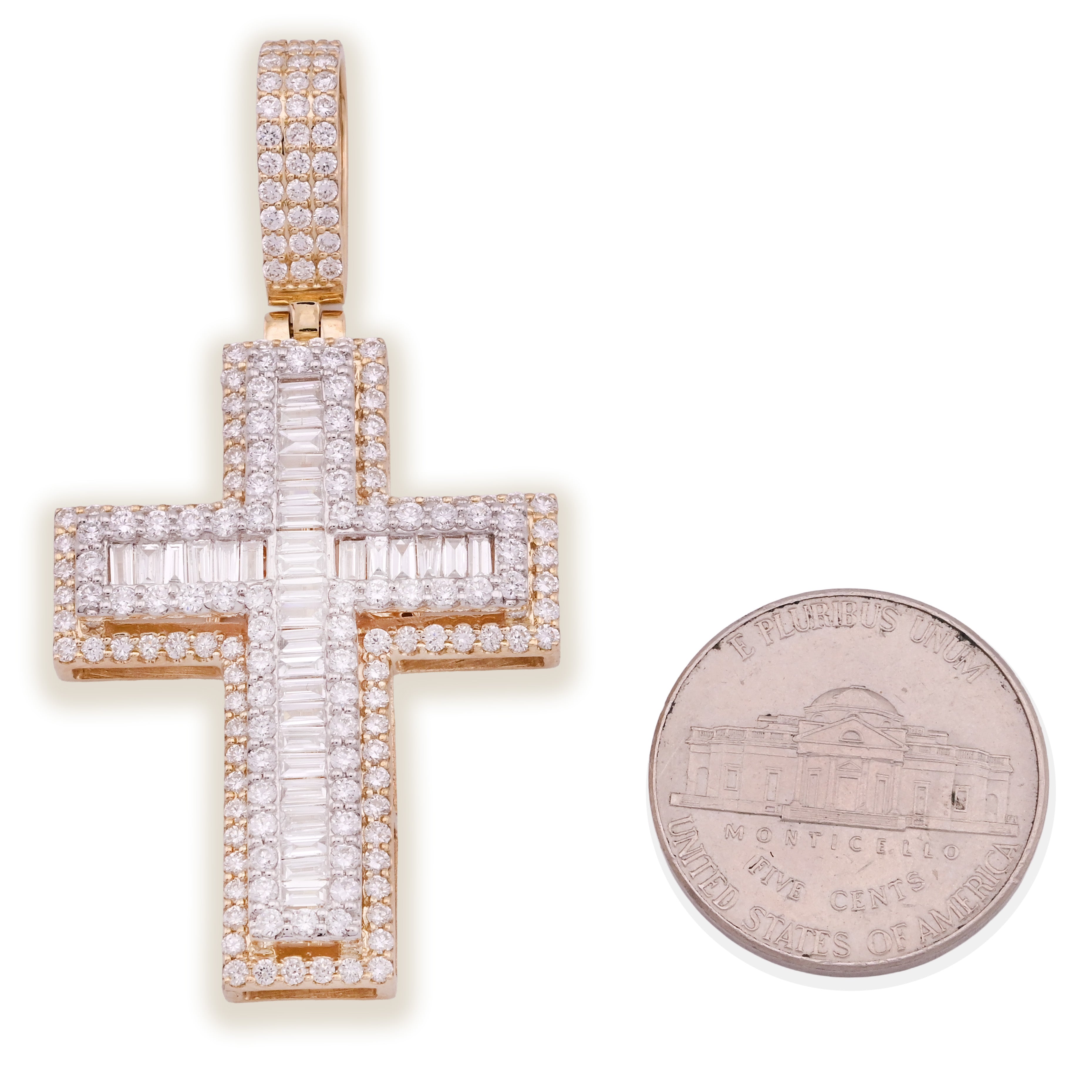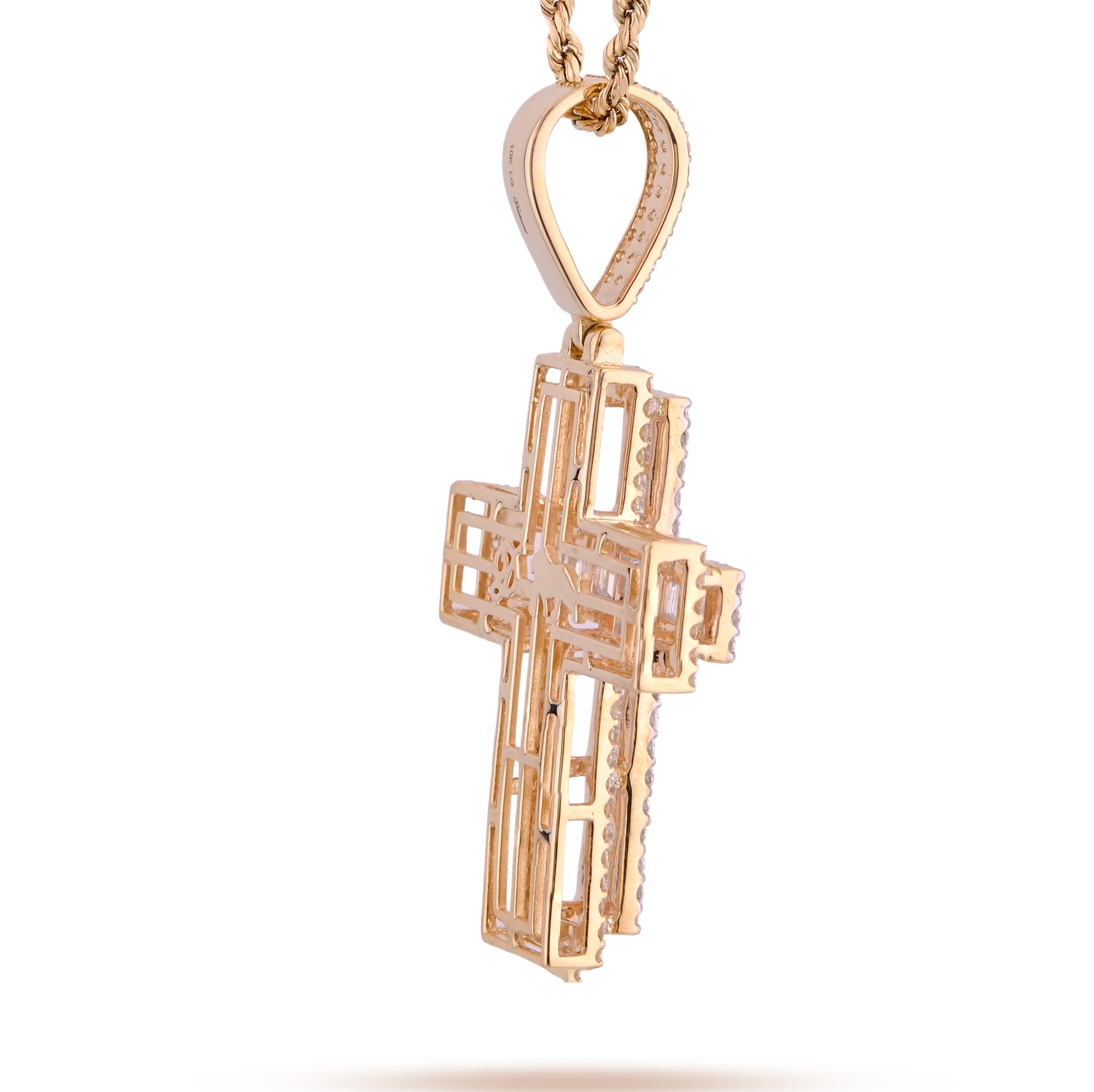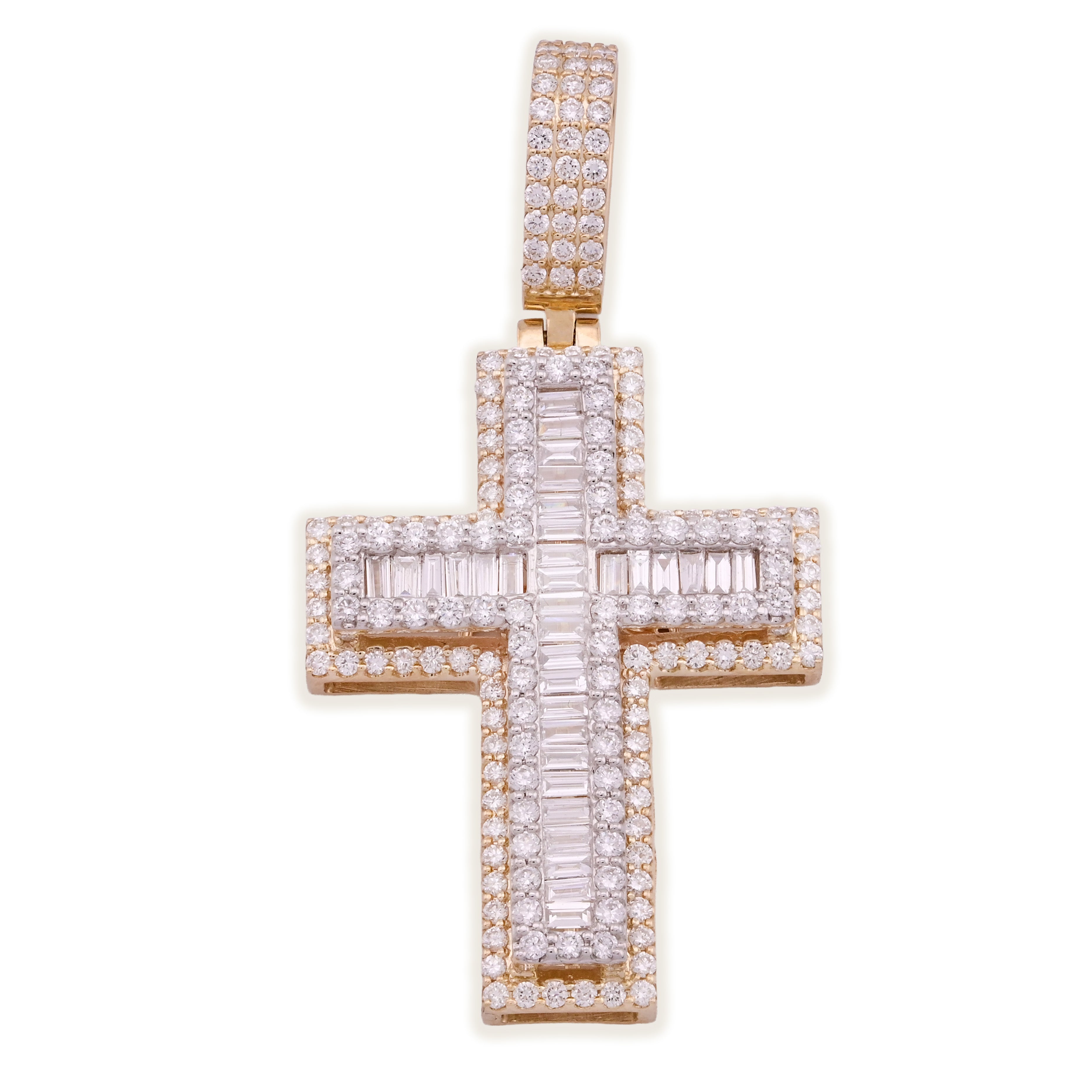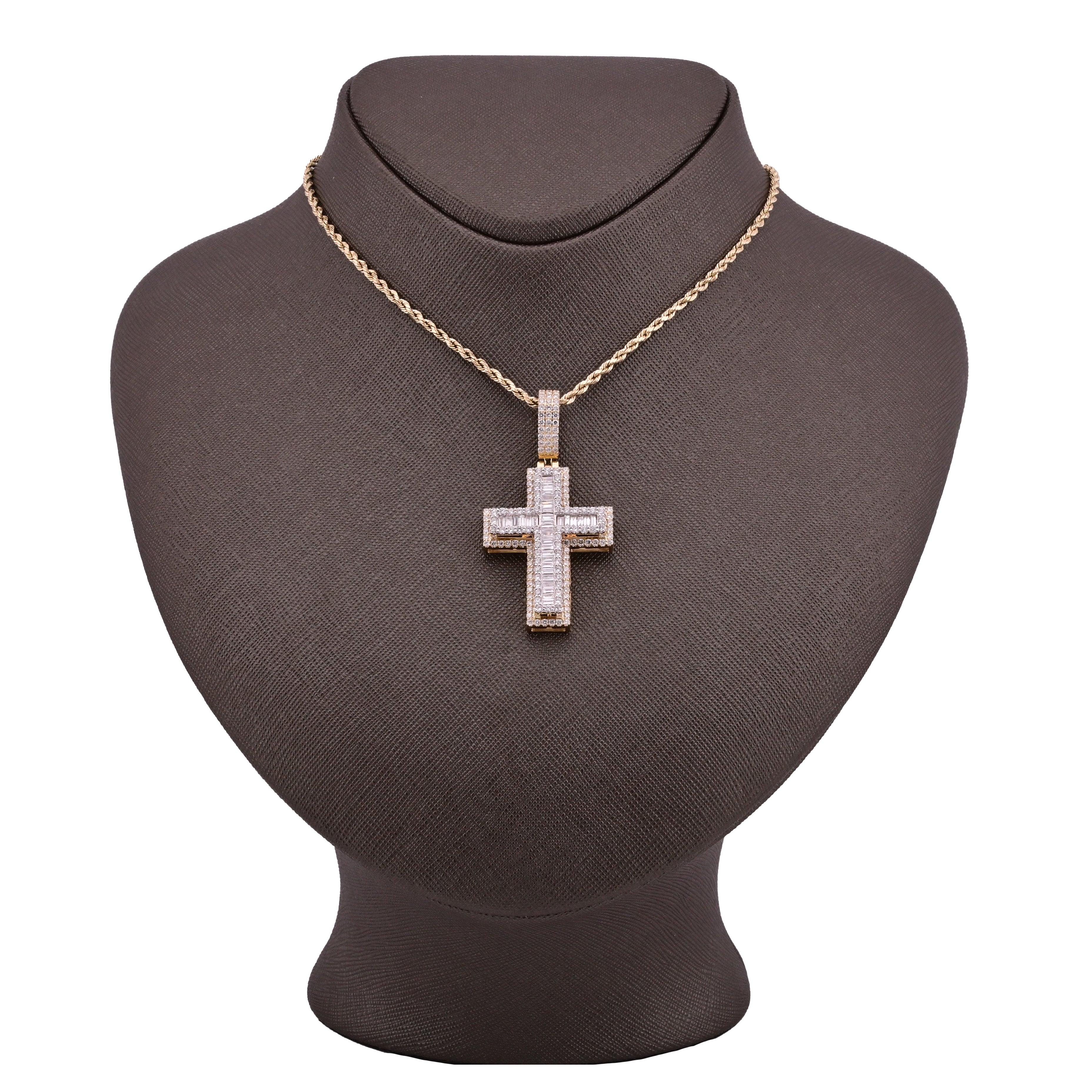 Discover refined elegance with this exquisite 10k yellow gold cross pendant, weighing 9.6 grams of premium craftsmanship. The design showcases 2.8 carats of lab-grown diamonds in a harmonious blend of round and baguette cuts, creating dynamic sparkle and visual depth. Lab-grown diamonds deliver the same brilliance and durability as mined stones while reflecting modern values of sustainability. Whether worn as a standalone pendant or layered charm, this piece offers timeless spiritual symbolism wrapped in contemporary luxury and sophistication.