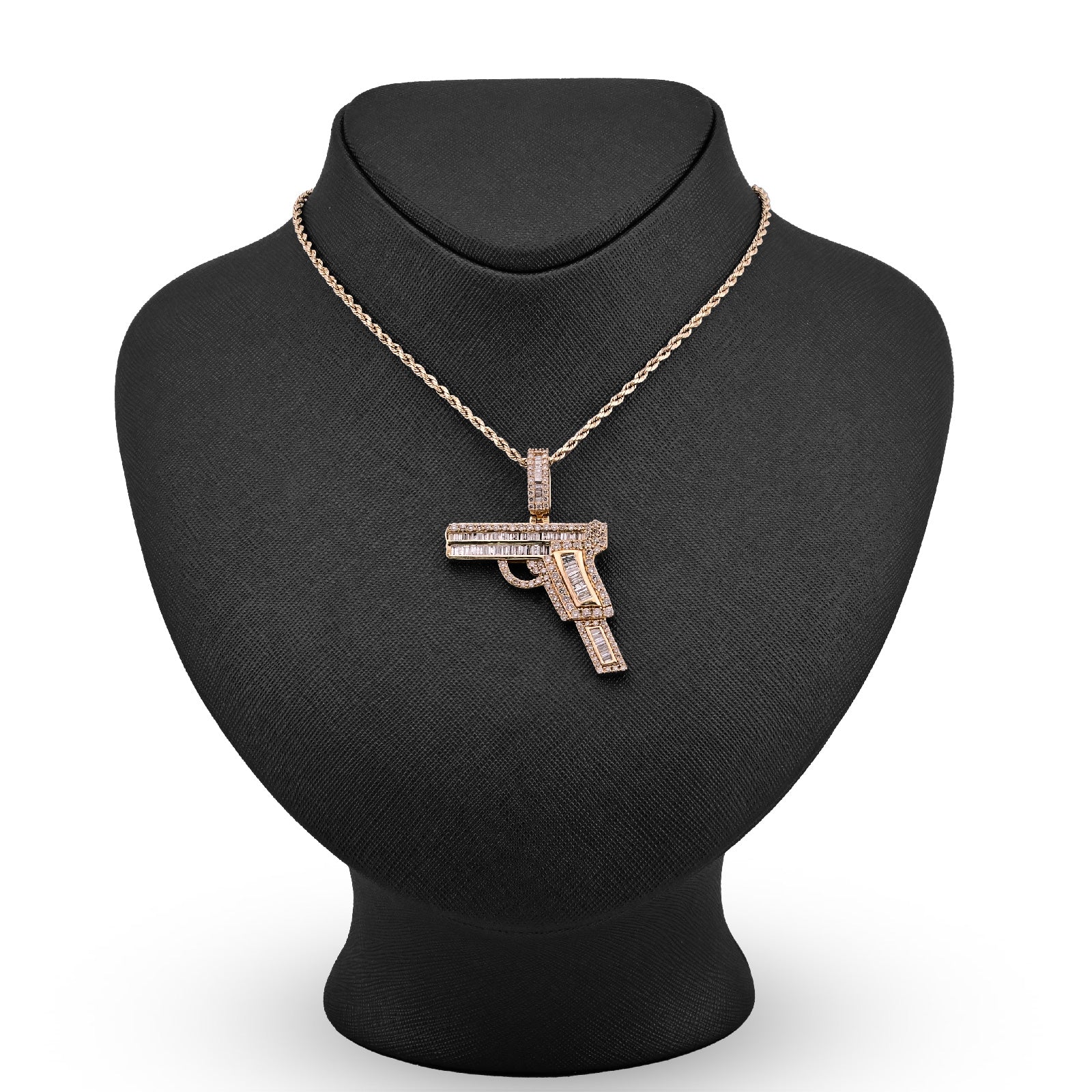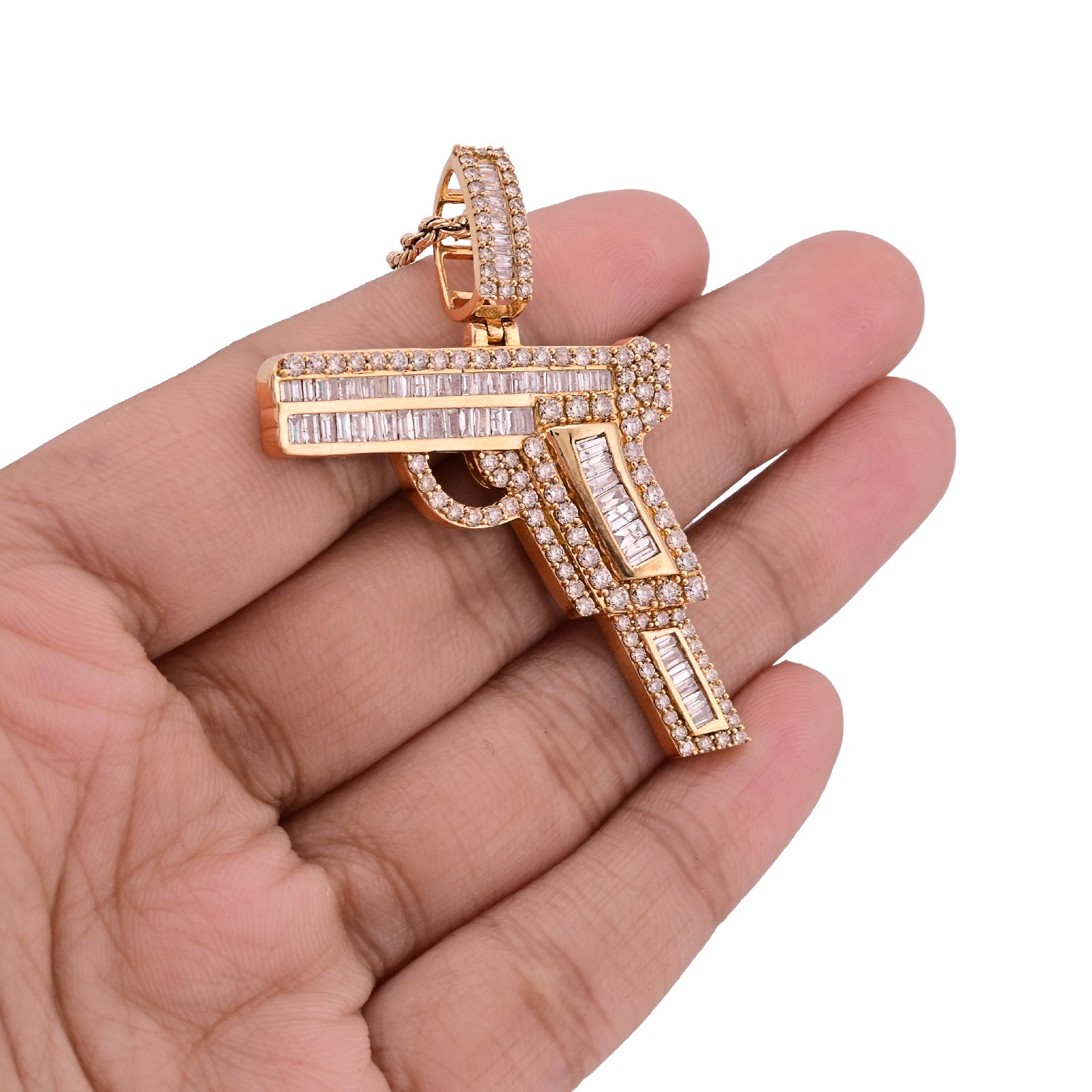 Commanding and unapologetic, this diamond-laden gun pendant makes a powerful statement for the modern man who values strength and authenticity. Crafted in 10k yellow gold weighing 9.9 grams, the design showcases an impressive 4 carats of natural round and baguette diamonds that elevate the firearm motif with exceptional sparkle and dimension. The generous diamond weight creates substantial visual impact, while the yellow gold setting adds warmth and prestige. This pendant transcends typical jewelry, serving as a bold declaration of personal identity and conviction for those unafraid to wear their beliefs with confidence and style..