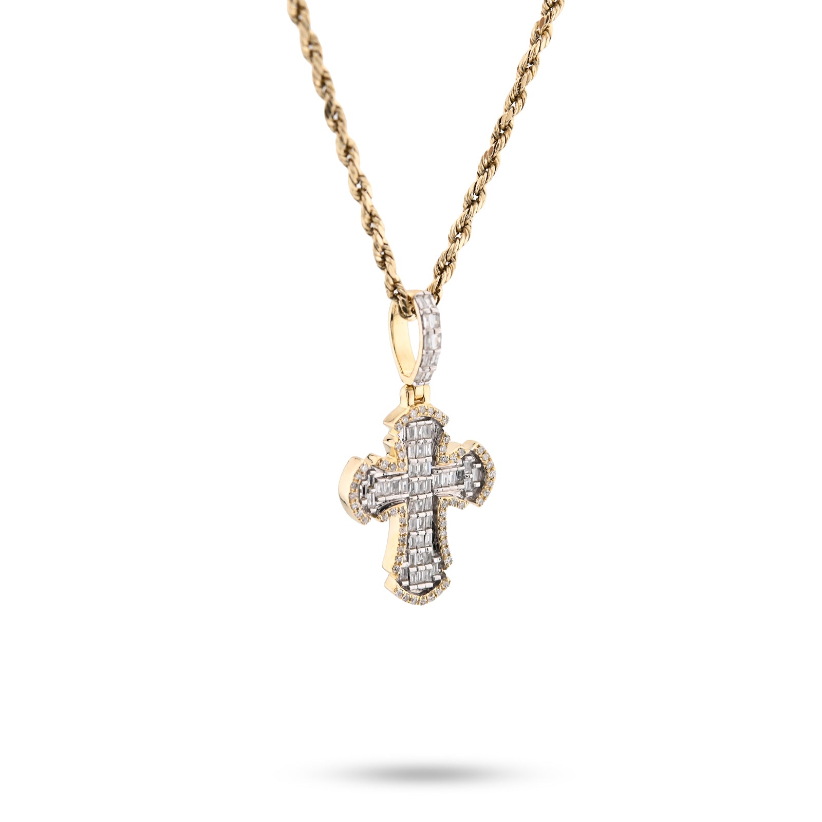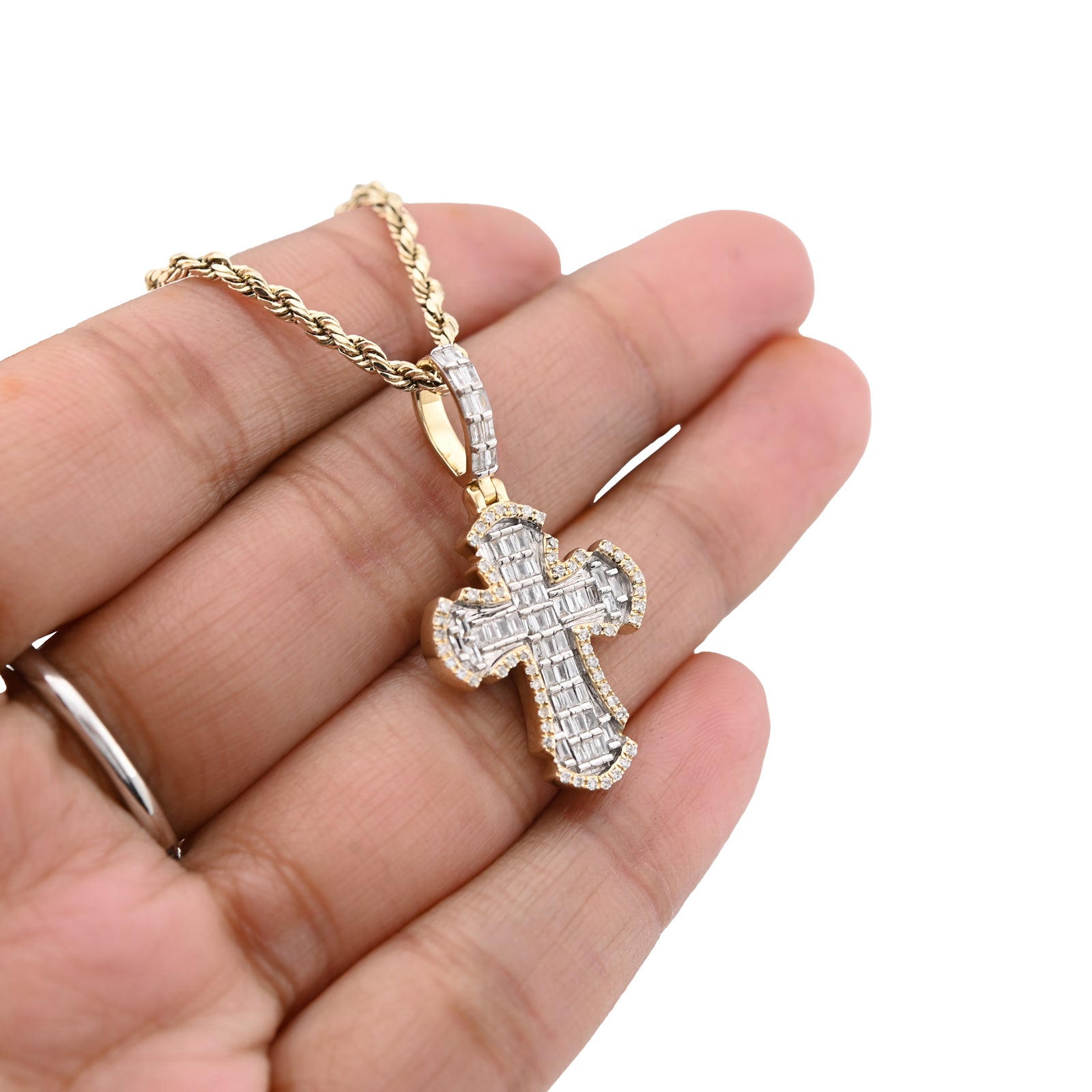 This elegant 10k yellow gold cross pendant delivers understated refinement with purposeful design. Adorned with 0.43 carats of natural round and baguette diamonds, the piece balances spiritual symbolism with subtle sparkle. Weighing just 4 grams, its delicate construction makes it versatile for daily wear or special occasions. The warm glow of yellow gold complements the diamond accents, creating a timeless charm that speaks to both faith and sophistication.
