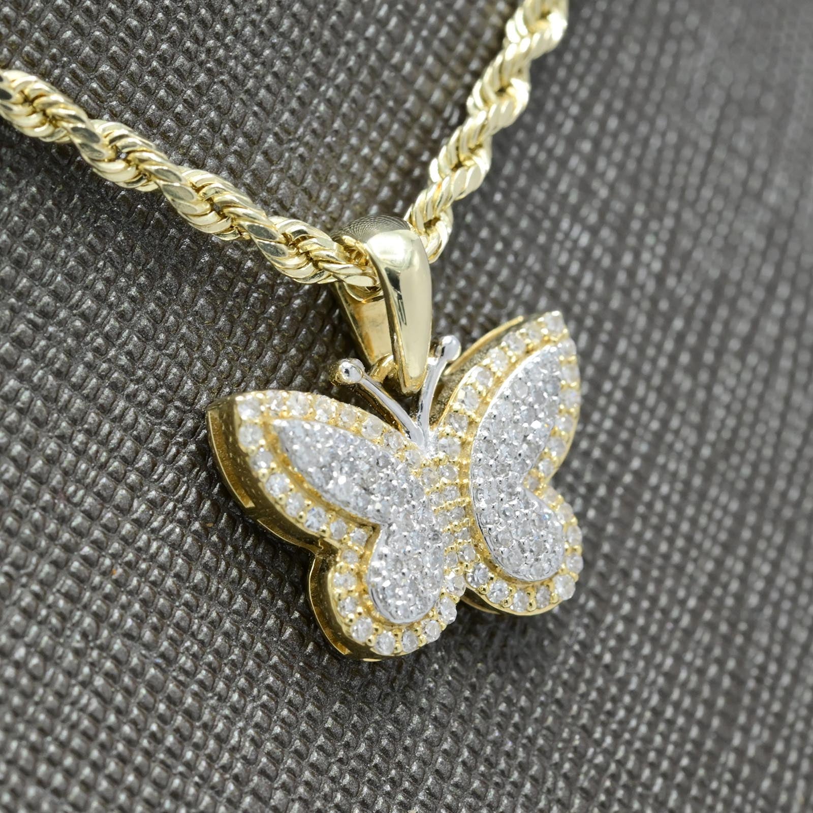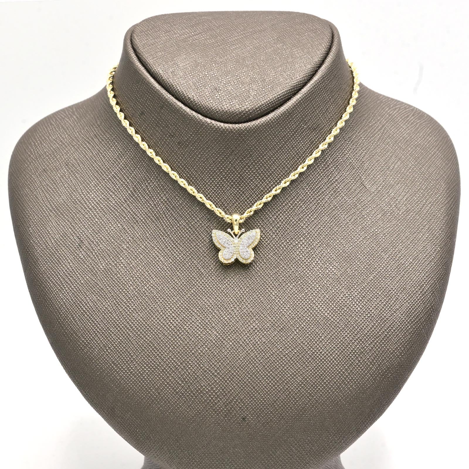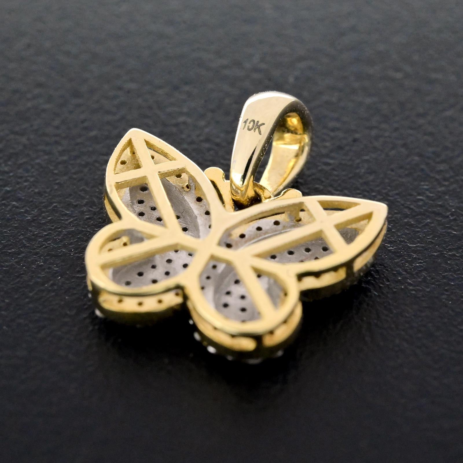Celebrate transformation with this elegant two-tone 10k gold butterfly pendant, blending yellow and white gold for contemporary visual interest. Weighing just 2.2 grams, this delicate charm features 0.35 carats of natural round diamonds that sparkle beautifully across the butterfly design. The contrasting gold tones create a modern aesthetic while the diamond accents enhance the symbol of renewal and grace. An excellent choice for those seeking a refined pendant that honors personal growth through premium craftsmanship and the sophisticated interplay of mixed metals with natural gemstone artistry.