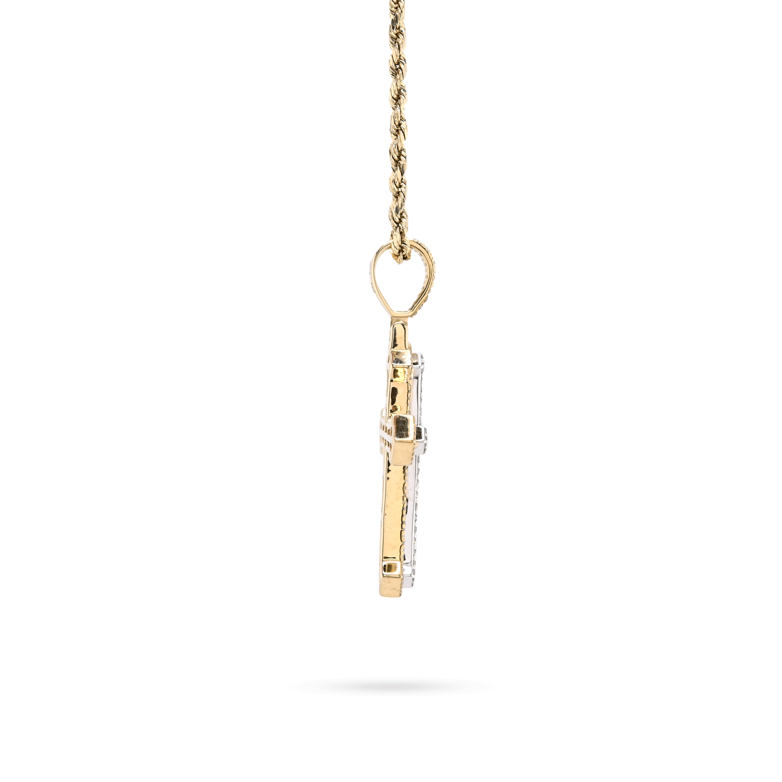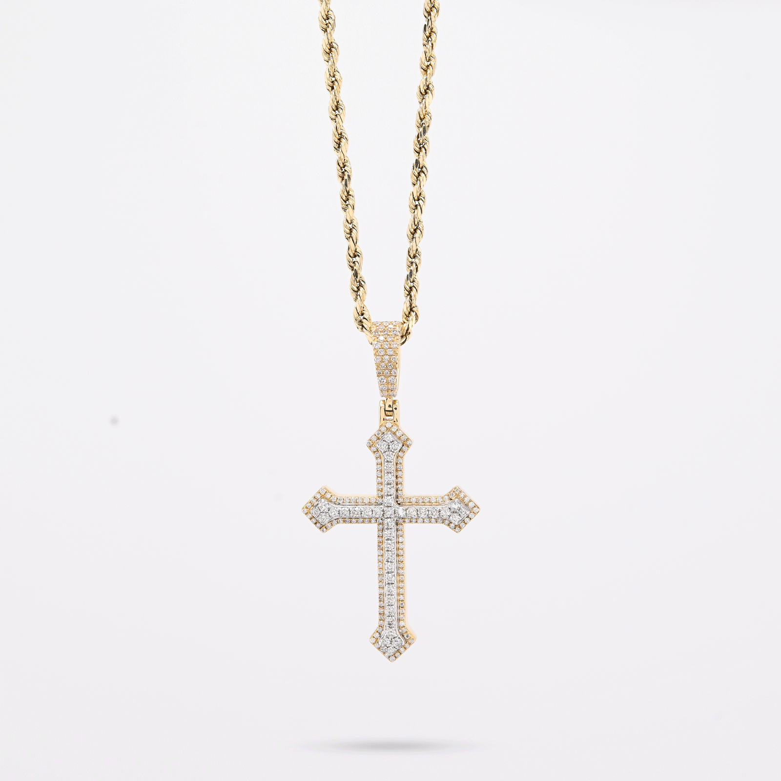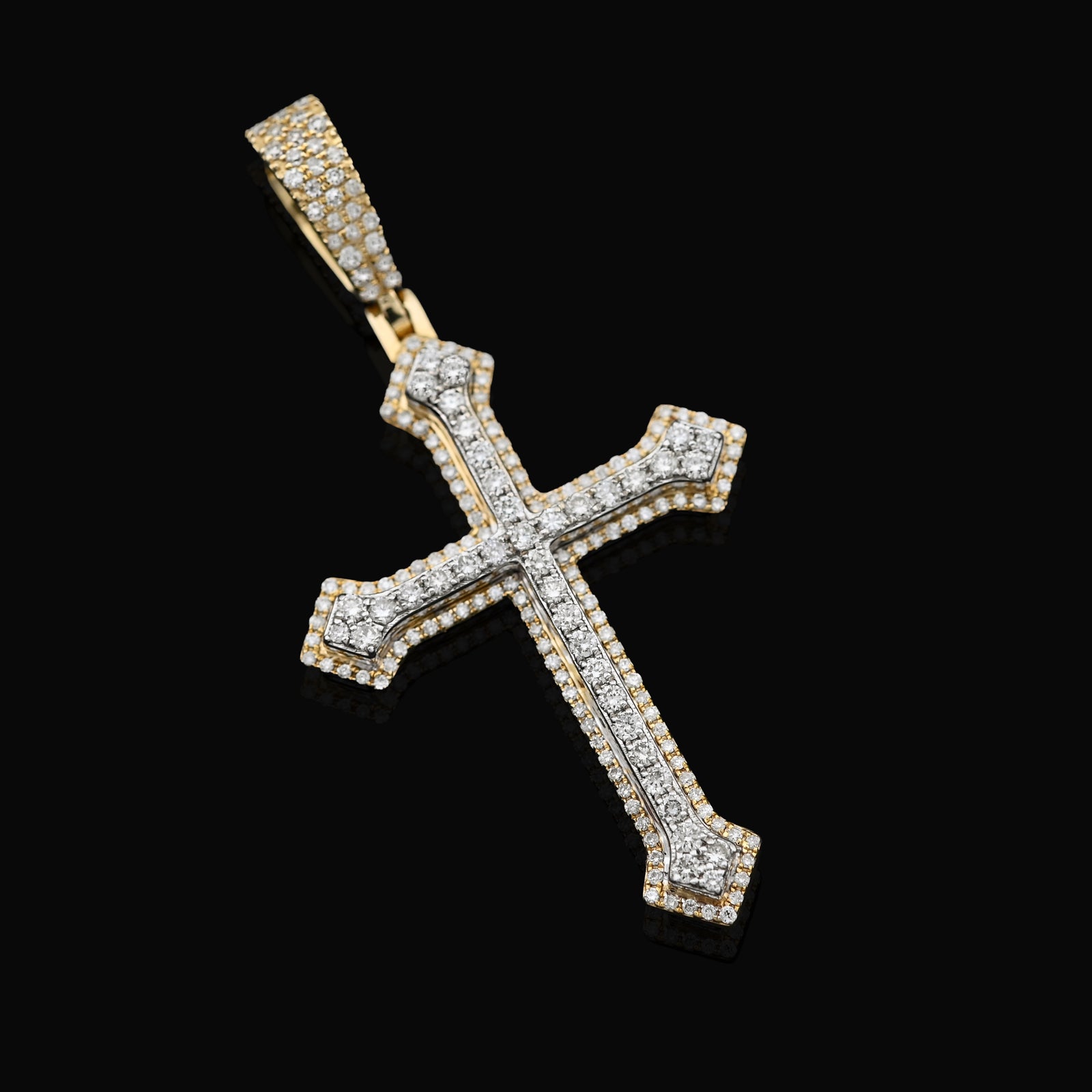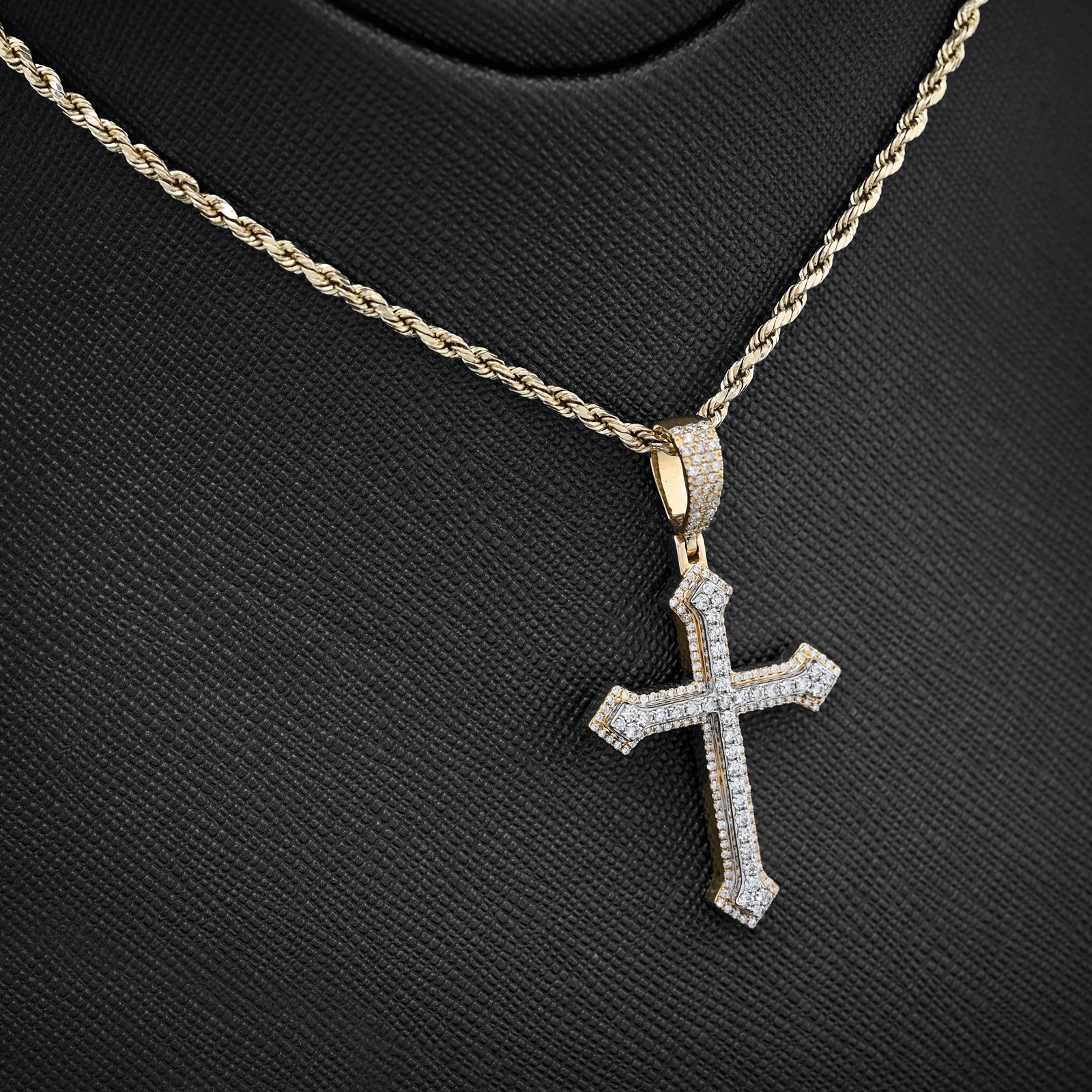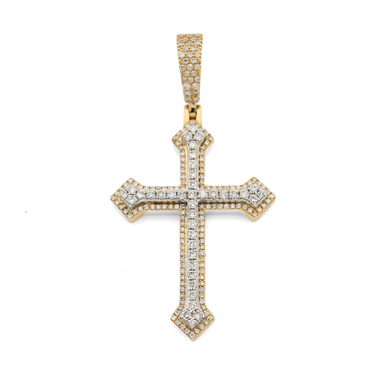 This exquisite cross pendant combines timeless elegance with contemporary sparkle. Crafted in 10k gold blending warm yellow and cool white tones, it features 0.69 carats of natural diamonds meticulously set in an iced-out design that catches light from every angle. Weighing 5.9 grams, the piece offers substantial presence while maintaining refined proportions. Perfect as a standalone statement or layered with other chains, this versatile charm celebrates faith and style with understated luxury.