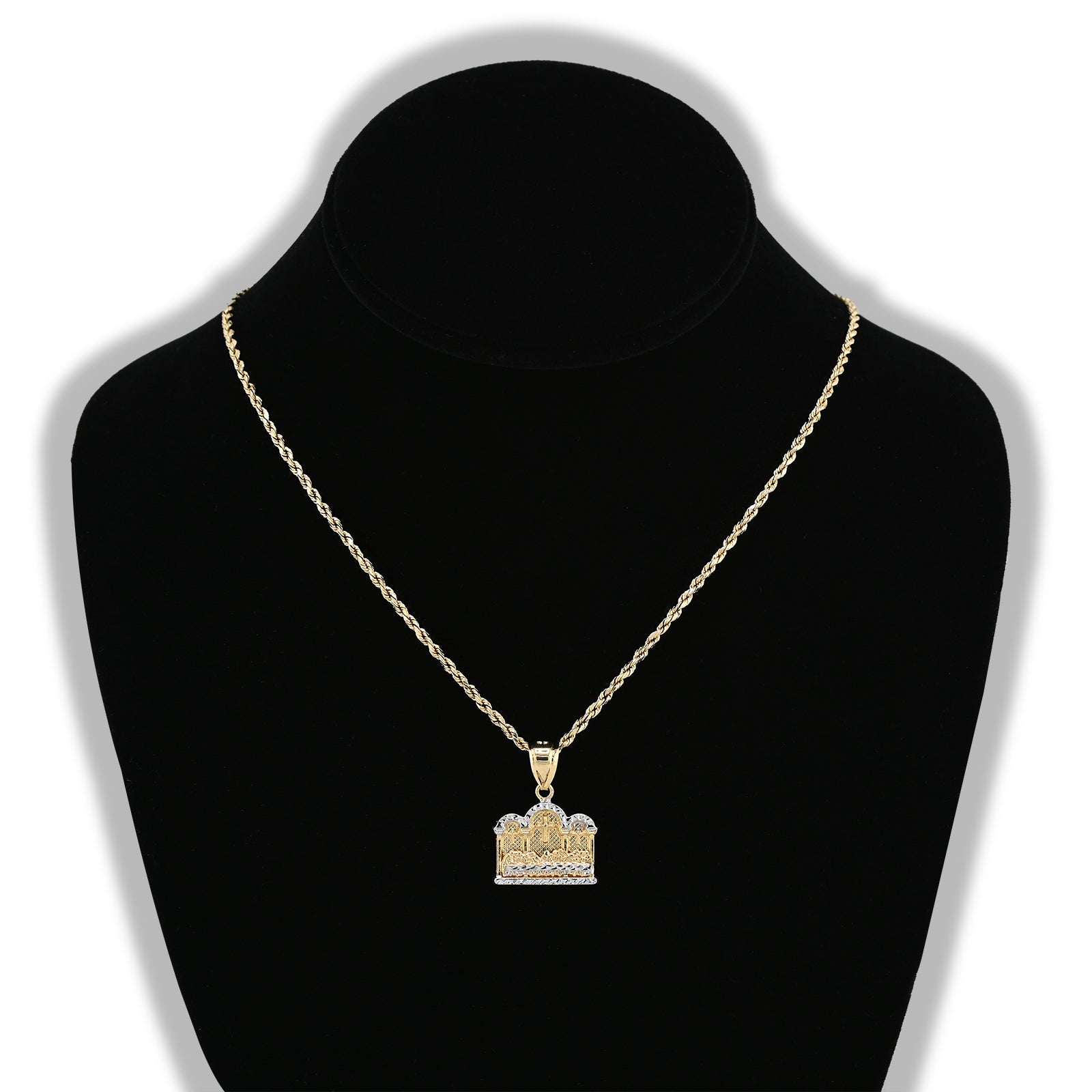 This exquisite religious pendant showcases a meticulously crafted Last Supper design in lustrous 10k yellow and white gold. The diamond-cut detailing adds refined sparkle and dimension to this meaningful charm, weighing approximately 2 grams. A sophisticated choice for men seeking to express their faith through timeless jewelry craftsmanship.