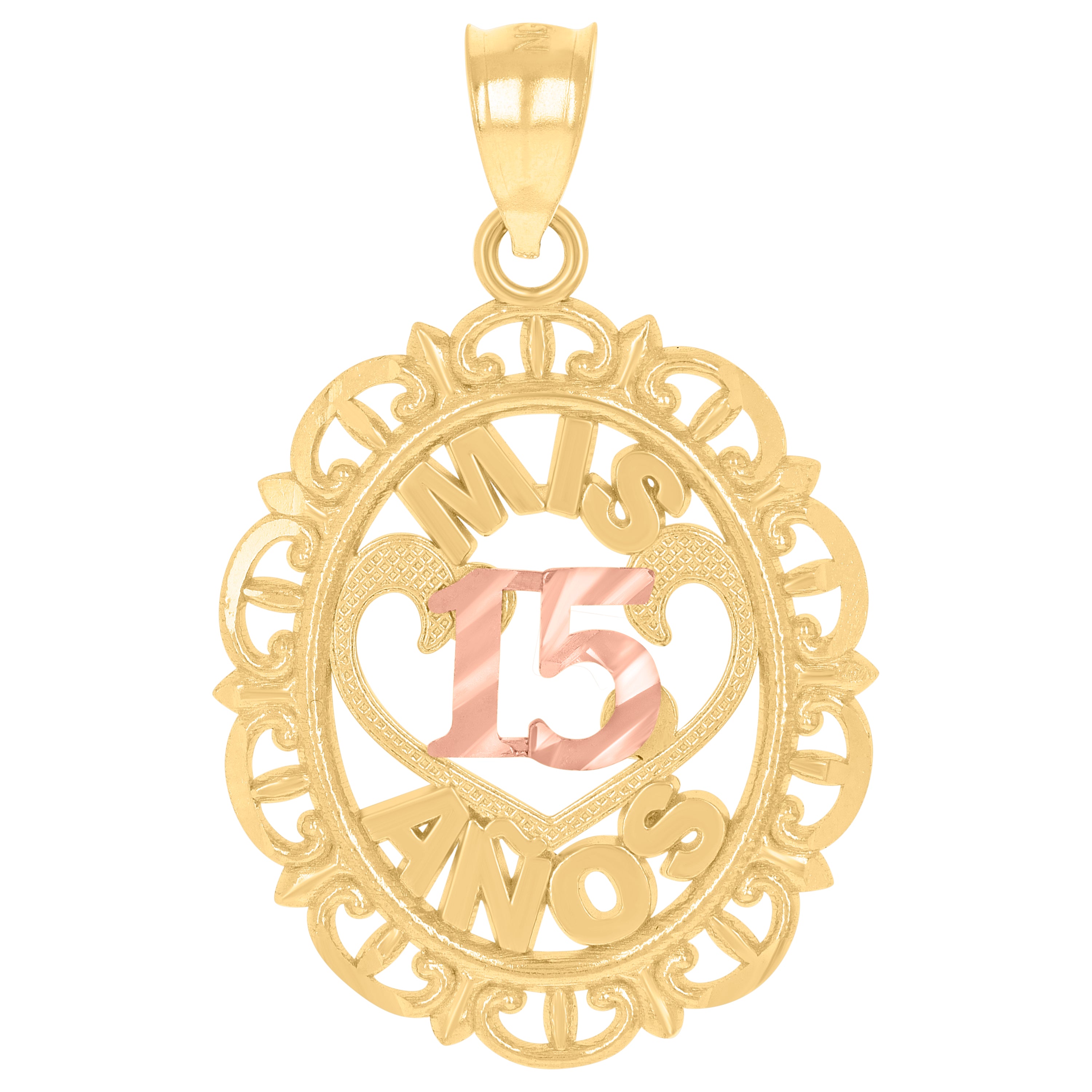 10kt Gold Tri-Color Diamond-Cut Unisex Mis 15 Anos Heart Oval Quinceanera Charm Pendant