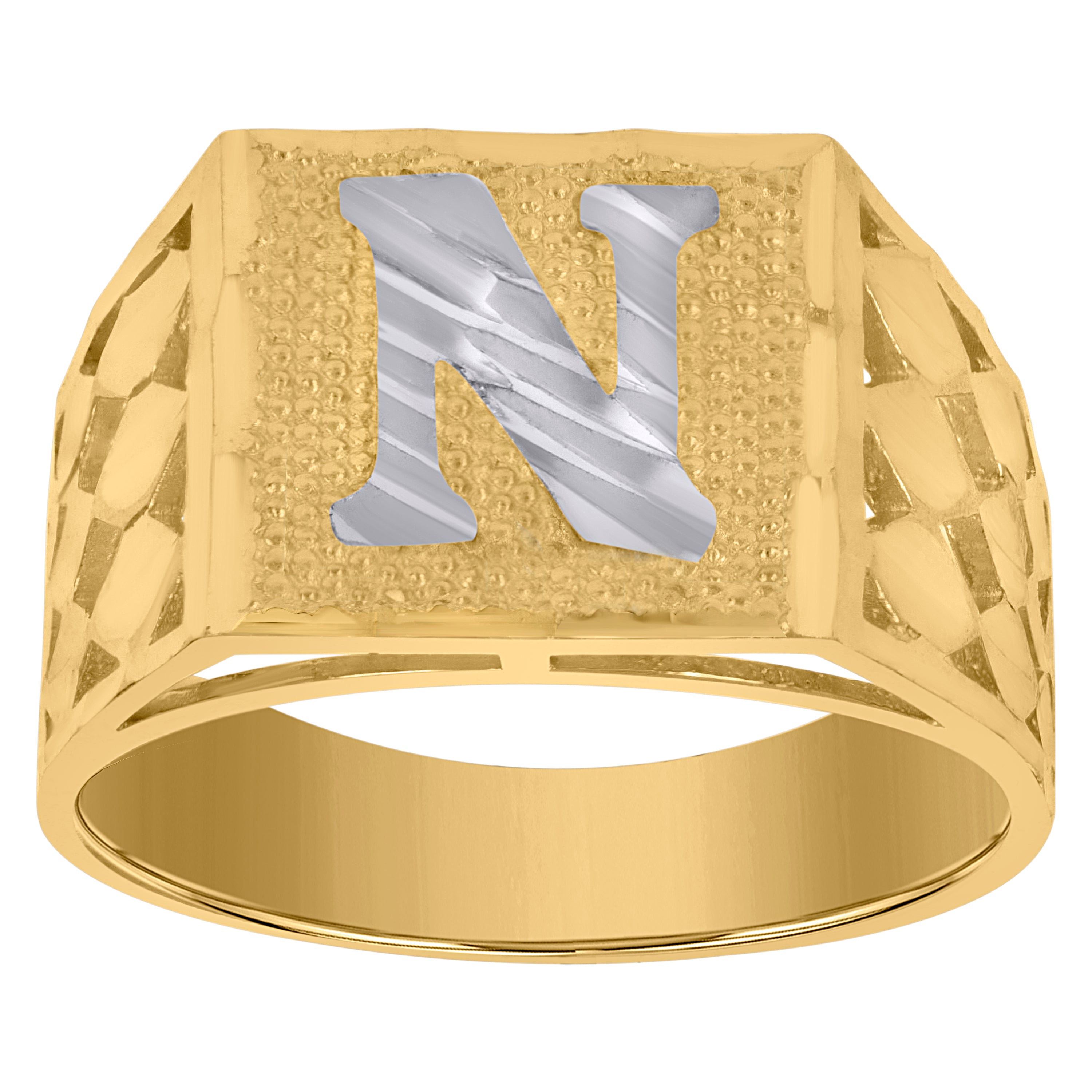 Elevate your style with this exquisite 10kt Two-Tone Gold Men's Band Ring, featuring a striking diamond-cut textured initial 'N'. Weighing 4.4 grams, this piece boasts a sophisticated finish with an 11.8MM height and 7.1MM width, designed to make a bold statement. Perfect for the modern gentleman who values personalized elegance without the sparkle of CZ.