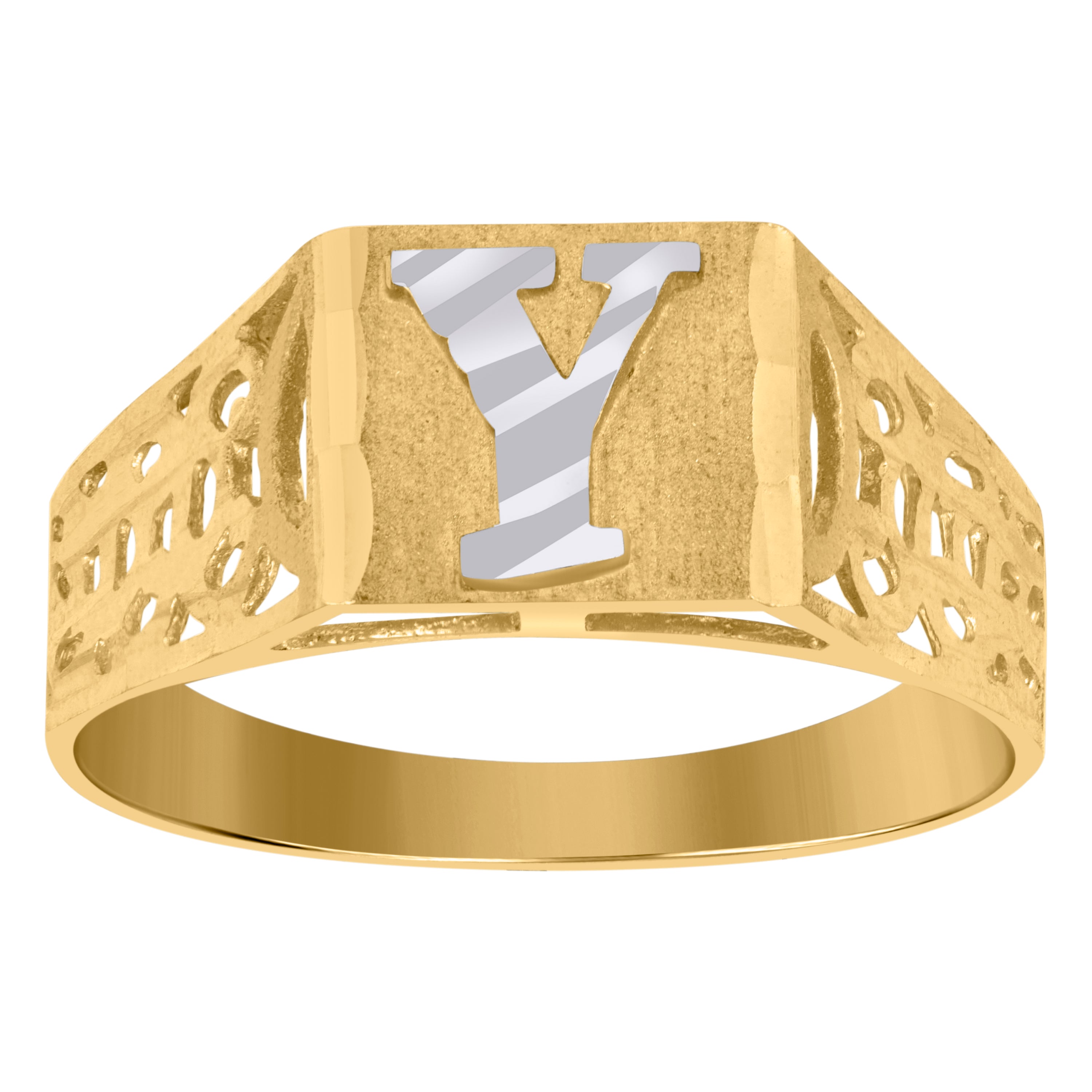 Embrace timeless elegance with our 10kt Two-Tone Gold Unisex Initial Letter Y Band Ring. Weighing a delicate 2.2 grams, this exquisite piece features a stunning diamond-cut finish that adds a touch of sophistication to any ensemble. With a height of 6.8MM and a width of 2.5MM, it offers a sleek and comfortable fit. Perfect for those who appreciate refined craftsmanship and personalized style.