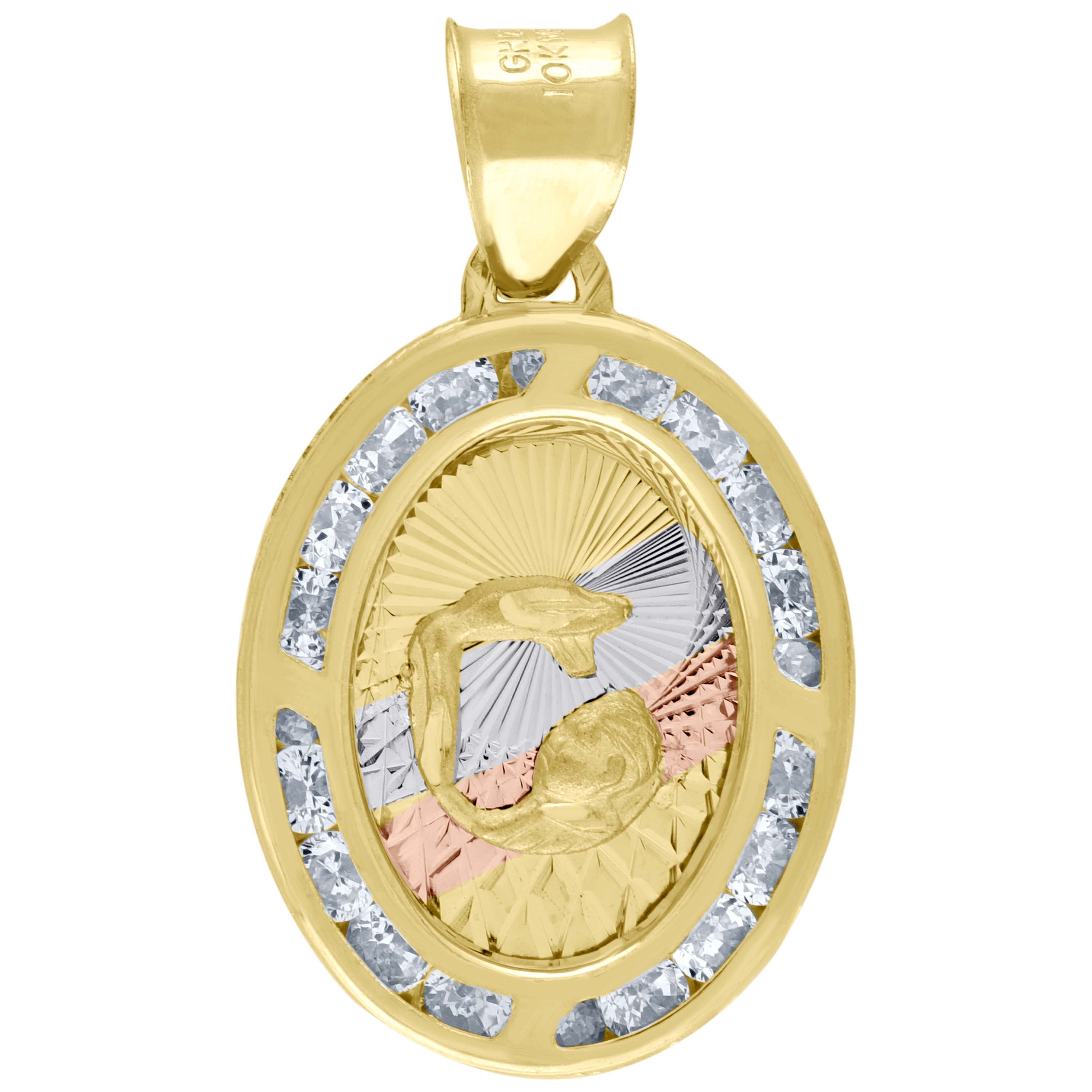 Elevate your style with our exquisite 10Kt Gold Pendant. This stunning piece, crafted from pure 10k tri-color gold, features a captivating oval charm adorned with radiant white round cubic zirconia. The diamond-cut finish adds an extra touch of brilliance, while the channel setting ensures the stones shine brightly. With a delicate weight of just 1 gram, this unisex pendant is both elegant and lightweight, making it perfect for everyday wear. Measuring 23.8MM in height and 13.7MM in width, it offers a graceful silhouette. The single bail closure provides security and ease of wear. This timeless religious charm is a testament to both faith and fashion. Perfect for any occasion, it's a must-have addition to your jewelry collection.