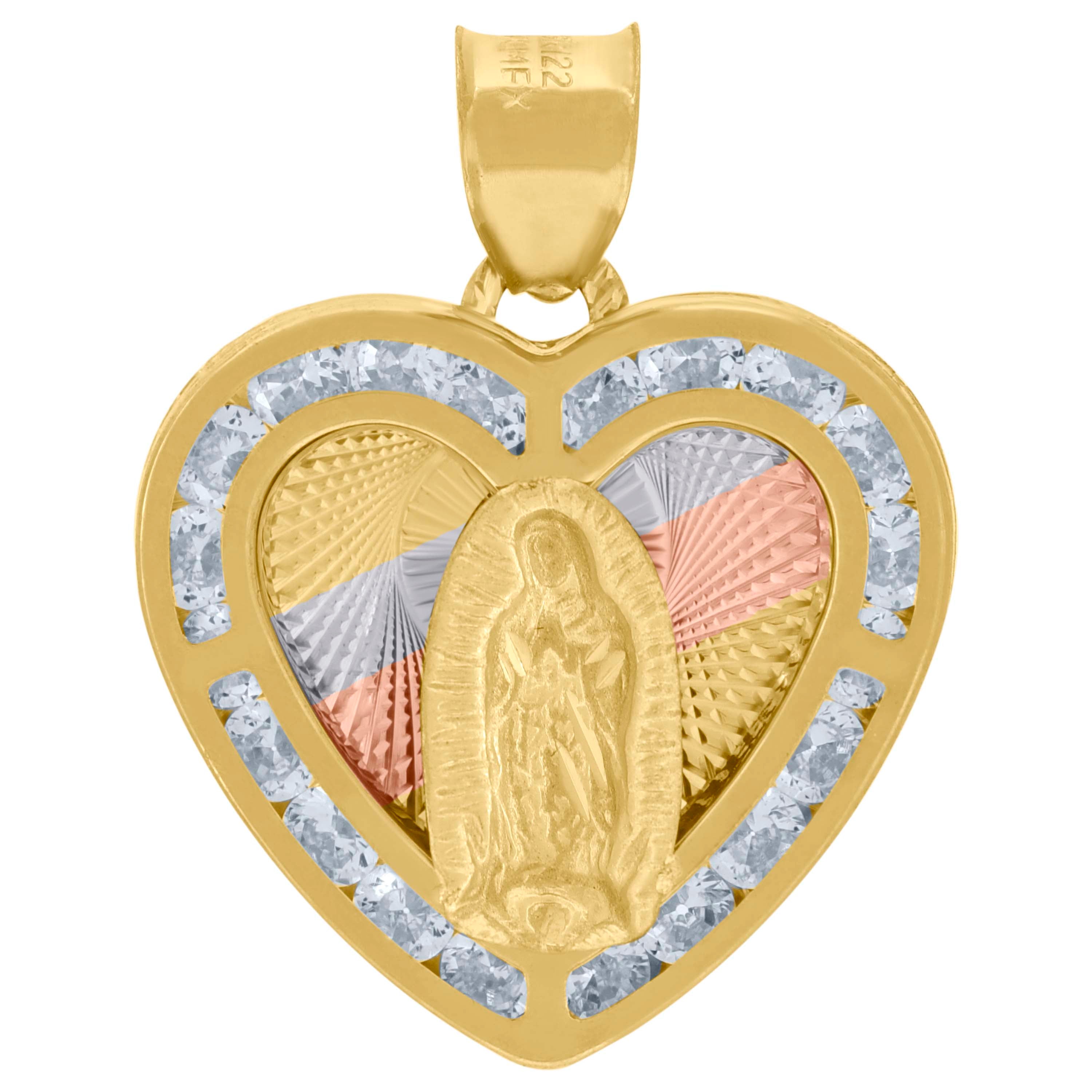 10kt Tri-Color Gold Unisex Cubic-Zirconia Diamond-Cut Lady Of Guadalupe Religious Heart Charm Pendant