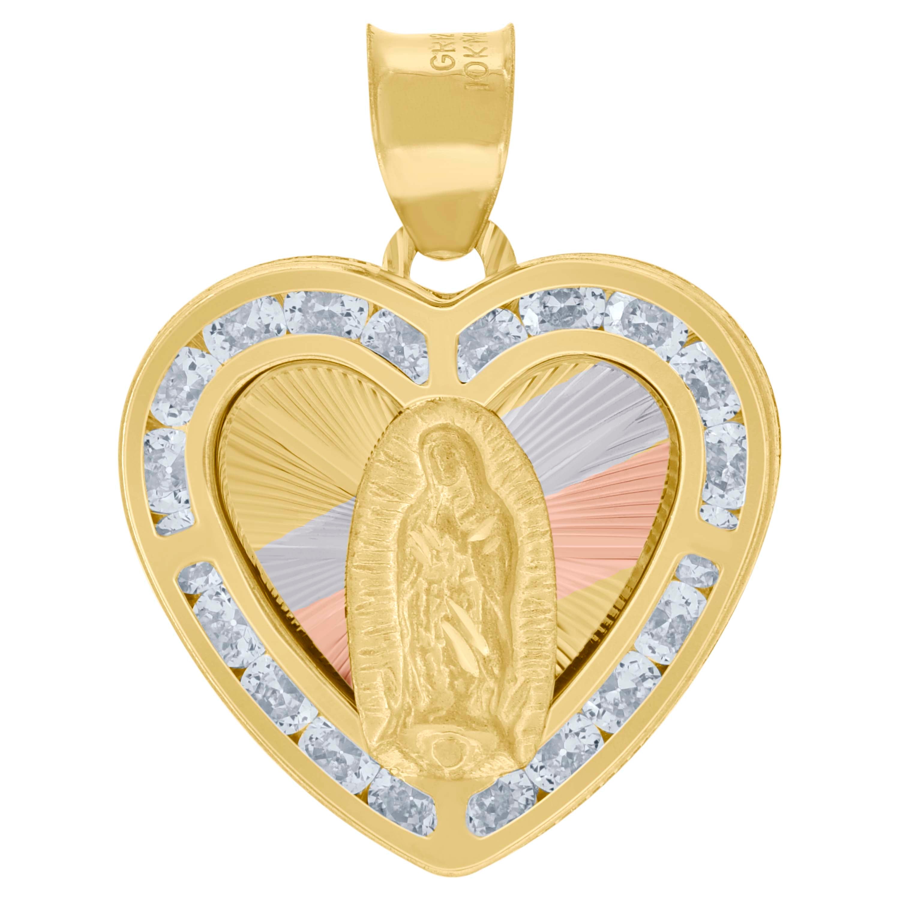 10kt Tri-Color Gold Unisex Cubic-Zirconia Textured Lady Of Guadalupe Religious Heart Charm Pendant