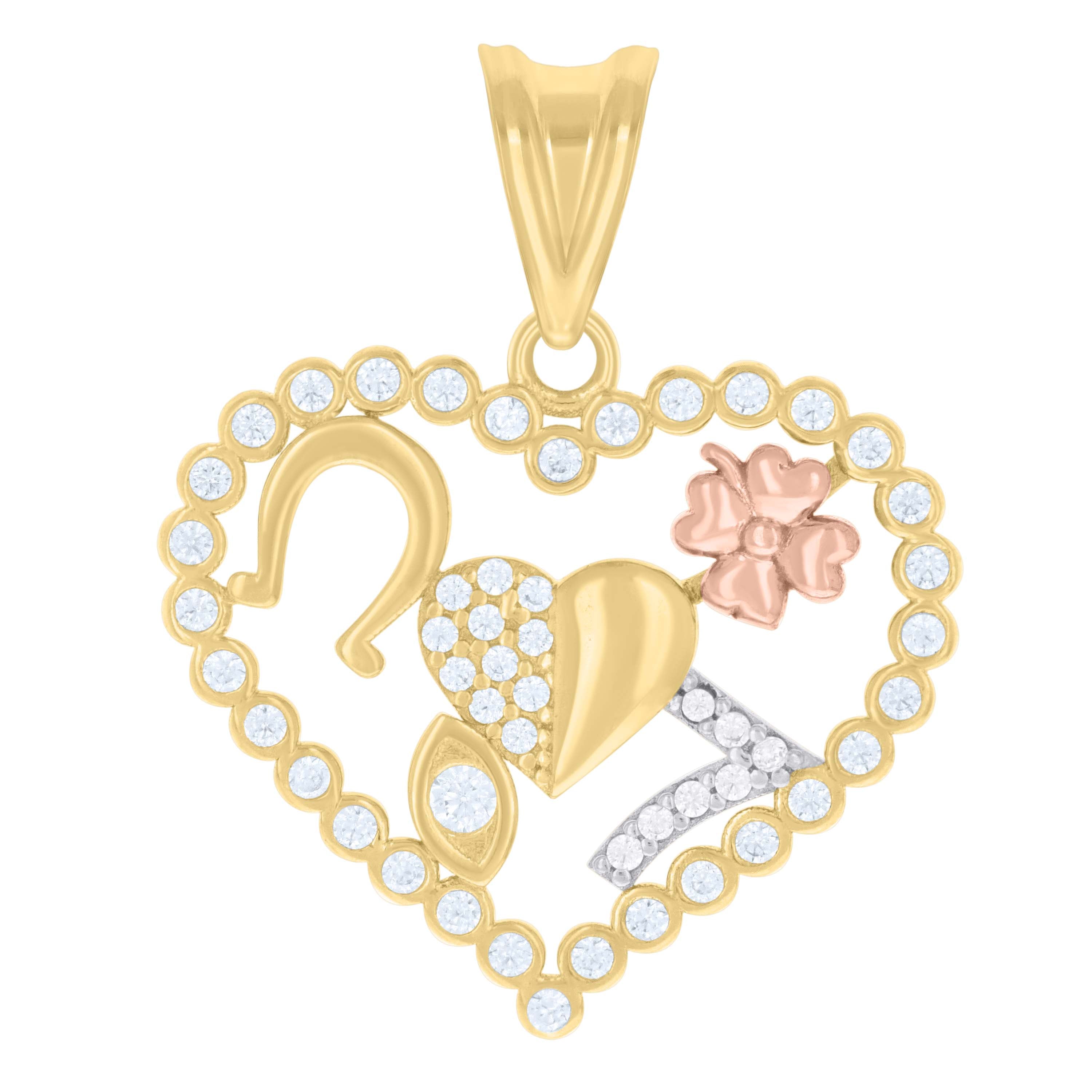 Embrace elegance and fortune with this exquisite 10Kt Real Tri-Color Gold Pendant, designed exclusively for women who appreciate fine craftsmanship and charm. Weighing a delicate 1.9 grams, this polished pendant features a harmonious blend of tri-color gold, symbolizing unity and diversity. The intricate design includes a Cubic-Zirconia-studded horseshoe, an evil eye, a 7, a clover, and a heart, each representing good luck and protection.