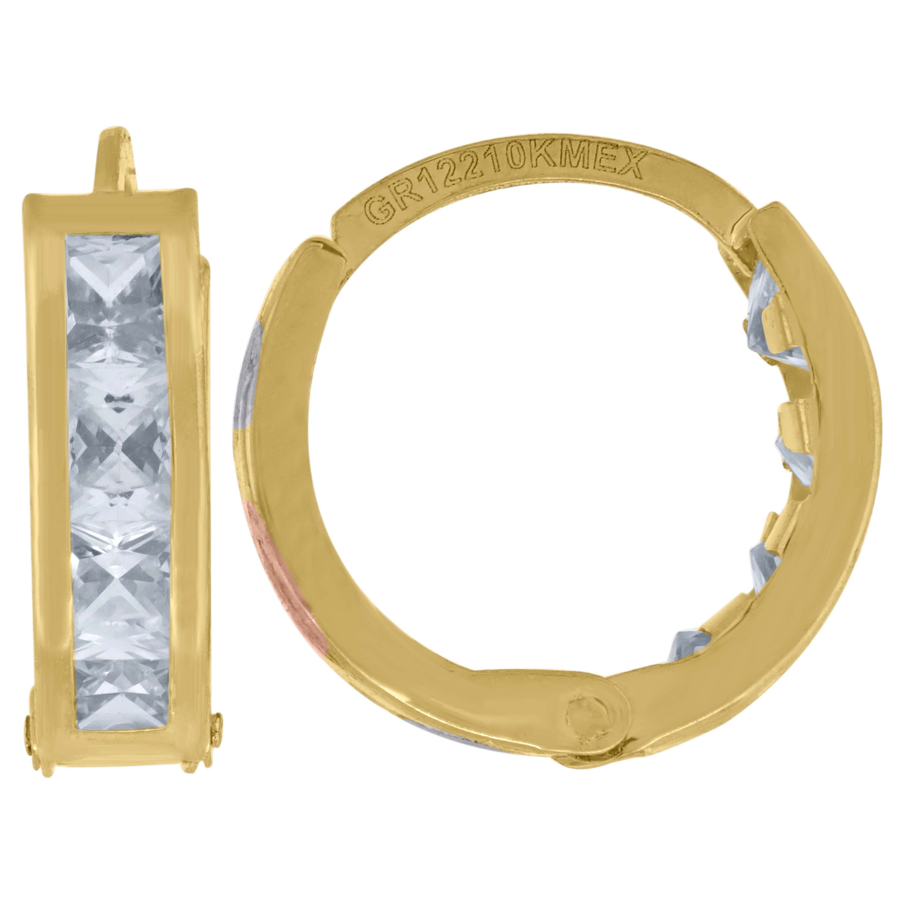 Experience elegance with our 10Kt Gold Hoop Earrings, a stunning blend of classic and contemporary design. Crafted in pure 10k tri-color gold, these earrings feature exquisite princess-cut white cubic zirconia set in a polished channel, adding a touch of sparkle to any ensemble. Lightweight at 1.3 grams and designed for endless comfort, their dimensions of 13.3MM in height and 10.2MM in width offer a perfect balance of sophistication and wearability. Ideal for any occasion, these huggie hoops are a must-have accessory for the modern woman seeking timeless allure and refined style.
