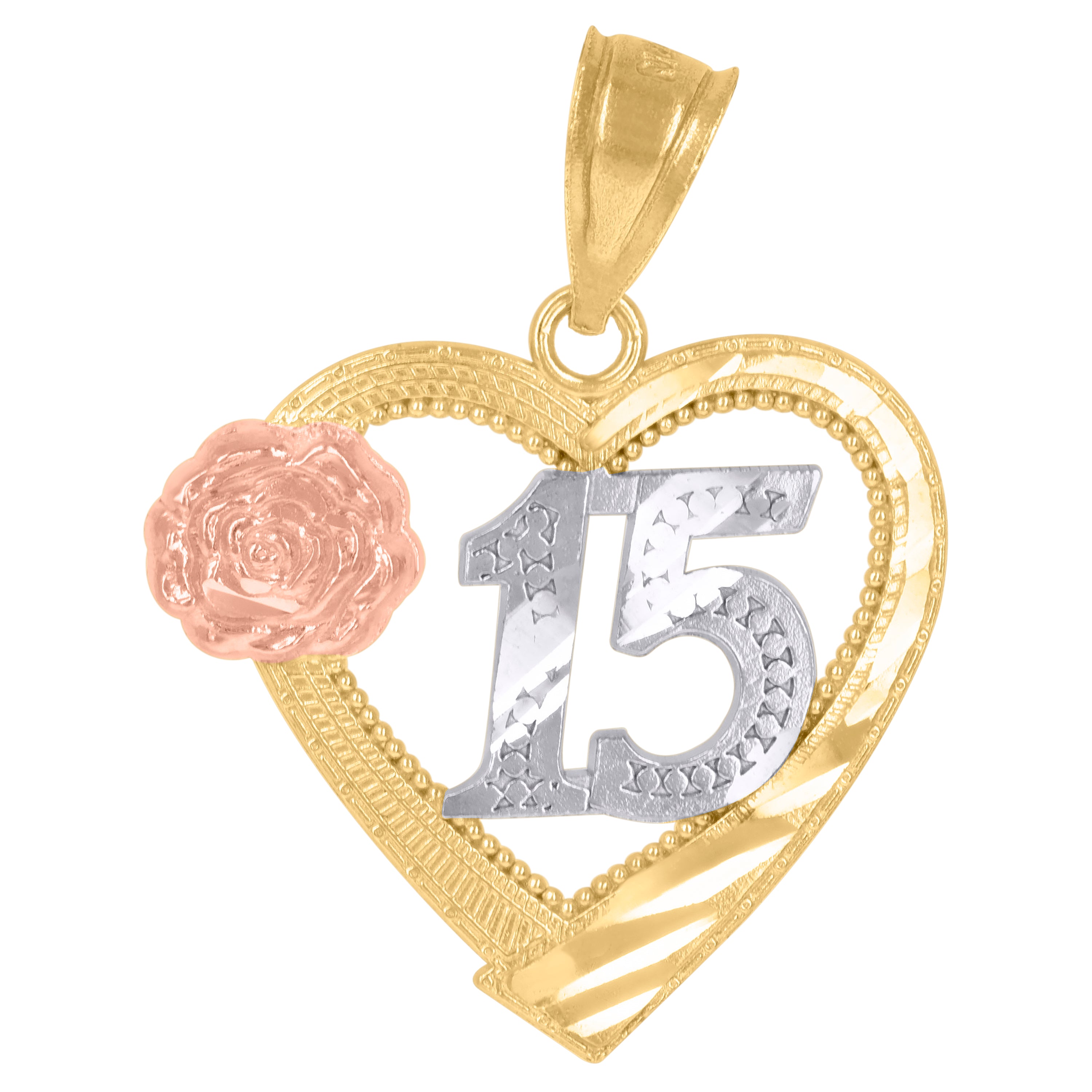 Introducing the exquisite 10kt Tri-Color Gold Women's Textured Sweet 15 Años Quinceañera Heart Charm Pendant by SB Jewelers, a stunning piece that celebrates the beauty and elegance of a young woman stepping into womanhood. This charming pendant is crafted with 10-karat tri-color gold, showcasing a harmonious blend of white, yellow, and rose gold hues, each symbolizing a unique element of her journey.