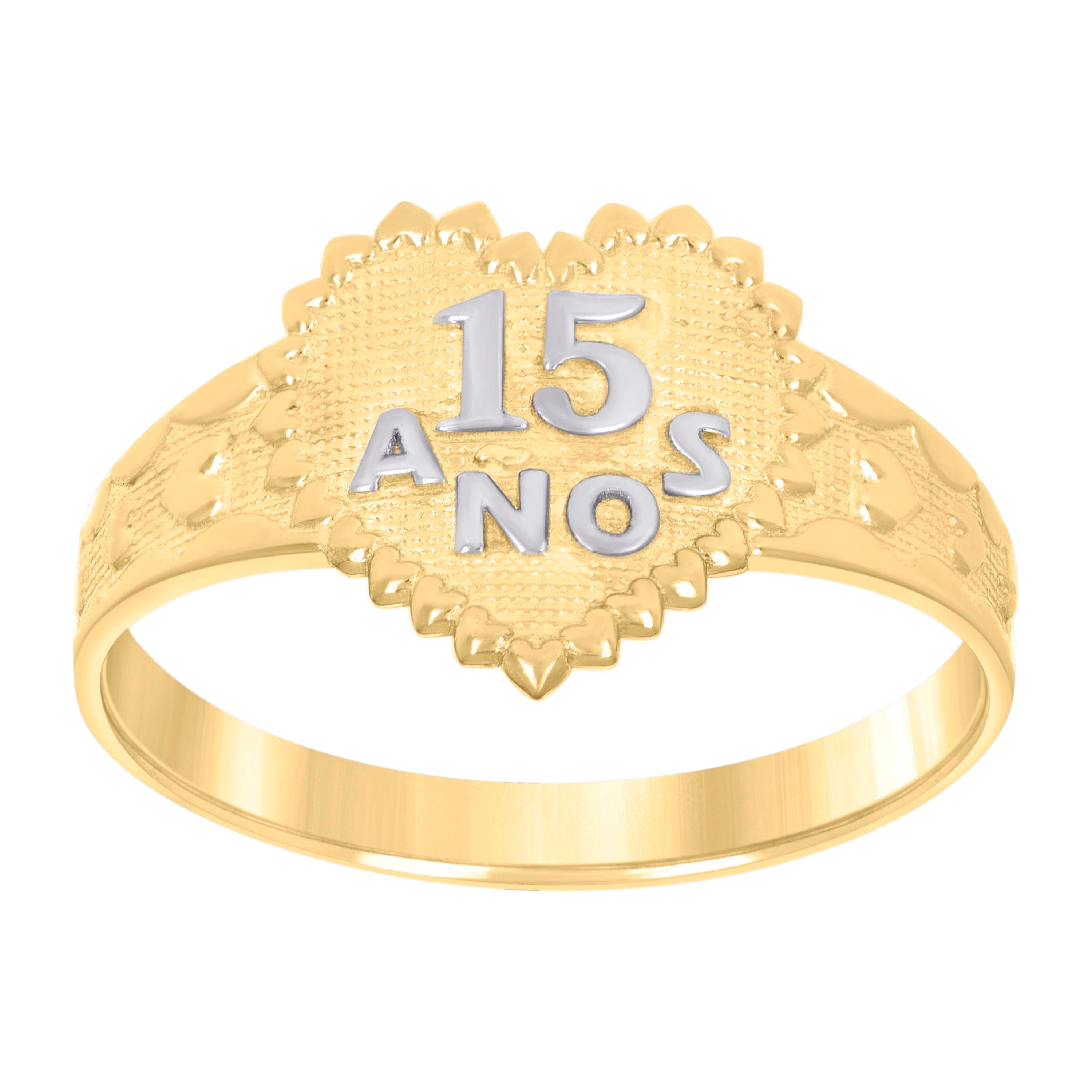 Celebrate a special milestone with this exquisite 10kt Two-Tone Gold Women's Textured 15 Anos Heart Band Ring. Masterfully crafted, this elegant piece weighs 1.9 grams and features a beautiful textured finish that enhances its unique charm. The ring's bold design boasts a height of 12MM and a width of 19.1MM, offering a sophisticated yet youthful appeal. Perfect for marking the unforgettable journey of turning fifteen, this heart band ring is a timeless treasure she'll cherish forever.