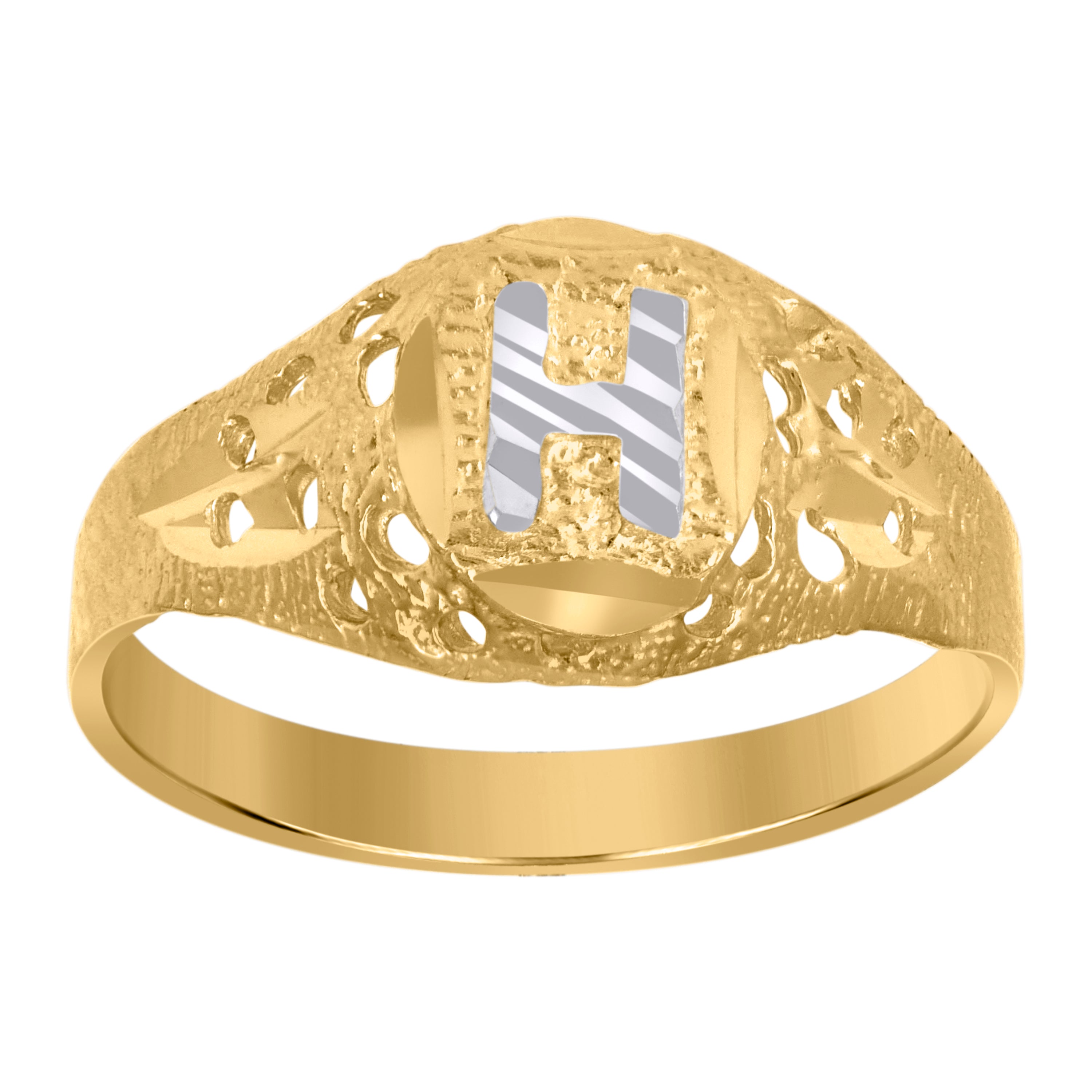 Embrace timeless elegance with our 10Kt Gold Initial "H" Letter Ring. Crafted in radiant, real two-tone gold, this men's band ring showcases a diamond-cut textured design in a classic oval shape, perfect for adding a touch of personalization to any outfit. Weighing just 1.2 grams, this delicate piece is designed for a baby's gentle hands. The warm yellow and pristine white hues beautifully complement each other, offering a versatile accessory that suits any occasion. With a height of 7.7MM and a width of 6.7MM, this ring offers a sleek, understated profile without the need for CZ embellishments. Celebrate individuality with this charming and sophisticated jewelry piece.