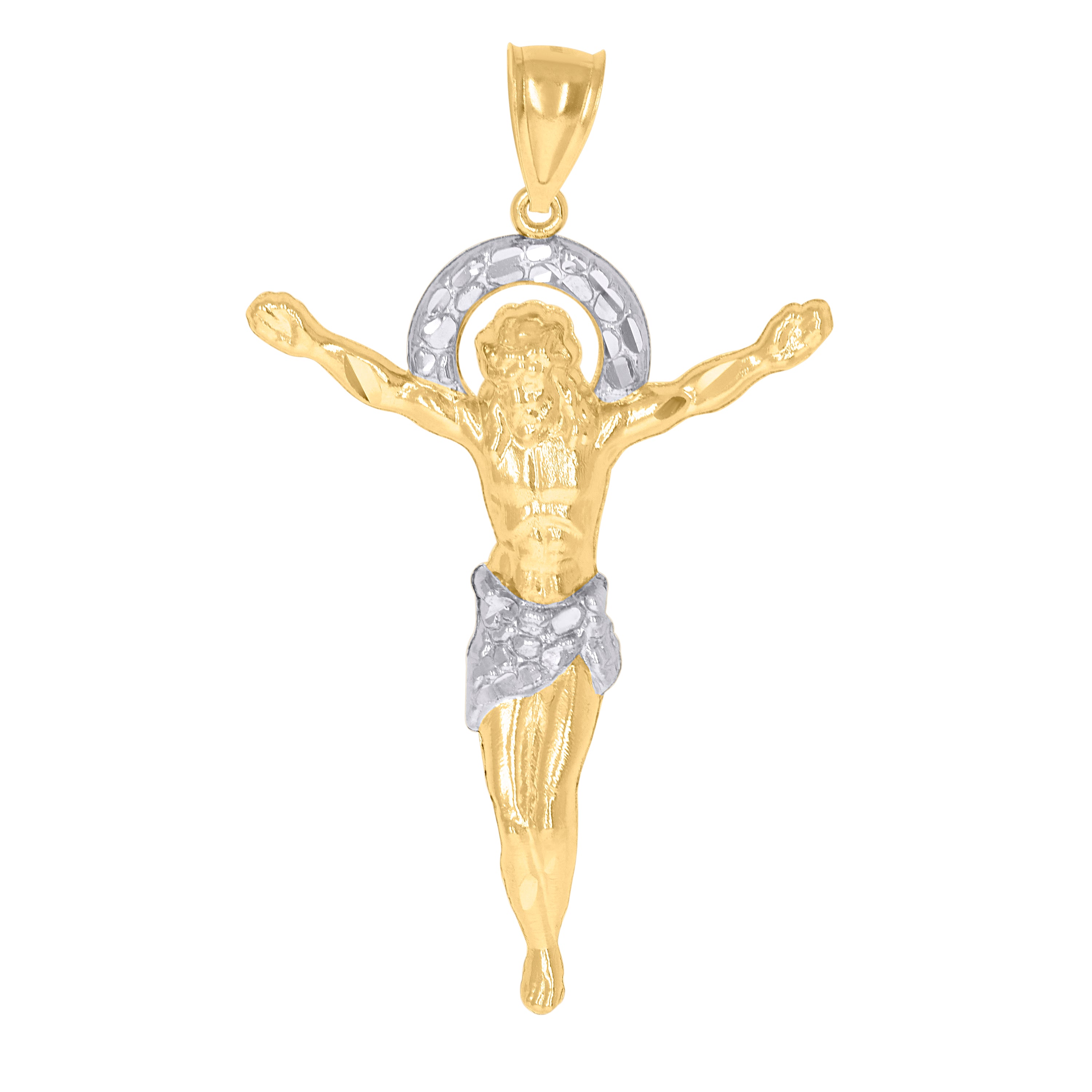 Elevate your style with this exquisite 10kt Two-Tone Gold Men's Textured Crucifix Pendant, weighing 5.3 grams. This striking piece features a distinctive nugget finish that beautifully complements its religious significance. Measuring 68MM in height and 38.8MM in width, it offers a bold presence. Crafted without CZ stones, this pendant showcases pure elegance. The single bail closure ensures a secure fit, making it a perfect addition to any jewelry collection. Embrace timeless faith and fashion with this captivating accessory.