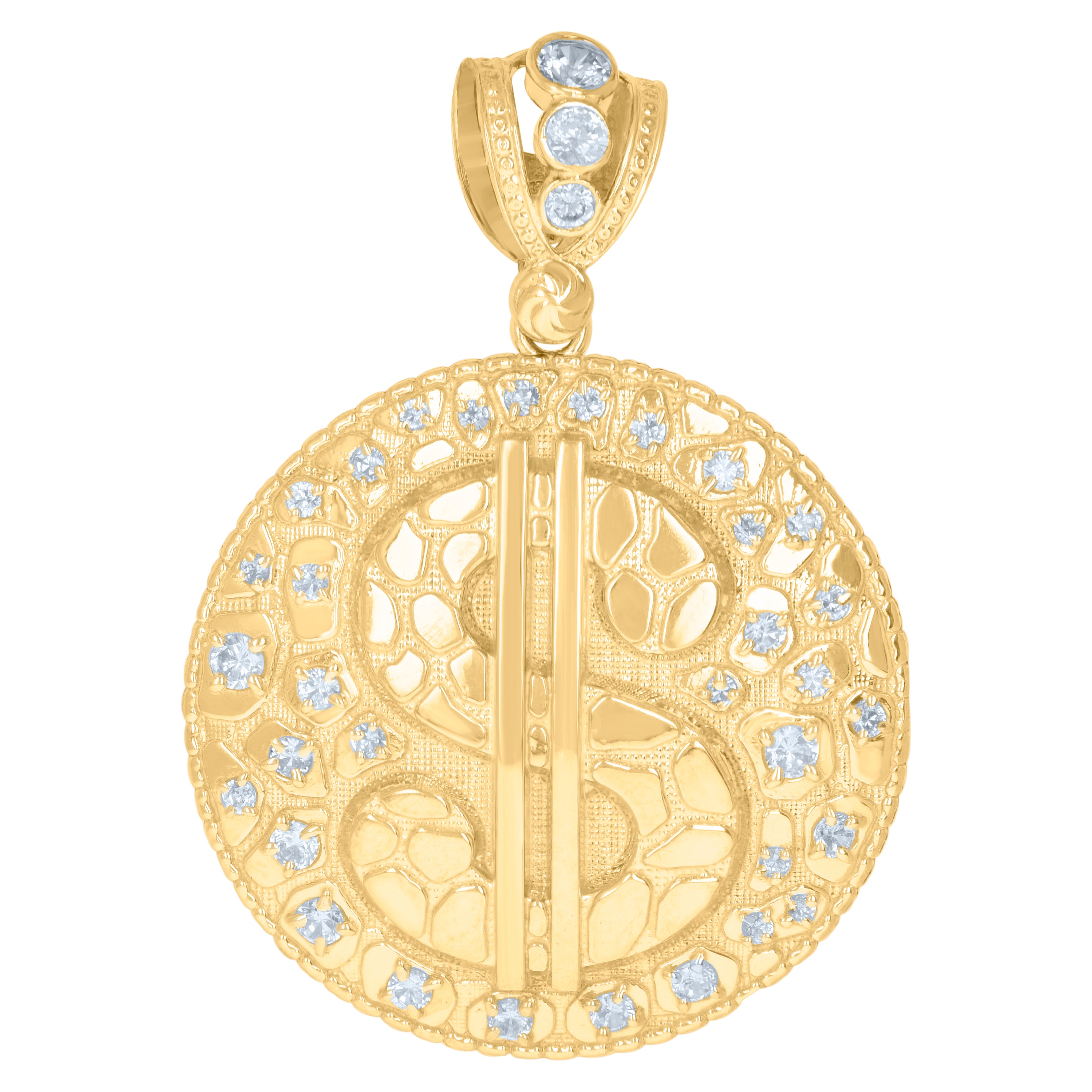 Elevate your style with this 10kt Yellow Gold Men's Cubic-Zirconia Dollar Sign Charm Pendant. Weighing 8.7 grams, this polished piece exudes luxury and sophistication. The pendant features dazzling white round cubic-zirconia stones set in secure prong settings that catch the light beautifully. Measuring 51.9mm in height and 36.5mm in width, this bold accessory is finished with a single bail for easy attachment to your favorite chain. Make a statement with this unique symbol of prosperity and success.