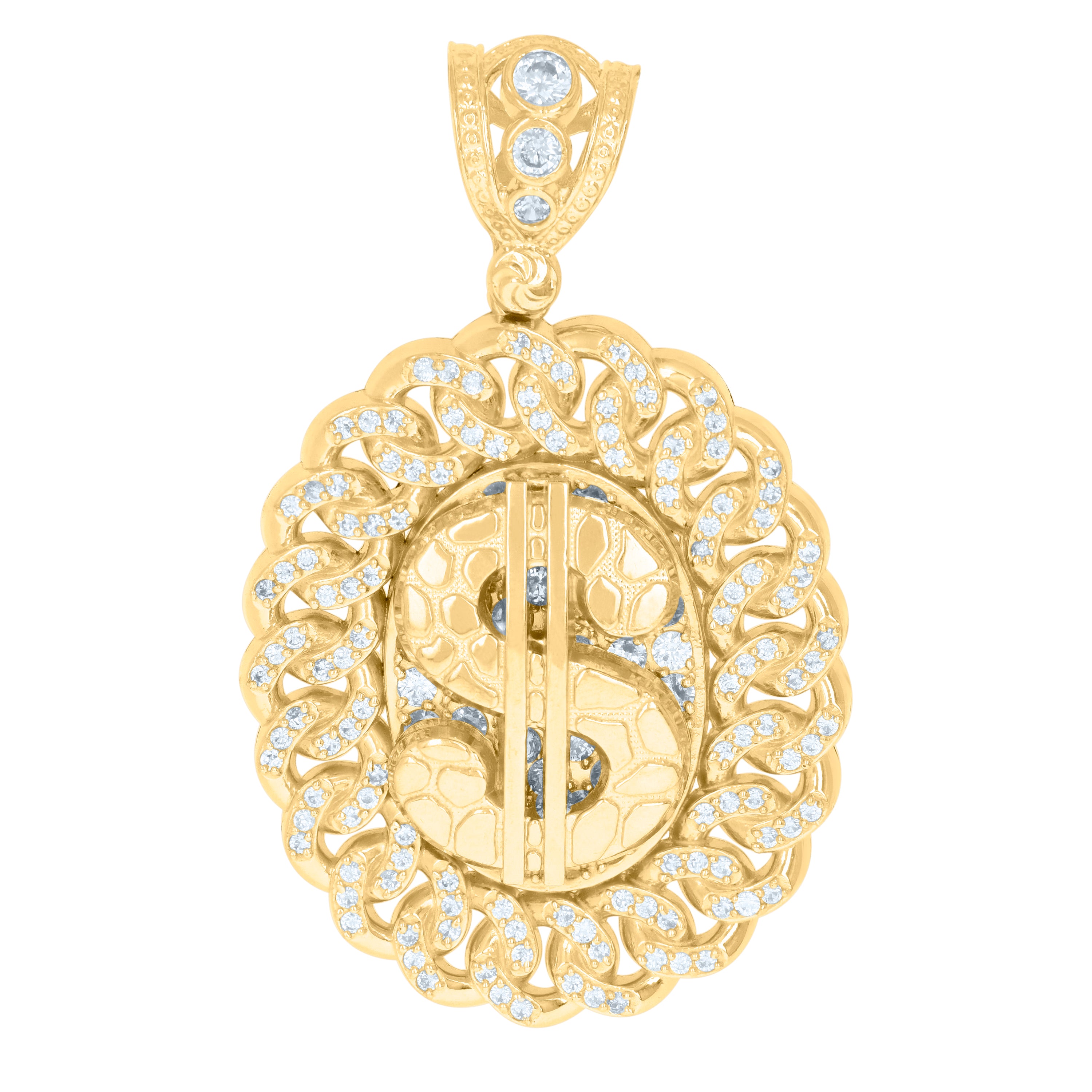 Embrace opulence with this 10kt Yellow Gold Men's Medallion Pendant, featuring a striking Cuban Link design adorned with a dazzling Dollar Sign encrusted in white, round prong-set cubic zirconia. Weighing 17.7 grams, this polished masterpiece stands out with its substantial dimensions of 63.8MM in height and 38.4MM in width, secured by a reliable single bail closure. A symbol of prosperity, this pendant is perfect for those who appreciate bold elegance.