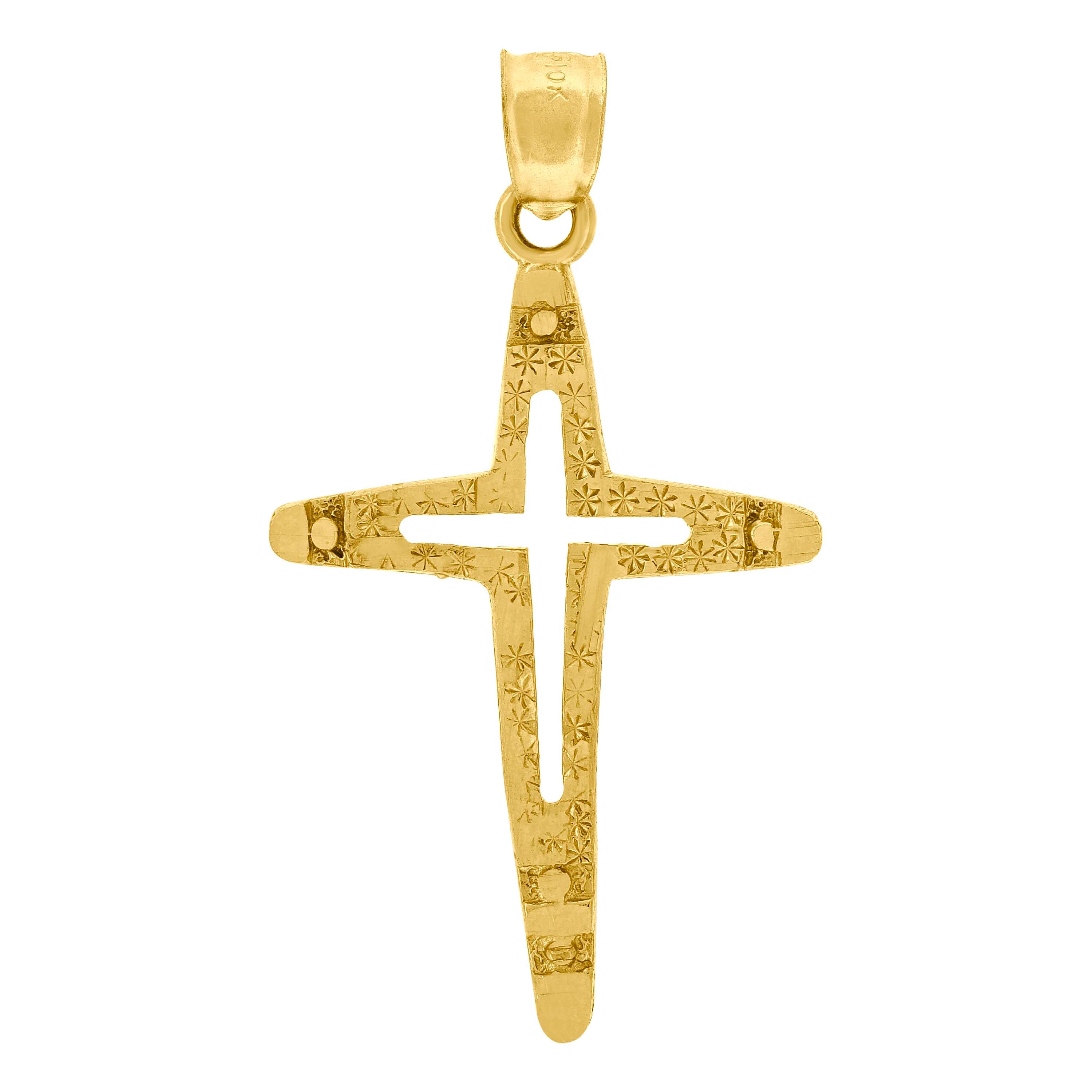 Elevate your style with this exquisite 10Kt Gold Pendant, a symbol of elegance and faith. Crafted from genuine 10kt yellow gold, this unisex textured cross charm combines timeless design with contemporary flair. Weighing just 1.2 grams, it's lightweight yet robust, perfect for daily wear. The pendant's rich yellow hue and meticulous textured finish exude sophistication, making it a versatile addition to any jewelry collection. Featuring a single bail closure, it hangs gracefully from any chain of your choice. This piece, without any cubic zirconia, highlights the pure beauty of real gold, suitable for both men and women seeking a touch of luxury. Embrace a piece that speaks to your style and spirituality.