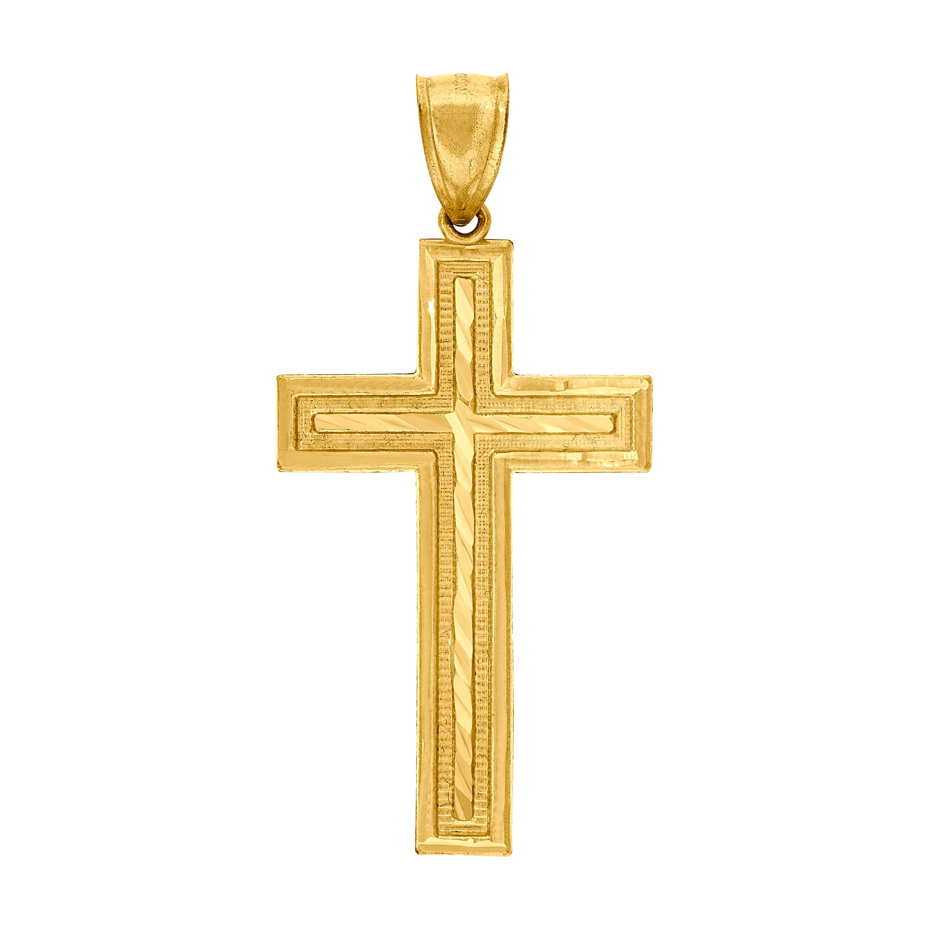 Elevate your elegance with this exquisite 10Kt Gold Pendant, a perfect blend of sophistication and spirituality. Crafted from pure 10kt real yellow gold, this unisex diamond-cut cross charm is a testament to timeless design and quality. Weighing just 3 grams, it offers a luxurious feel without being overly heavy. The pendant features a textured finish that enhances its luminous yellow color, making it a standout piece for any occasion. With dimensions of 55.3mm in height and 26.6mm in width, it strikes the perfect balance between subtlety and statement. The single bail closure ensures it sits elegantly on any chain. Whether you're dressing up for a formal event or adding a touch of class to your everyday attire, this religious charm is a versatile addition to any jewelry collection.